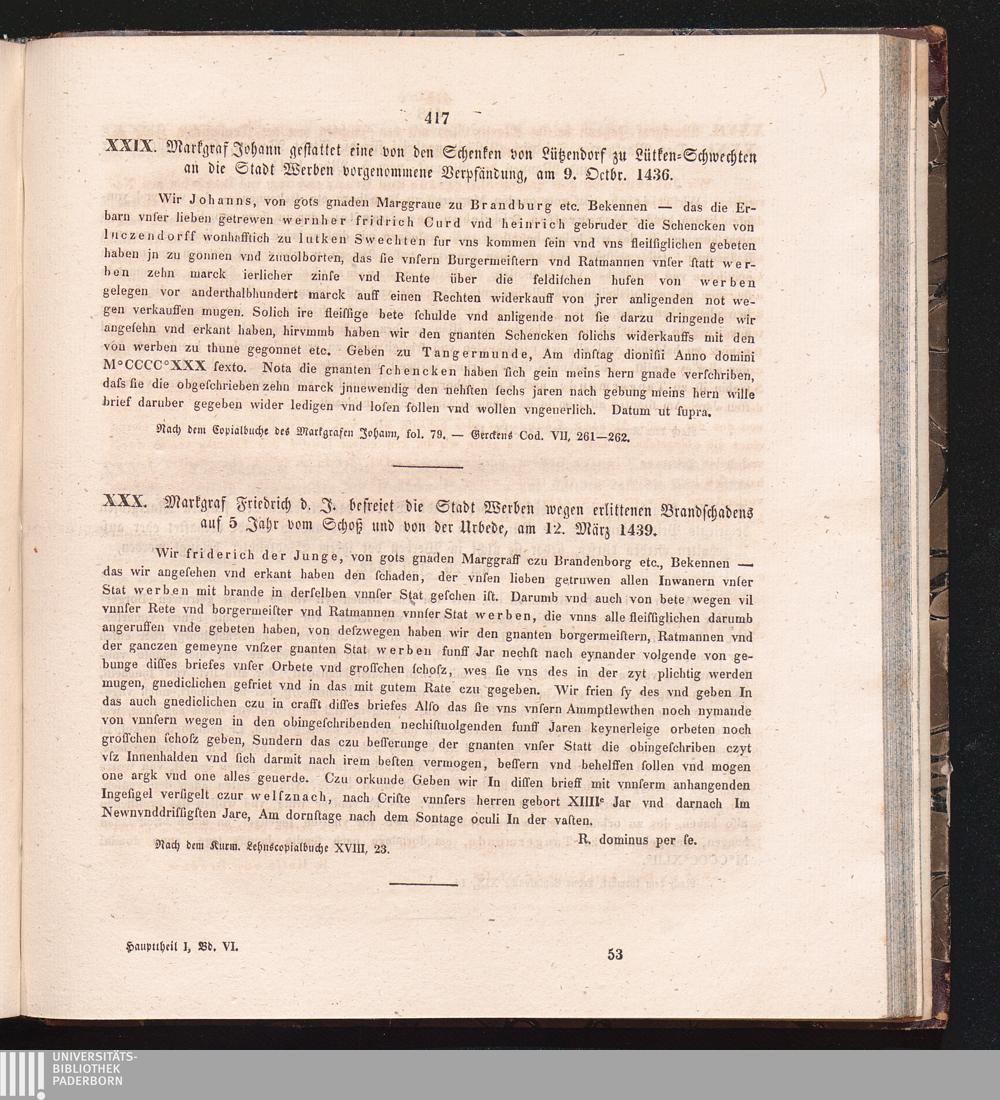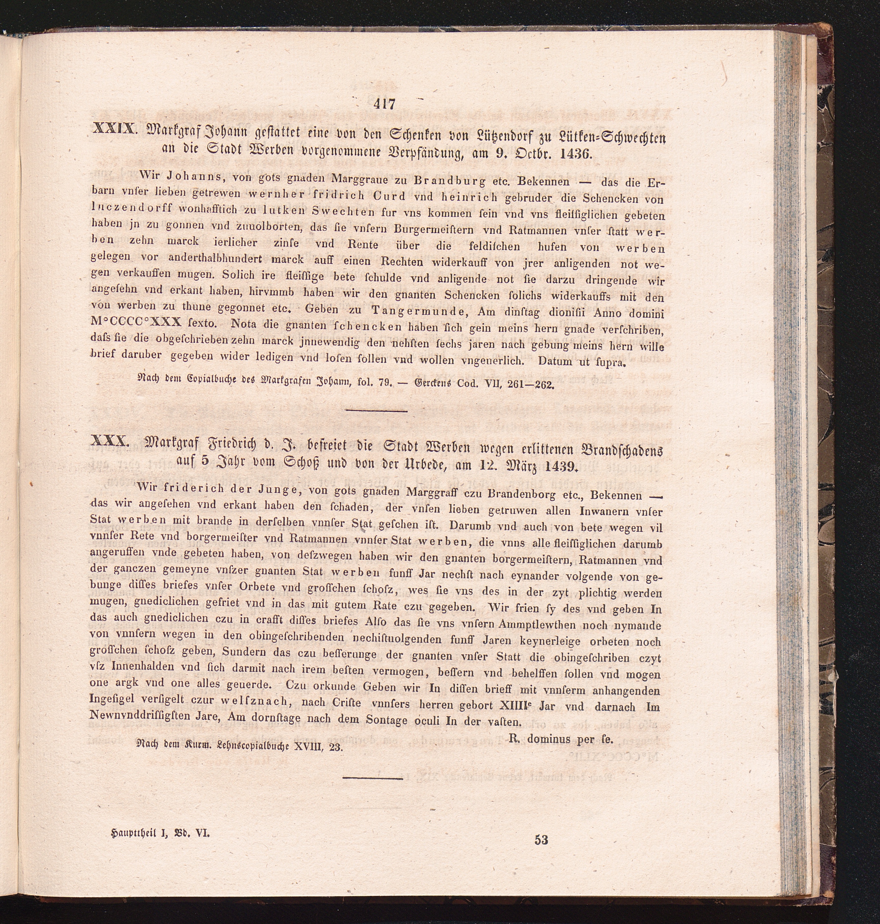 XXX. Markgraf Friedrich d. J. befreiet die Stadt Werben wegen erlittenen Brandschadens[...]