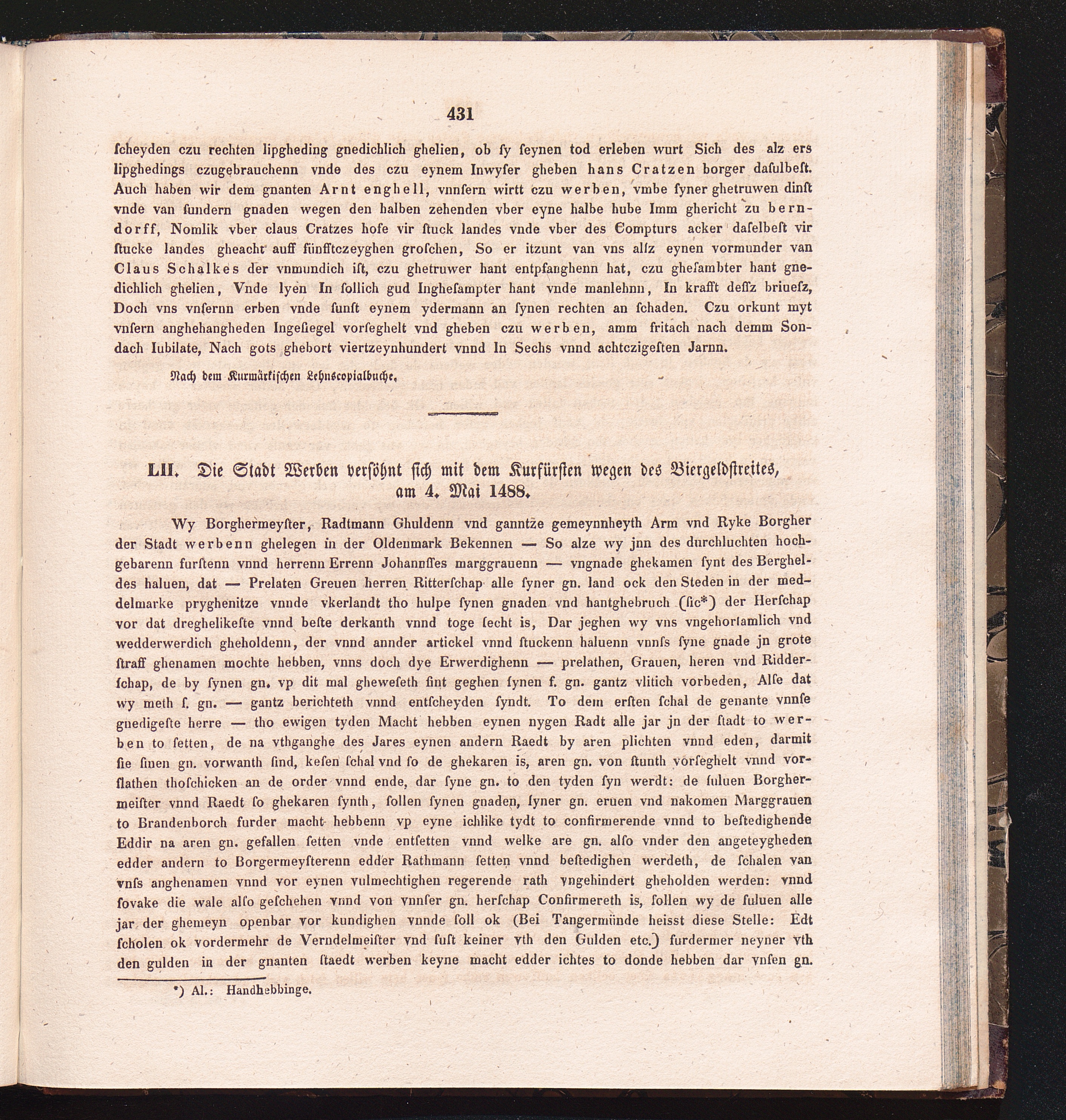 LII. Die Stadt Werben versöhnt sich mit dem Kurfürsten wegen des Biergeldstreites,[...]