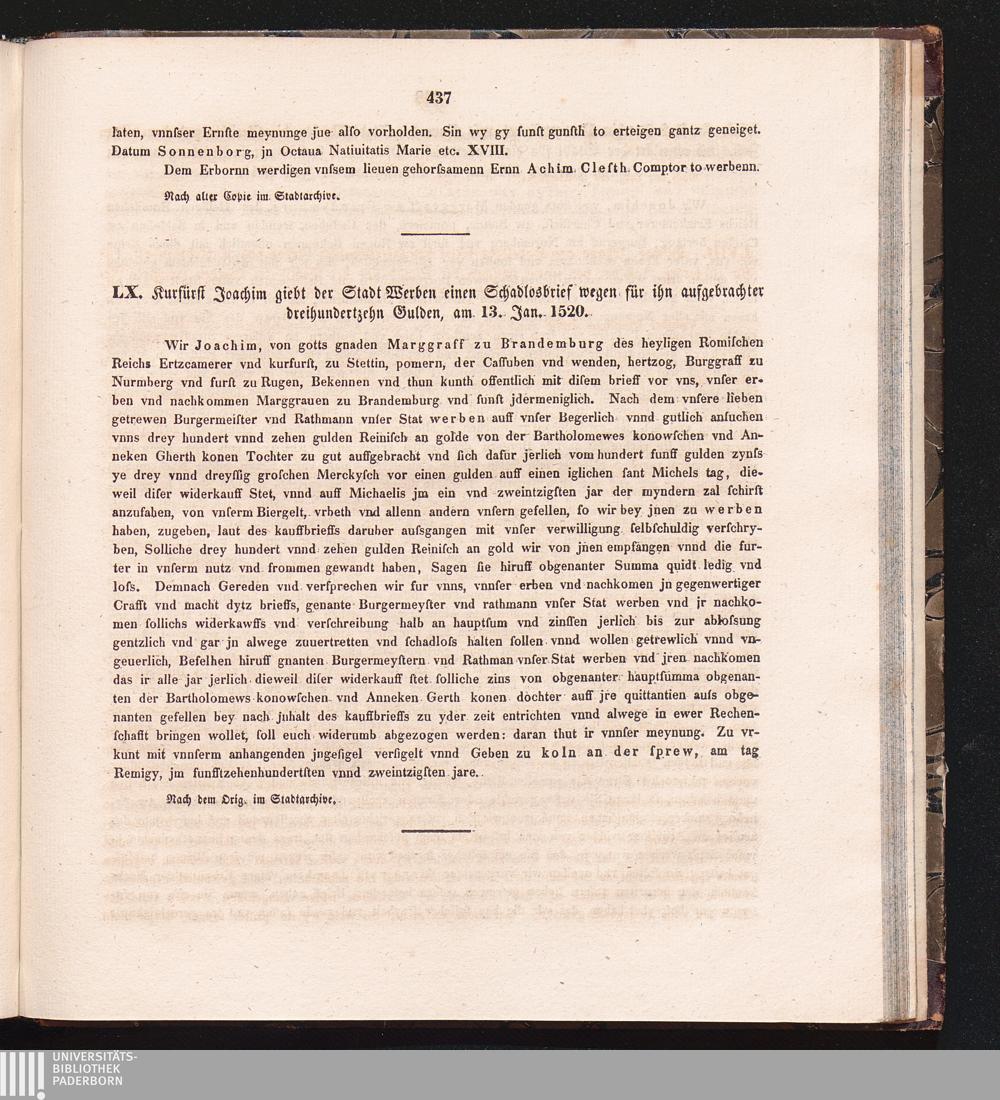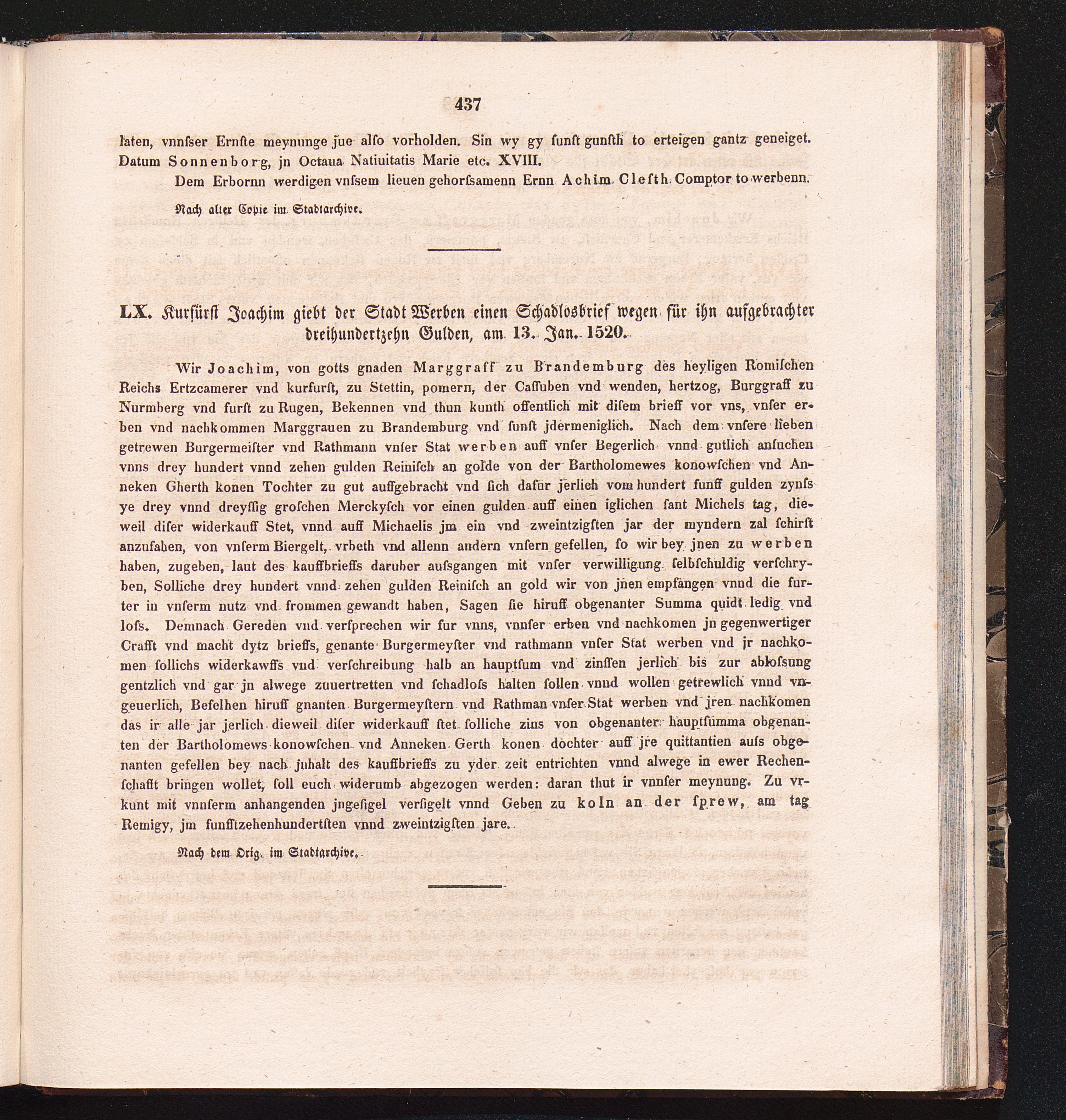 LX. Kurfürst Joachim giebt der Stadt Werben einen Schadlosbrief wegen für ihn aufgebrachter[...]