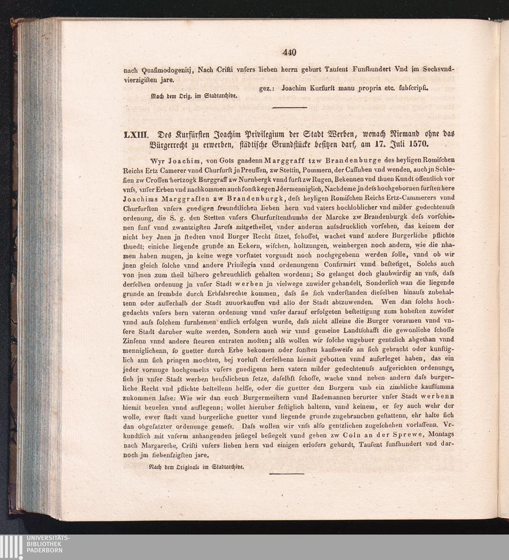 LXIII. Des Kurfürsten Joachim Privilegium der Stadt Werben, wonach Niemand ohne das[...]