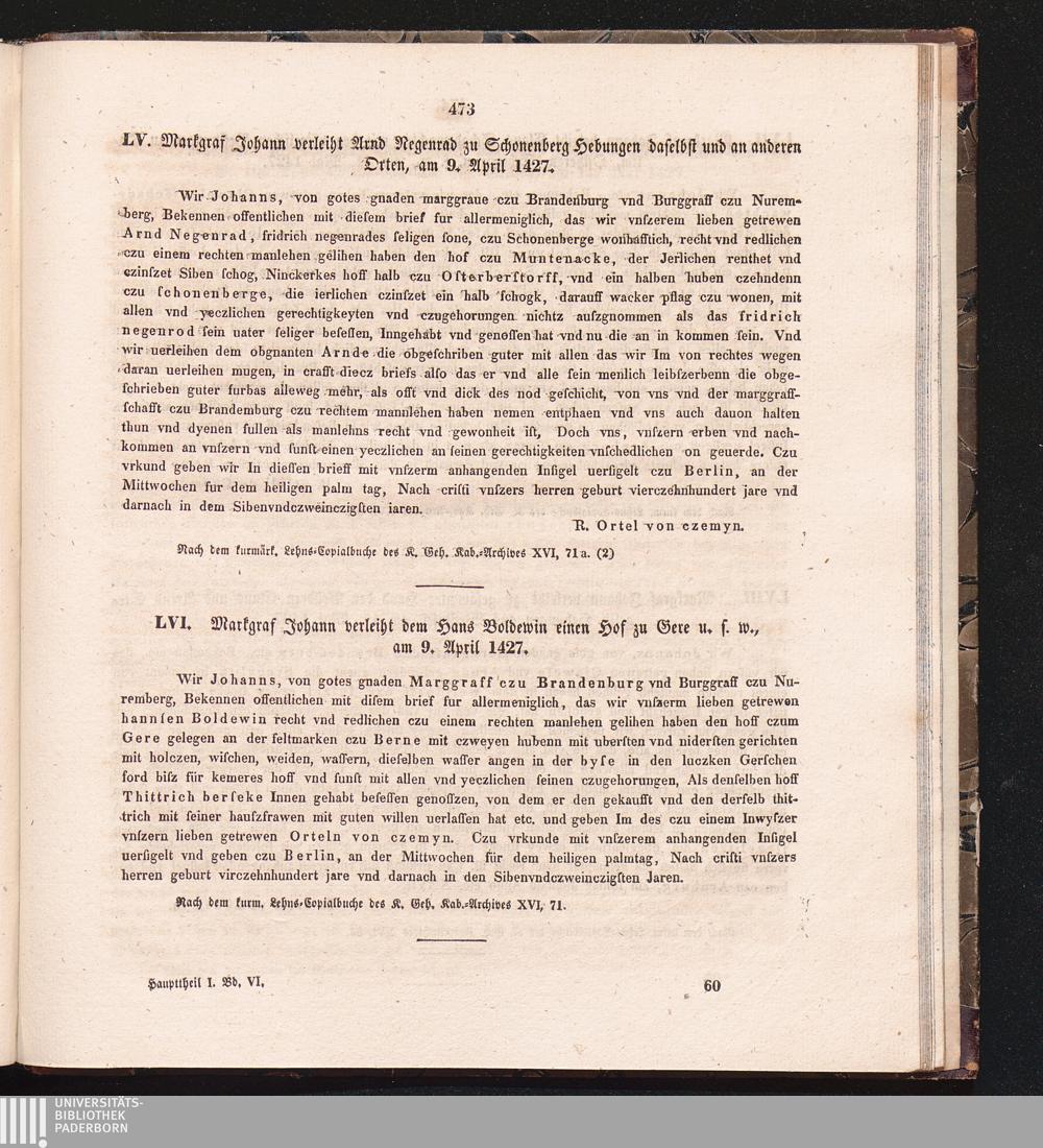 LVI. Markgraf Johann verleiht dem Hans Boldewin einen Hof zu Gere u. s. w., am 9.[...]