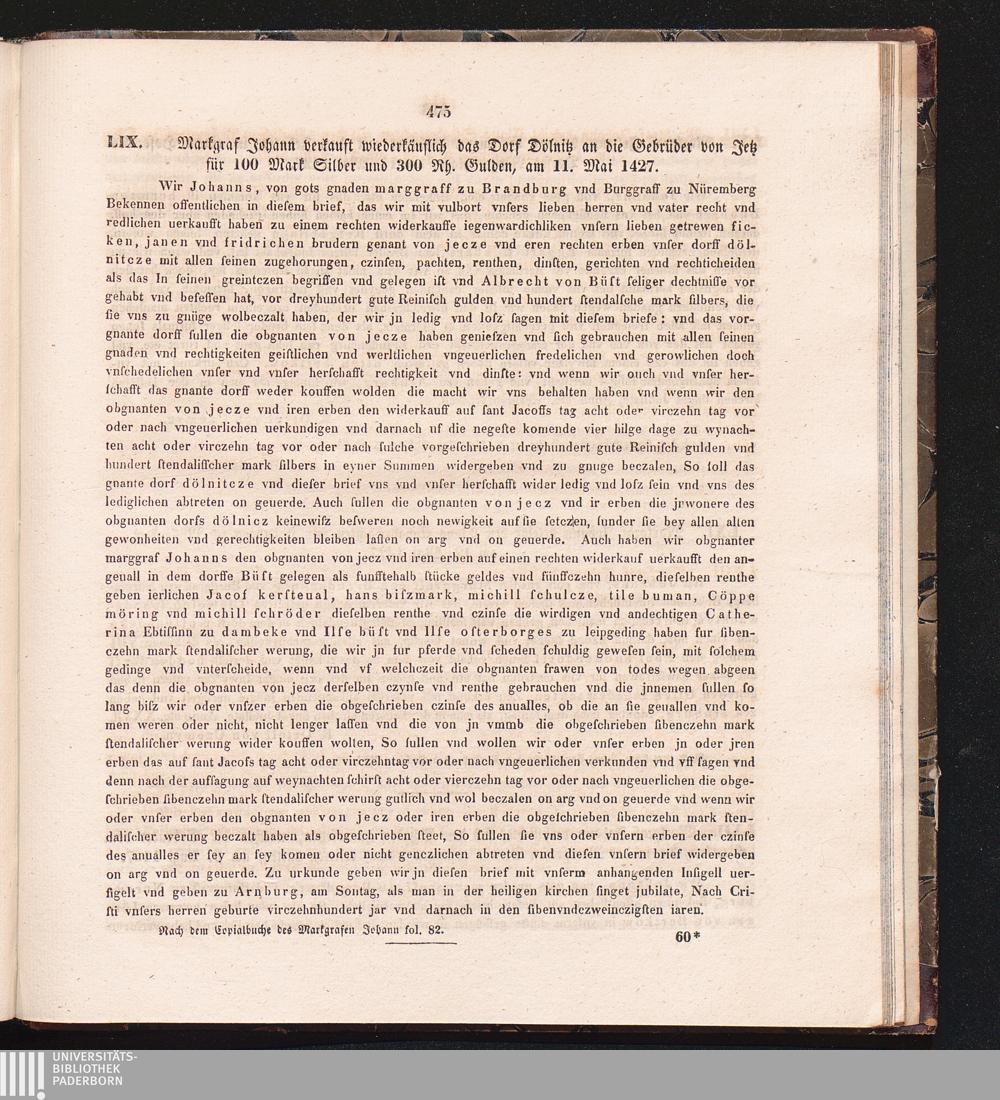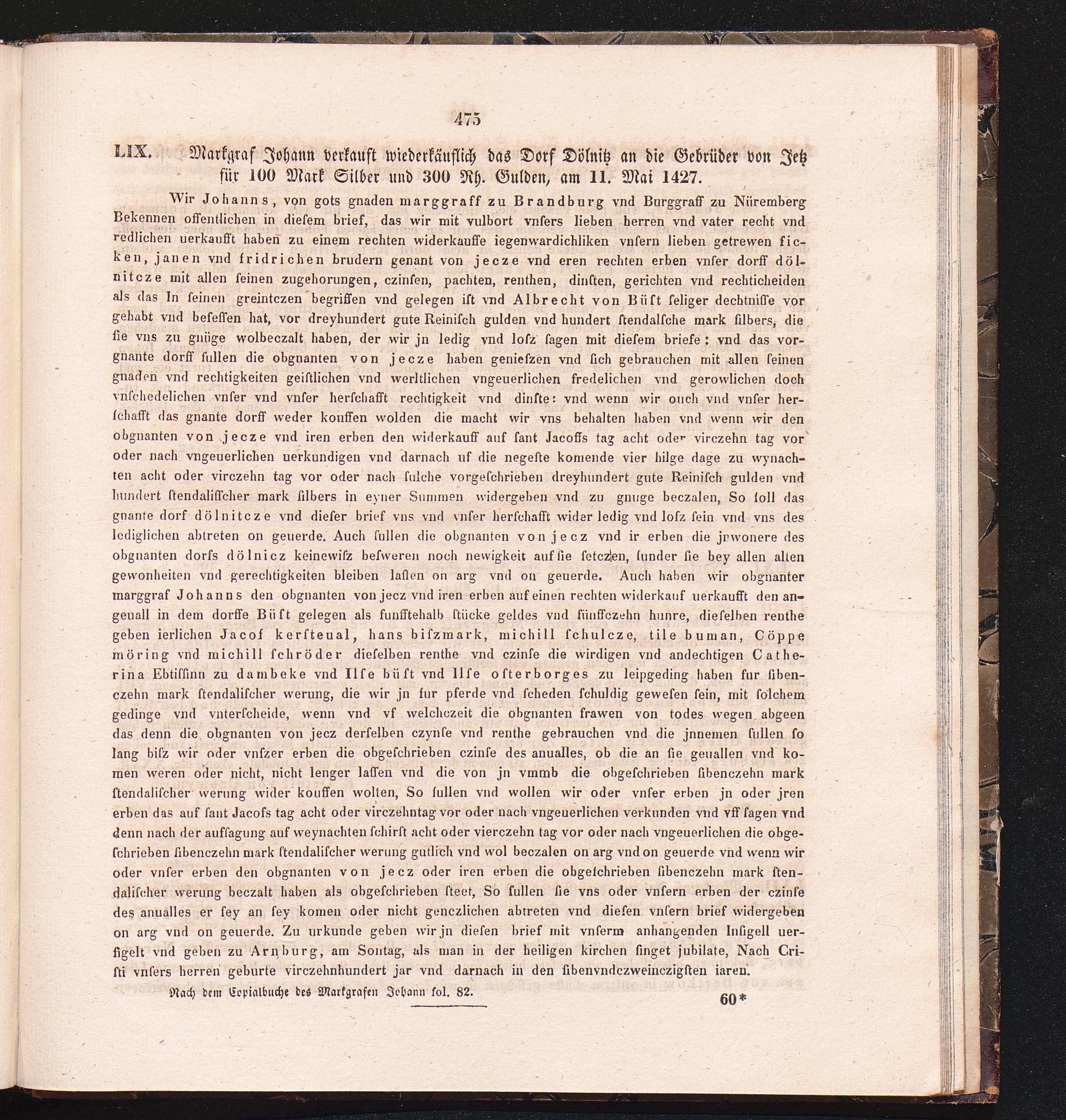 LIX. Markgraf Johann verkauft wiederkäuflich das Dorf Dölnitz ab die Gebrüder von[...]