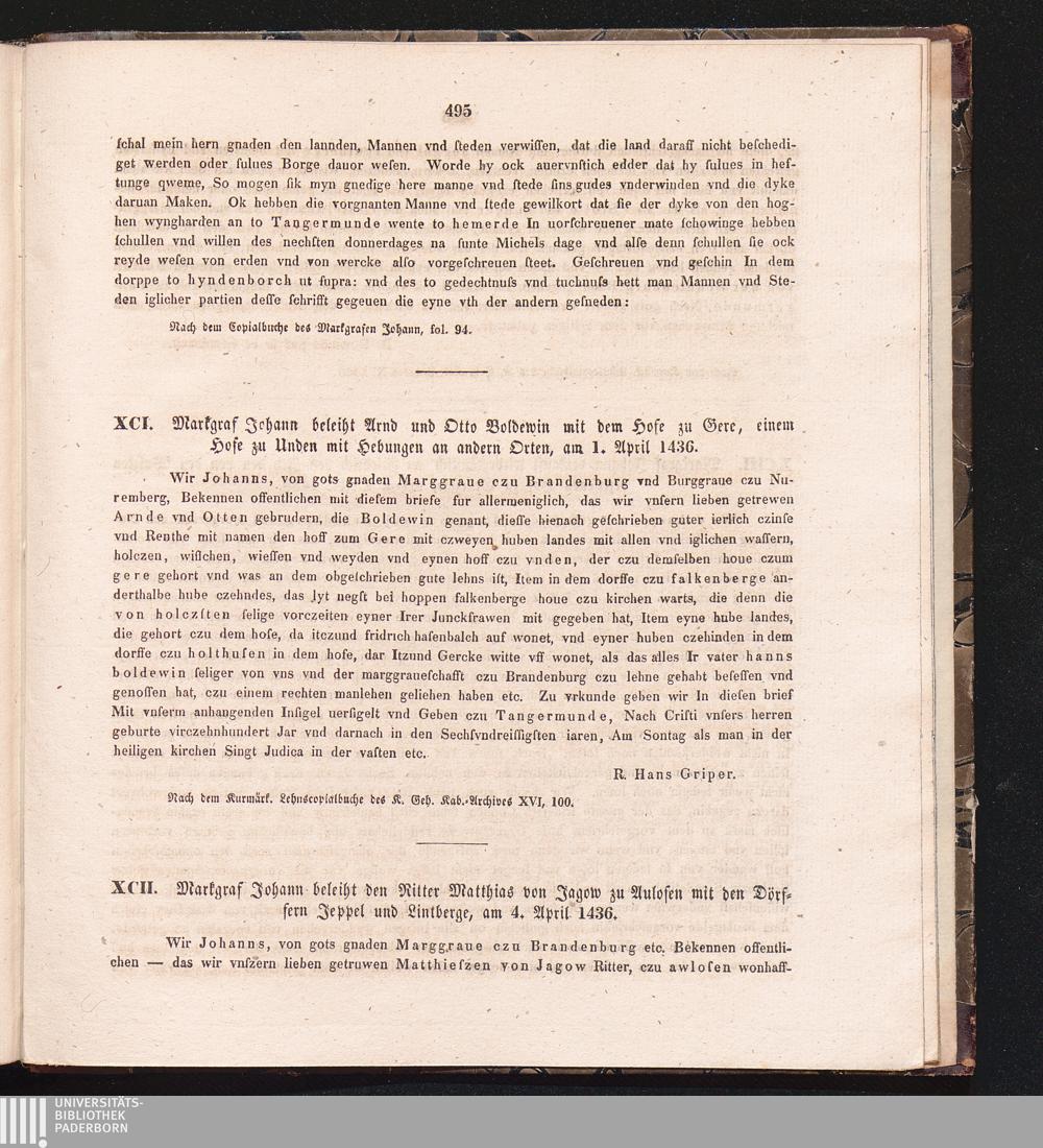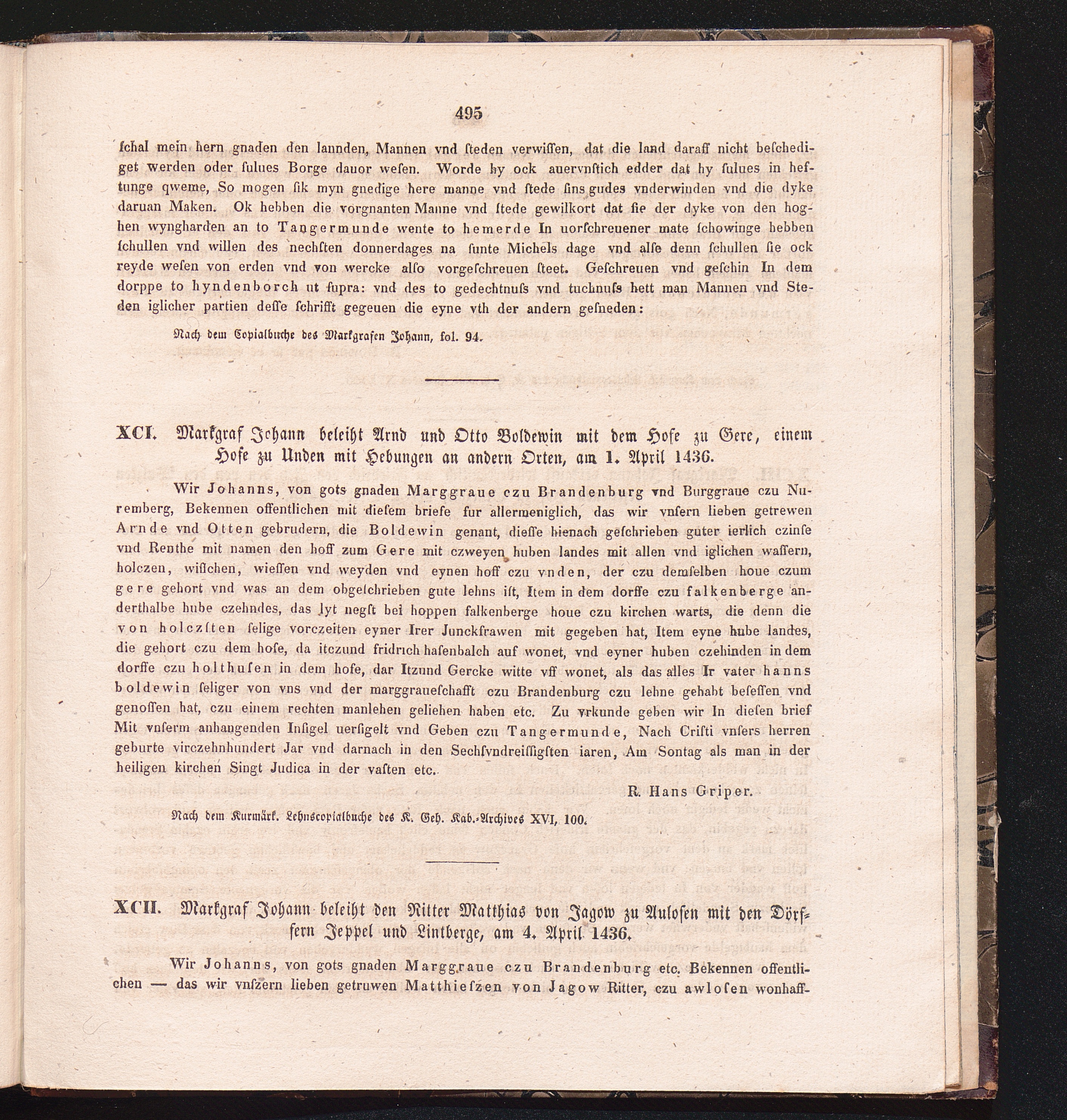 XCII. Markgraf Johann beleiht den Ritter Matthias von Jagow zu Aulofen mit den Dörfern[...]