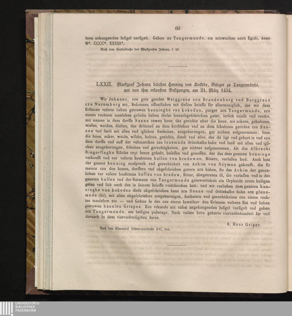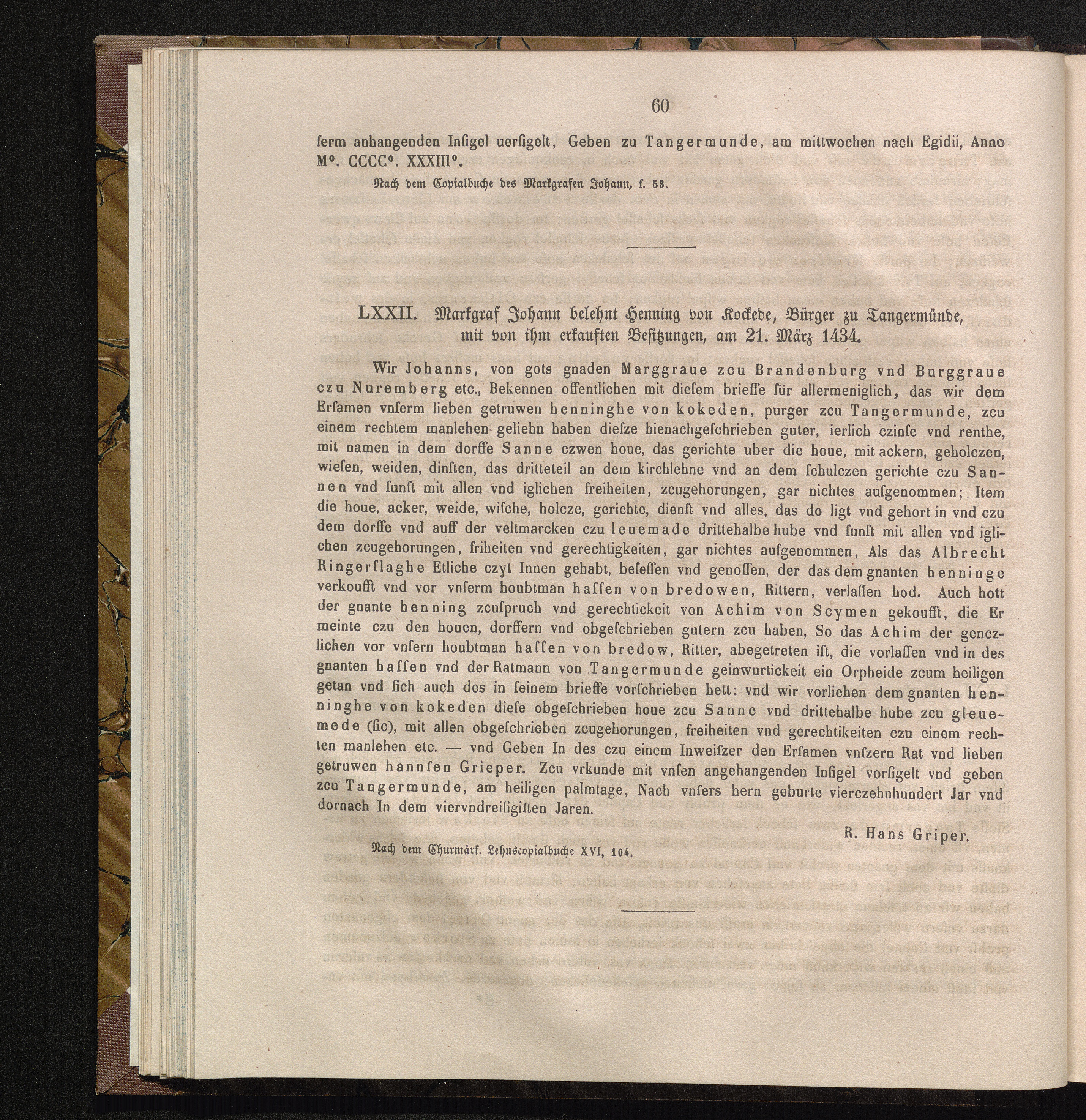 LXXII. Markgraf Johann belehnt Henning von Kockede, Bürger zu Tangermünde, mit von[...]