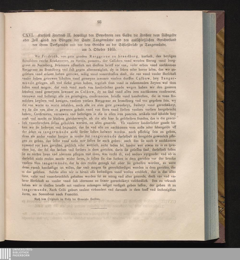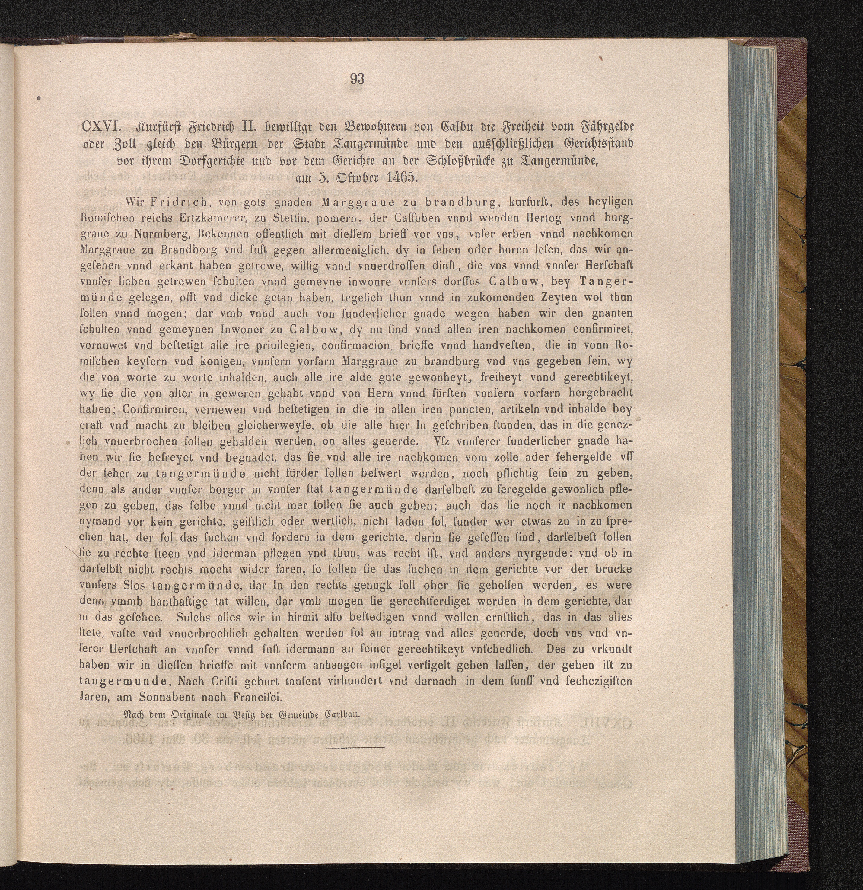 CXVI. Kurfürst Friedrich II. bewilligt den Bewohnern von Calbu die Freiheit vom Fährgelde[...]