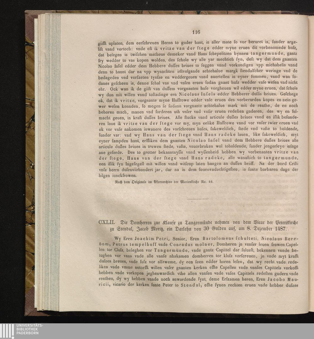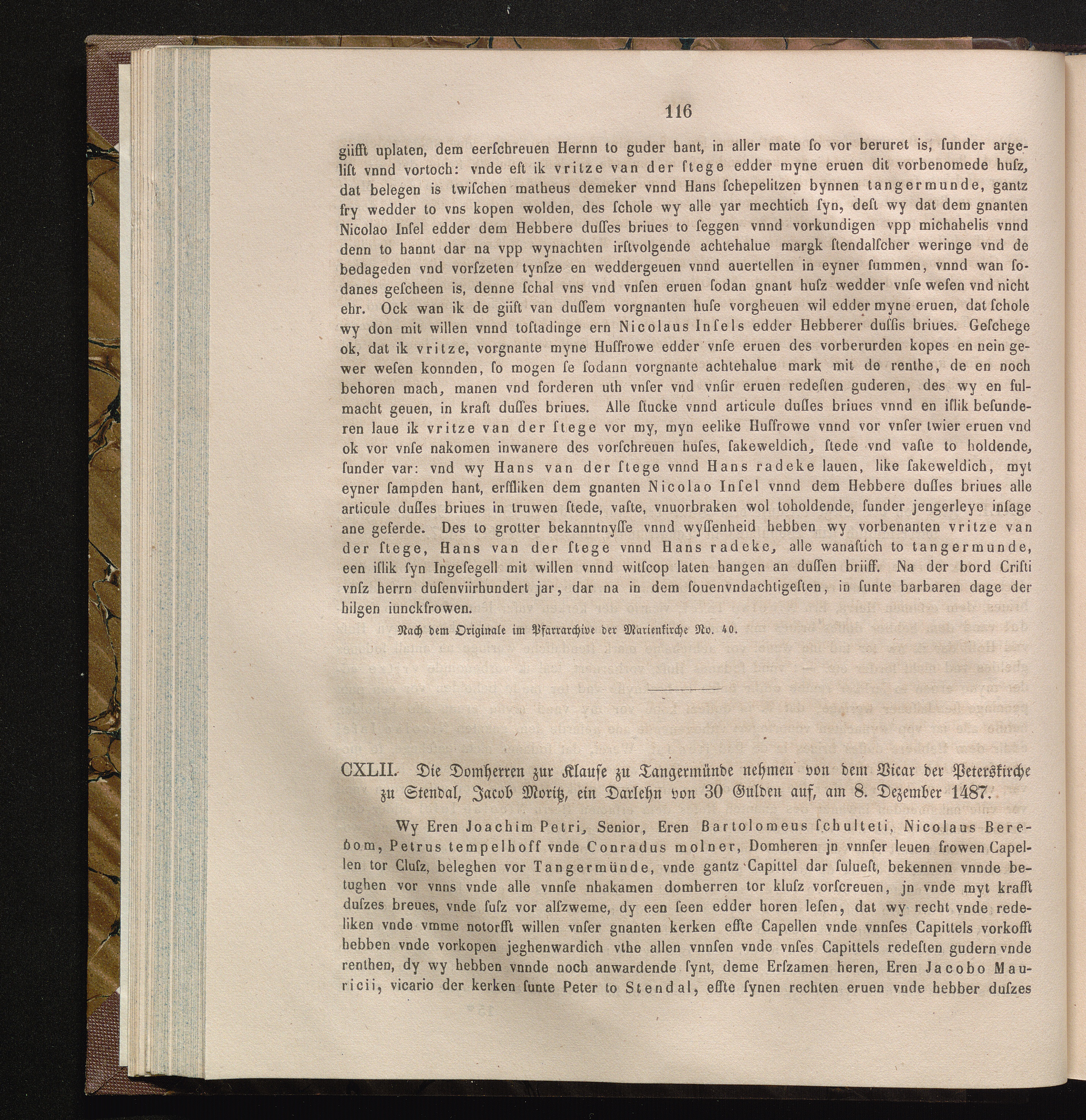 CXLII. Die Domherrren zur Klause zu Tangermünde nehmen von dem Vicar der Peterskirche[...]