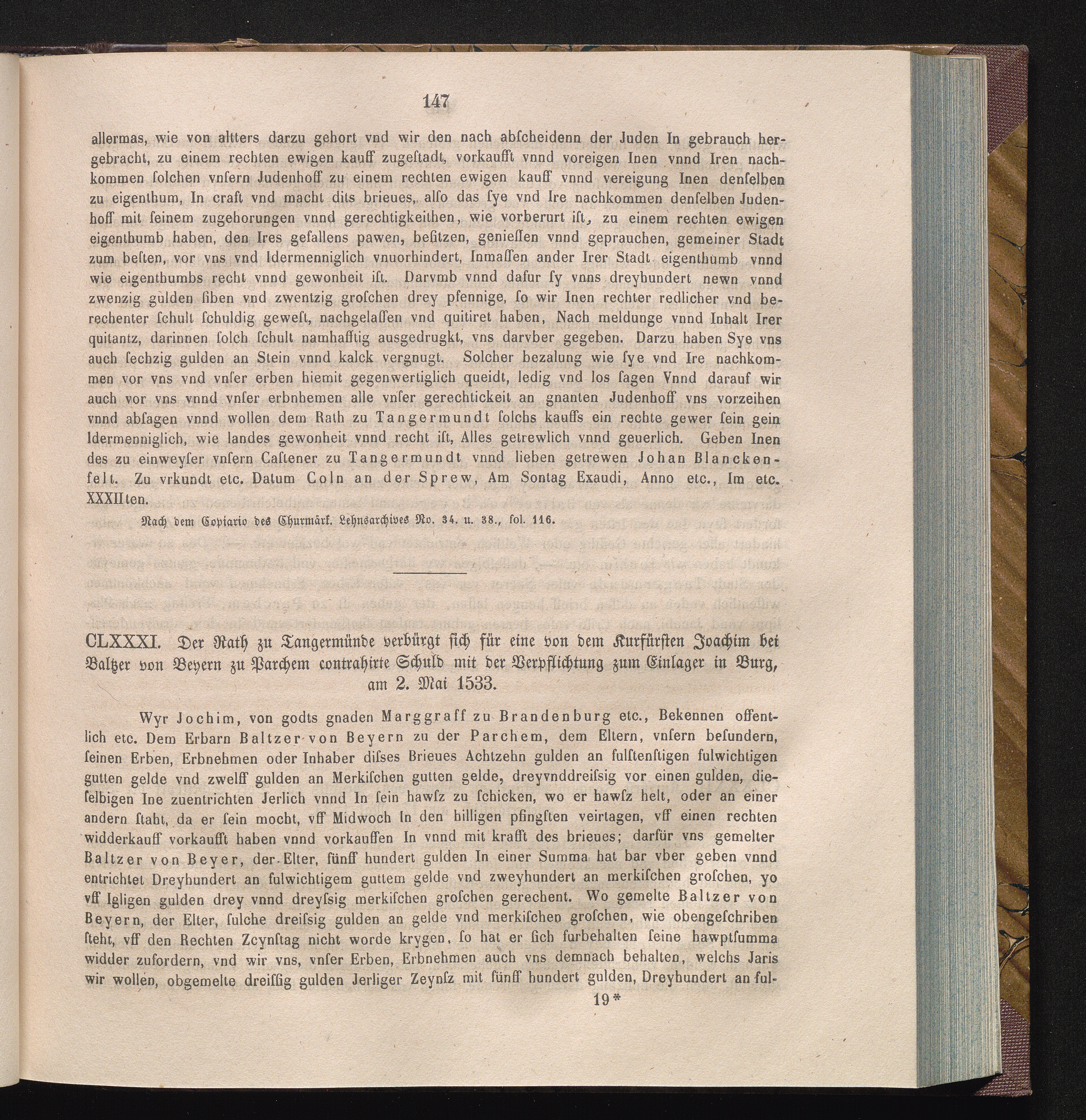 CLXXXI. Der Rath zu Tangermünde verbürgt sich für eine von dem Kurfürsten Joachim[...]