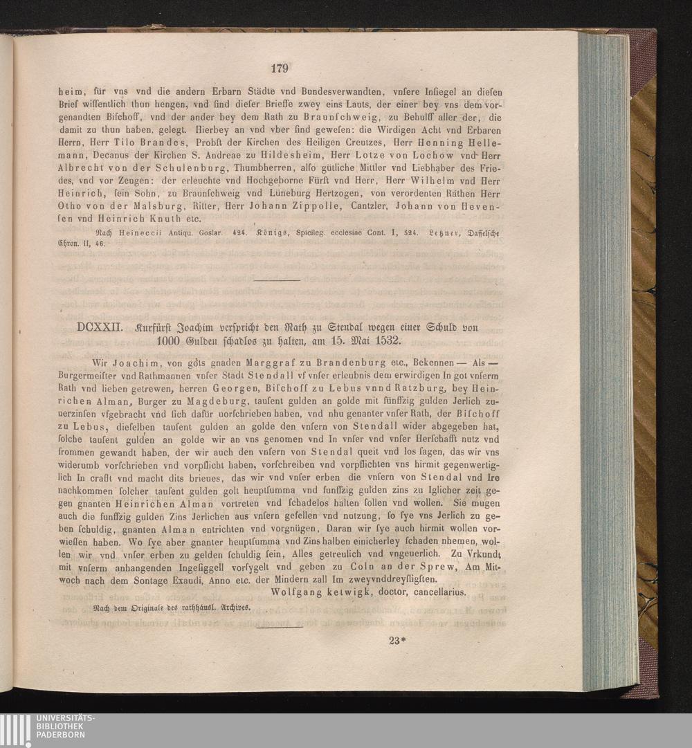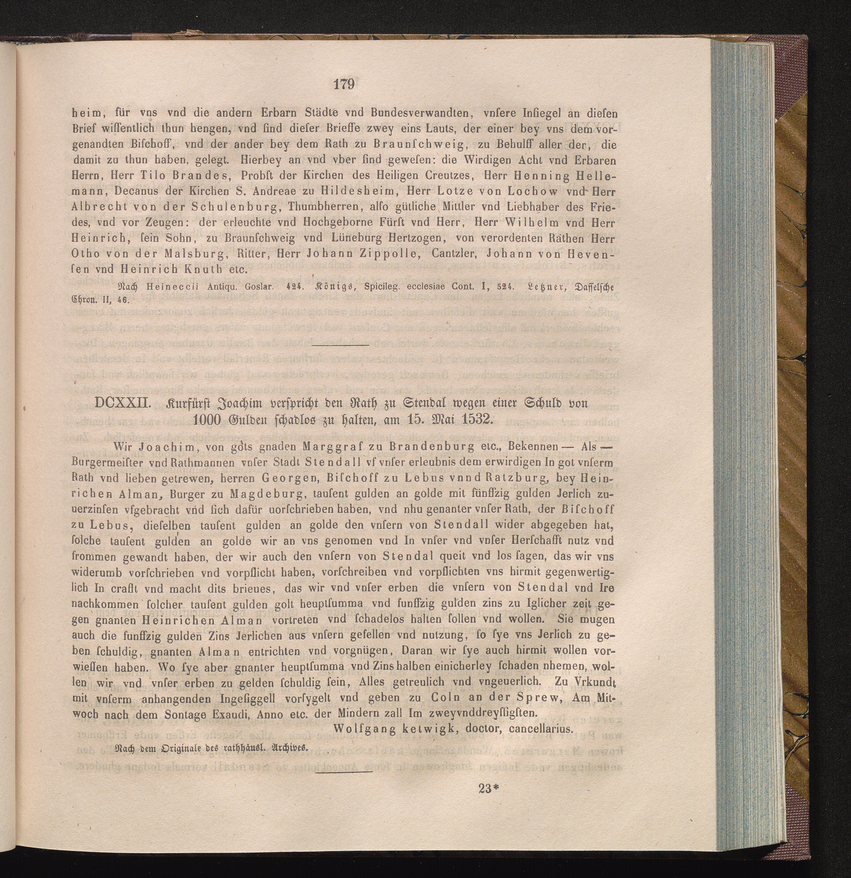 DCXXII. Kurfürst Joachim verspricht den Rath zu Stendal wegen einer Schuld von 1000[...]