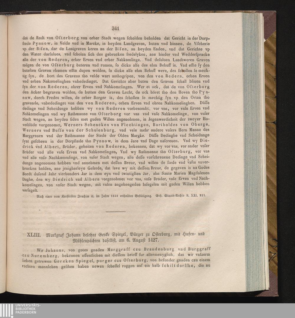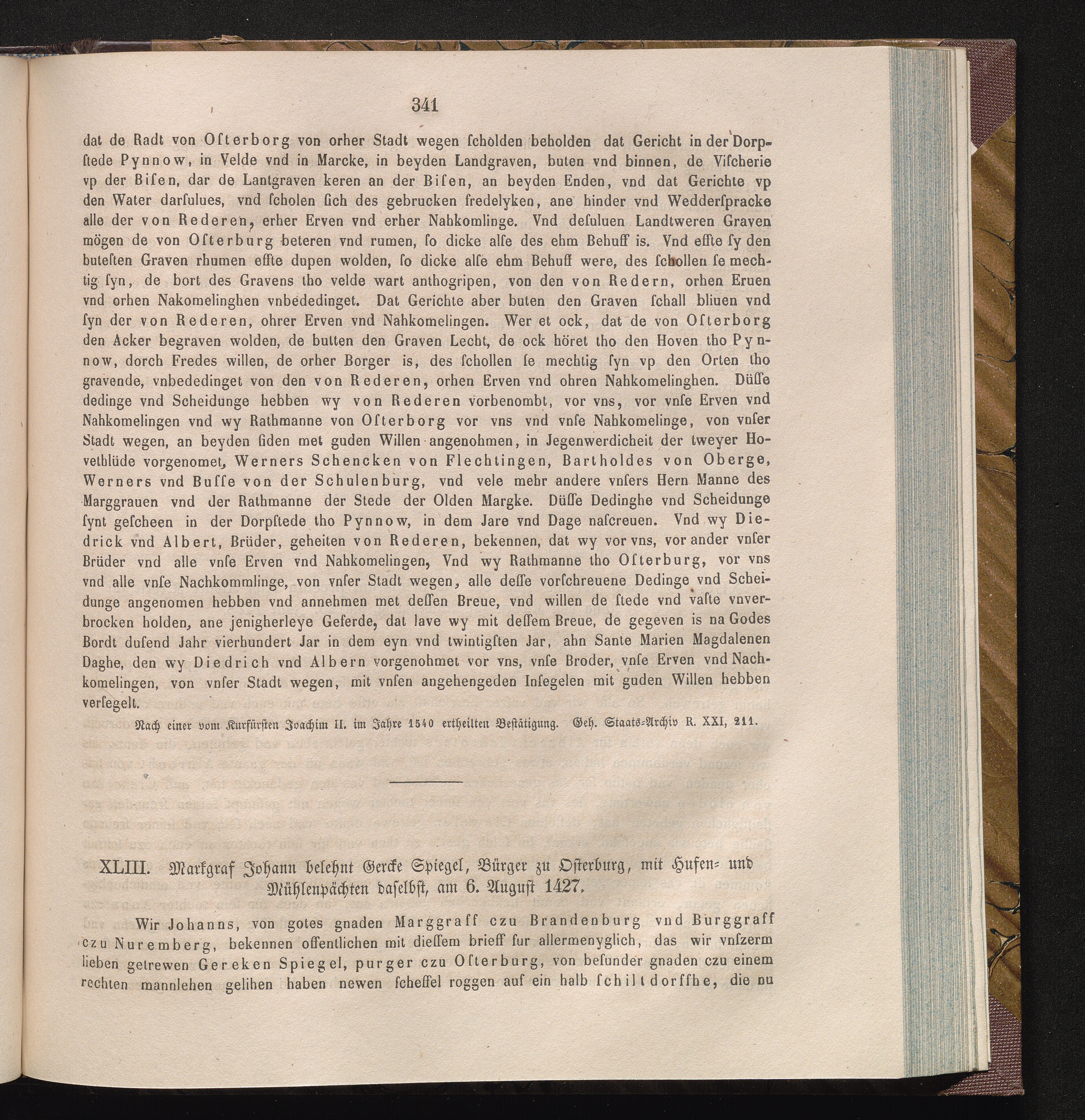 XLIII. Markgraf Johann belehnt Gercke Spiegel, Bürger zu Osterburg, mit Hufen- und[...]