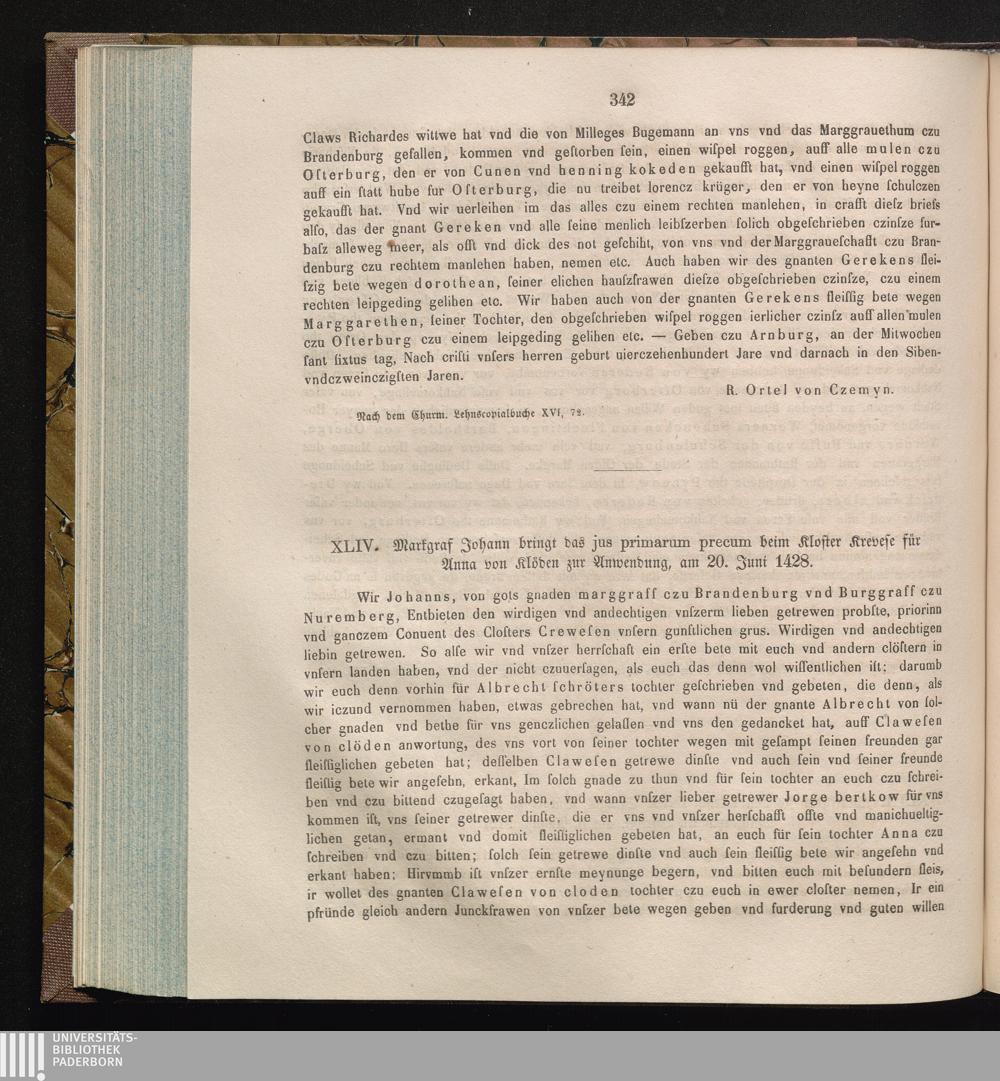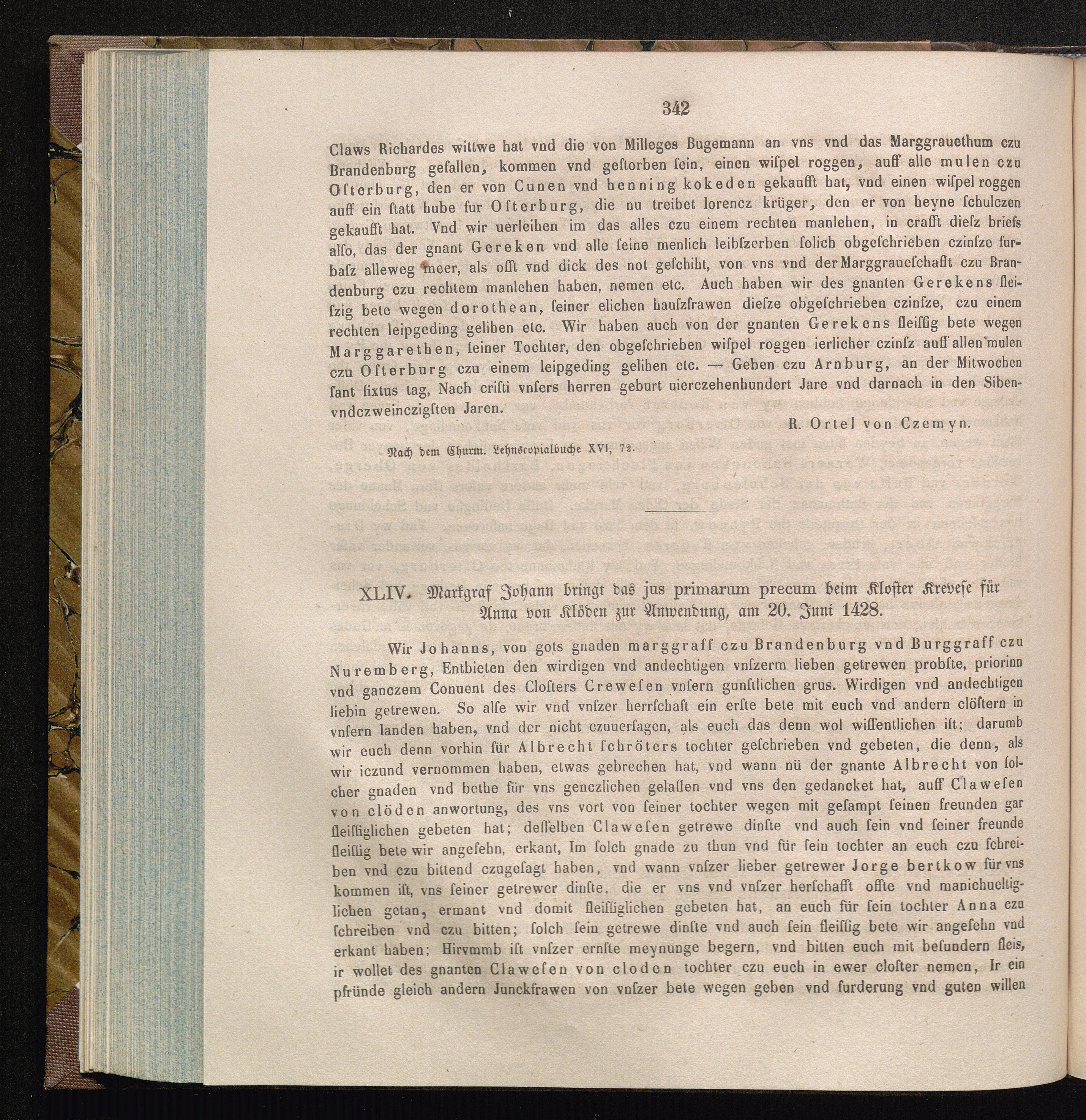 XLIV. Markgraf Johann bringt das jus primarum peccum beim Kloster Krevese für Anna[...]