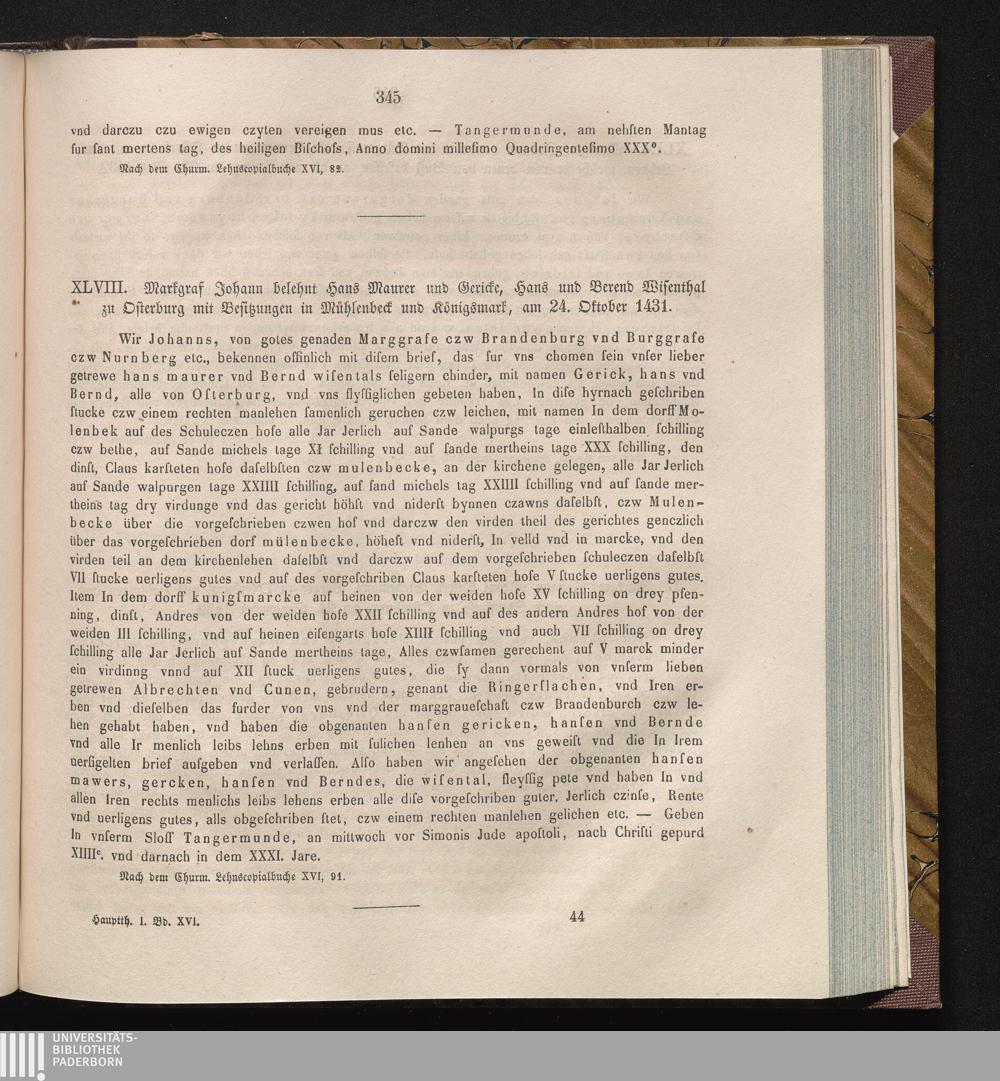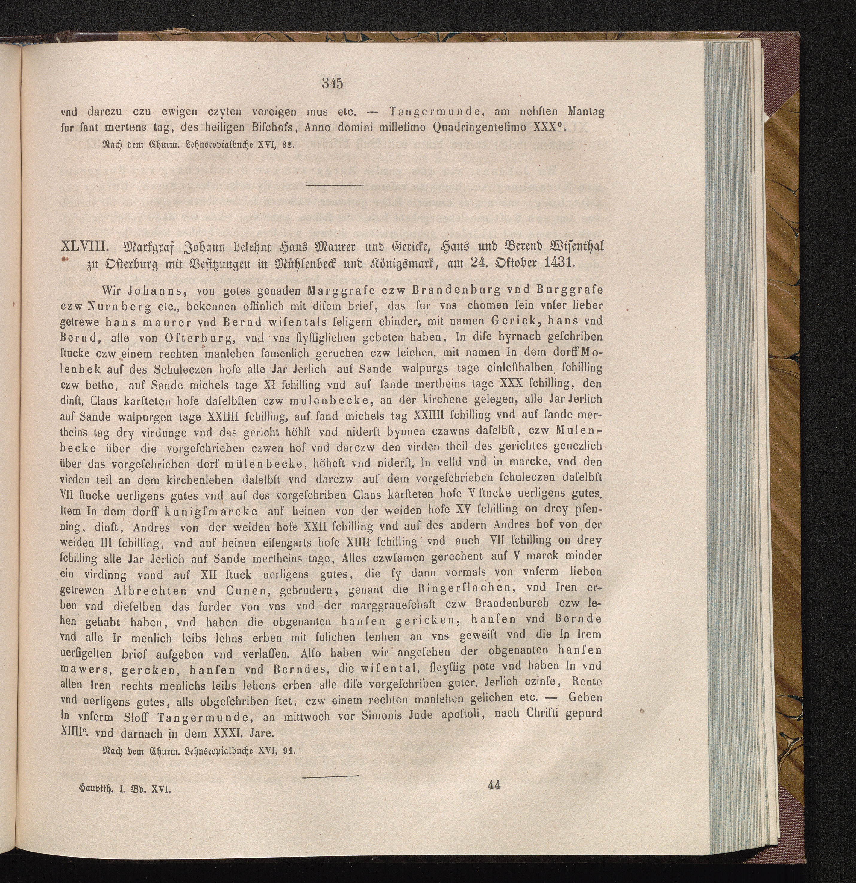 XLVIII. Markgraf Johann belehnt Hans Maurer und Gericke, Hans und Berend Wisenthal[...]