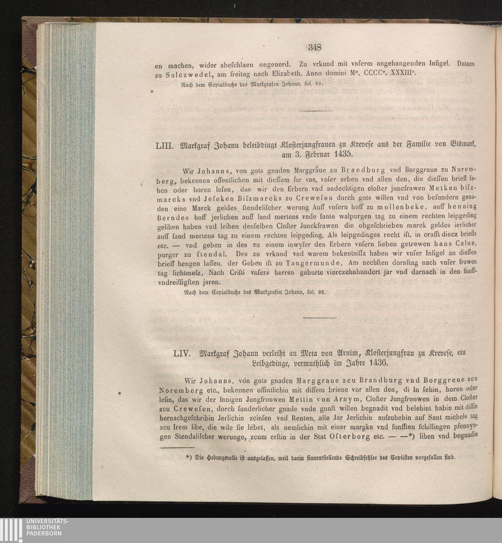 LIV. Markgraf Johann verleiht an Meta von Arnim, Klosterjungfrau zu Krevese, ein[...]