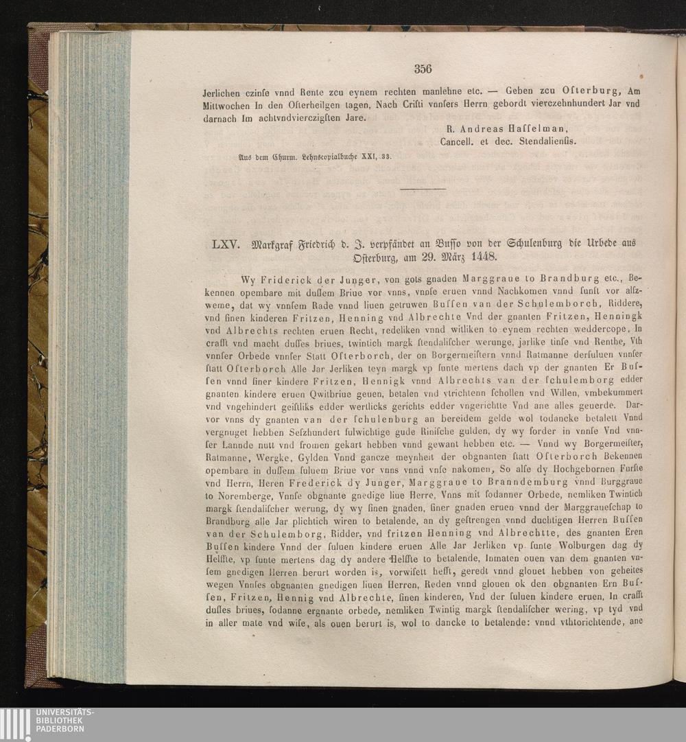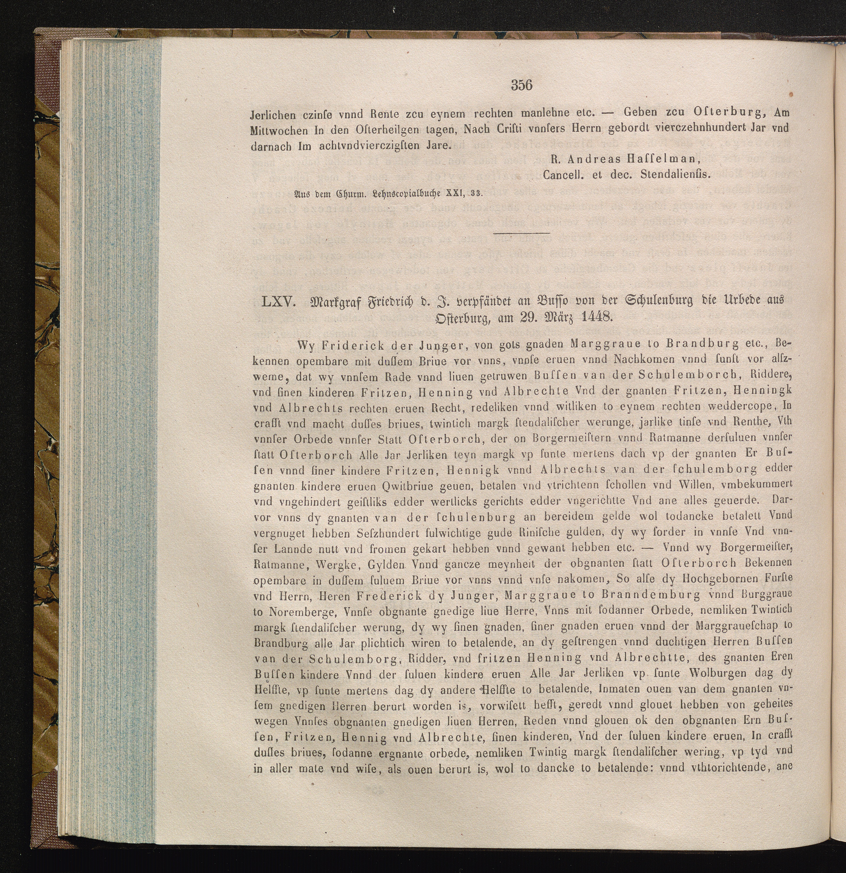 LXV. Markgraf Friedrich d. J. verpfändet an Busso von der Schulenburg die Urbede[...]