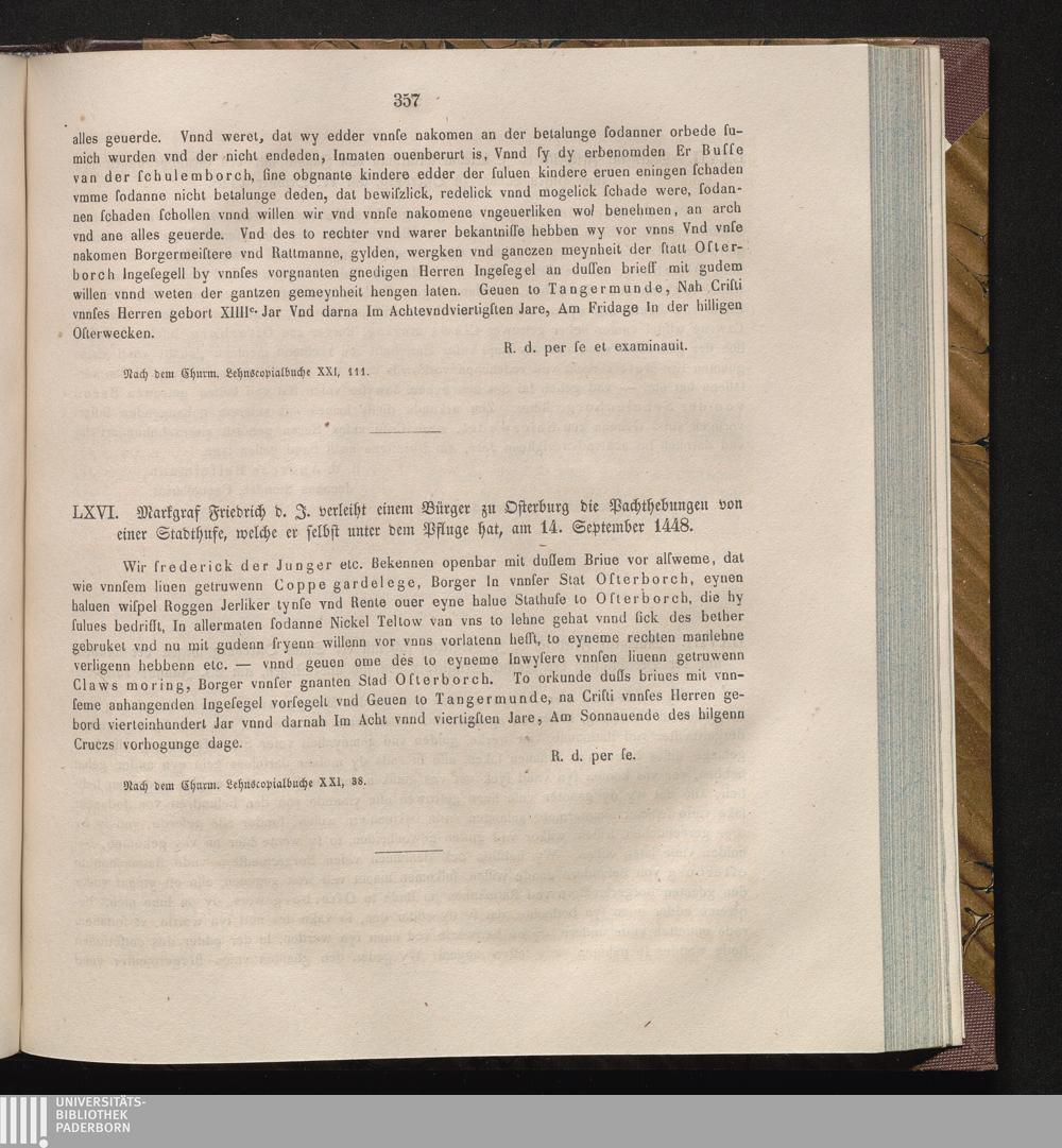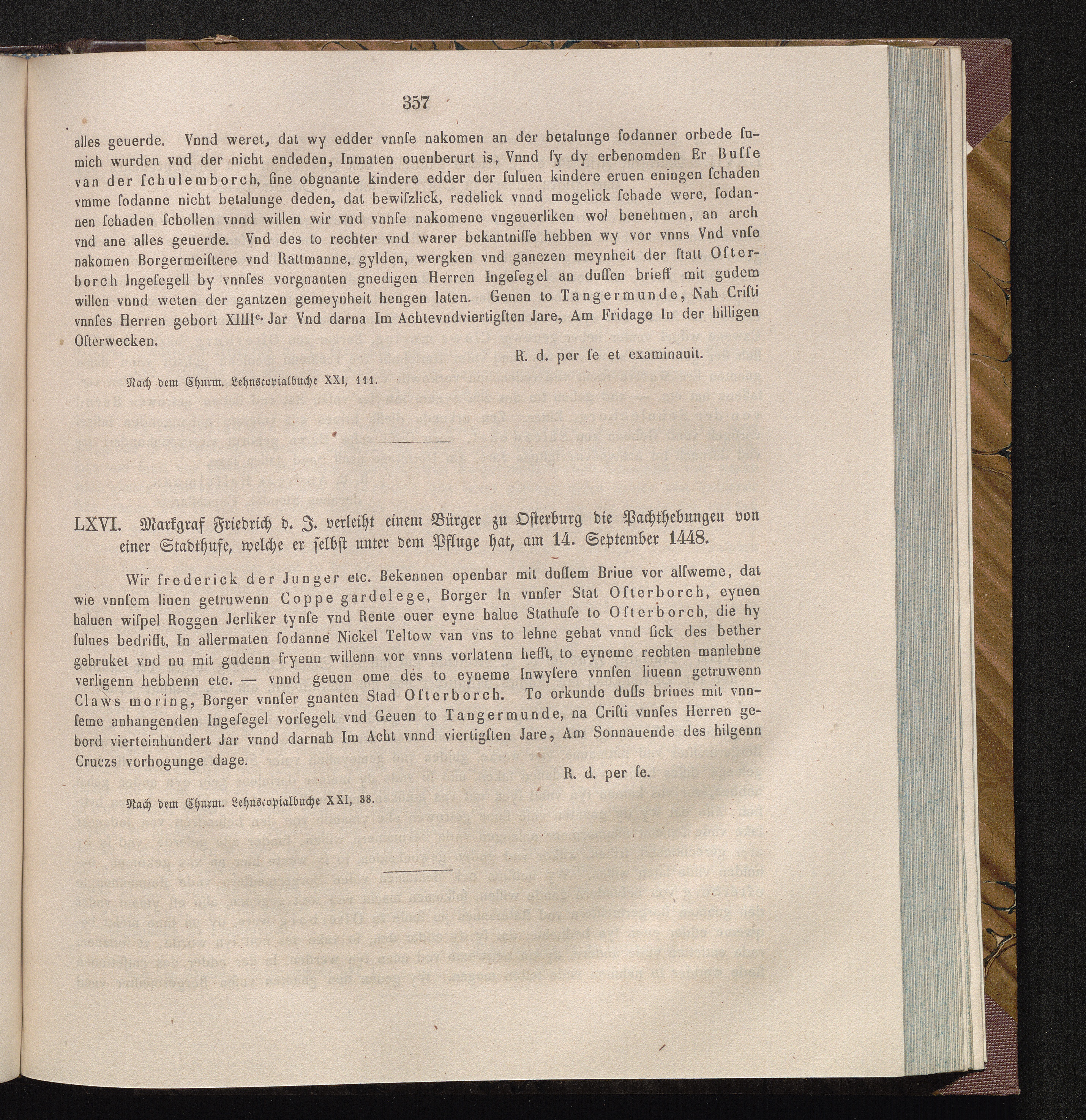 LXVI. Markgraf Friedrich d. J. verleiht einem Bürger zu Osterburg die Pachthebungen[...]
