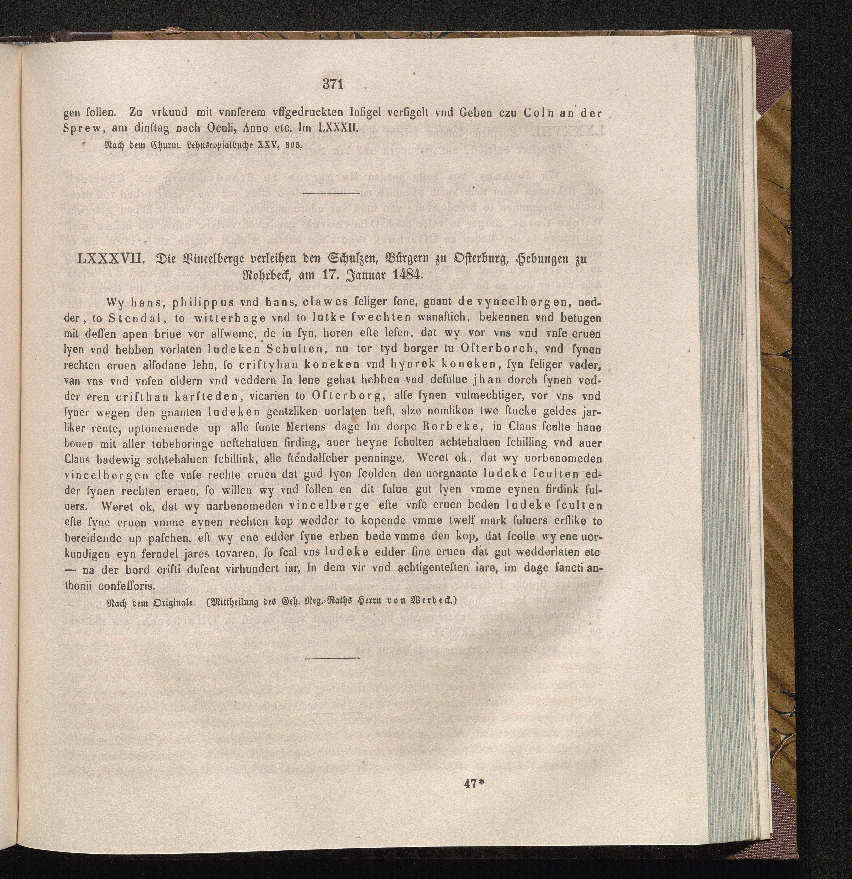 LXXXVII. Die Vincelberge verleihen den Schulzen, Bürgern zu Osterburg, Hebungen zu[...]