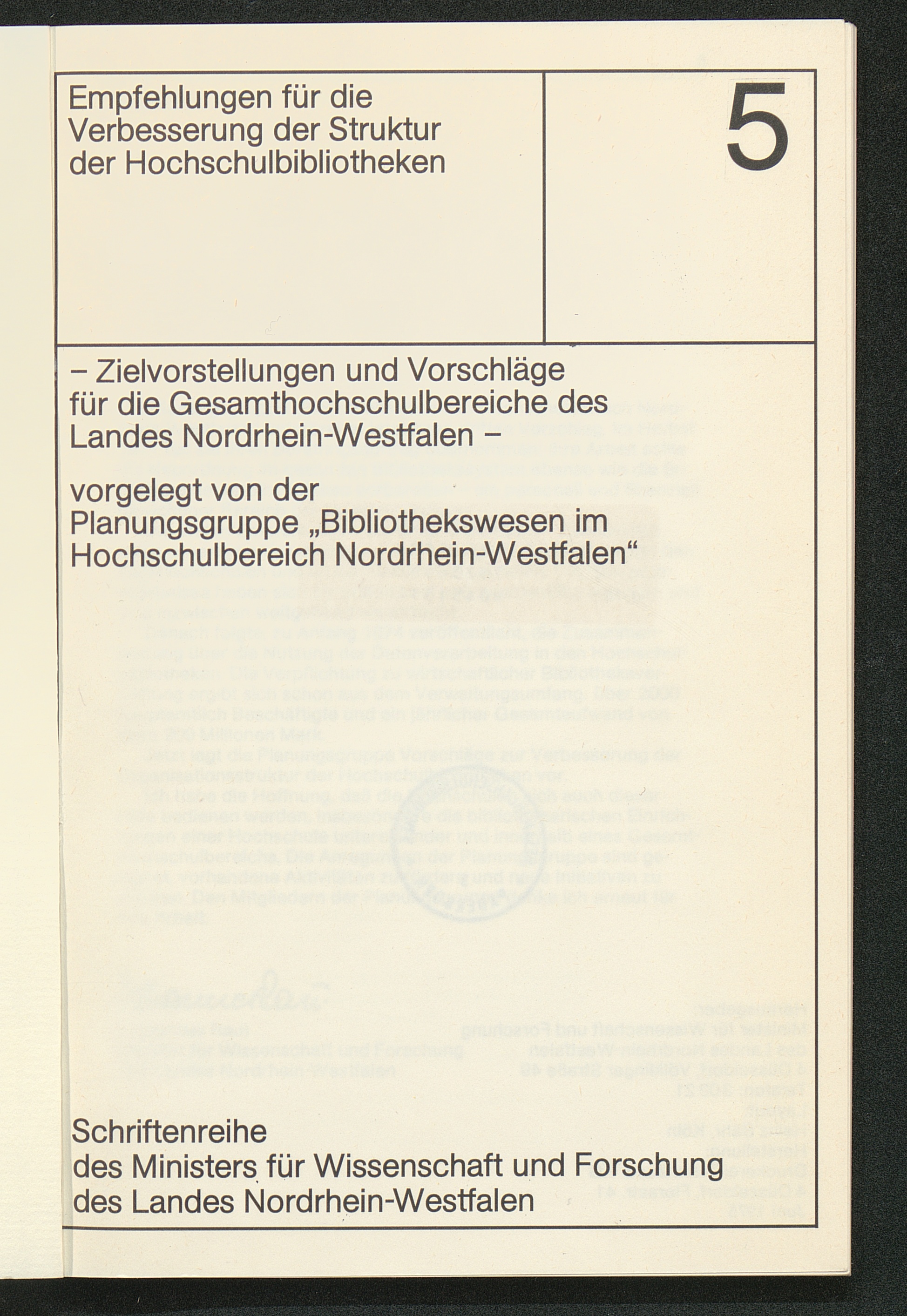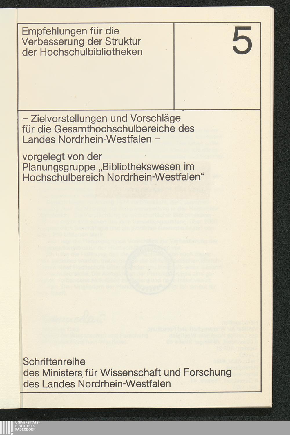 Empfehlungen für die Verbesserung der Struktur der Hochschulbibliotheken : Zielvorstellungen und Vorschläge für die Gesamthochschulbereiche des Landes Nordrhein-Westfalen / vorgelegt von der Planungsgruppe "Bibliothekswesen im Hochschulbereich Nordrhein-Westfalen"