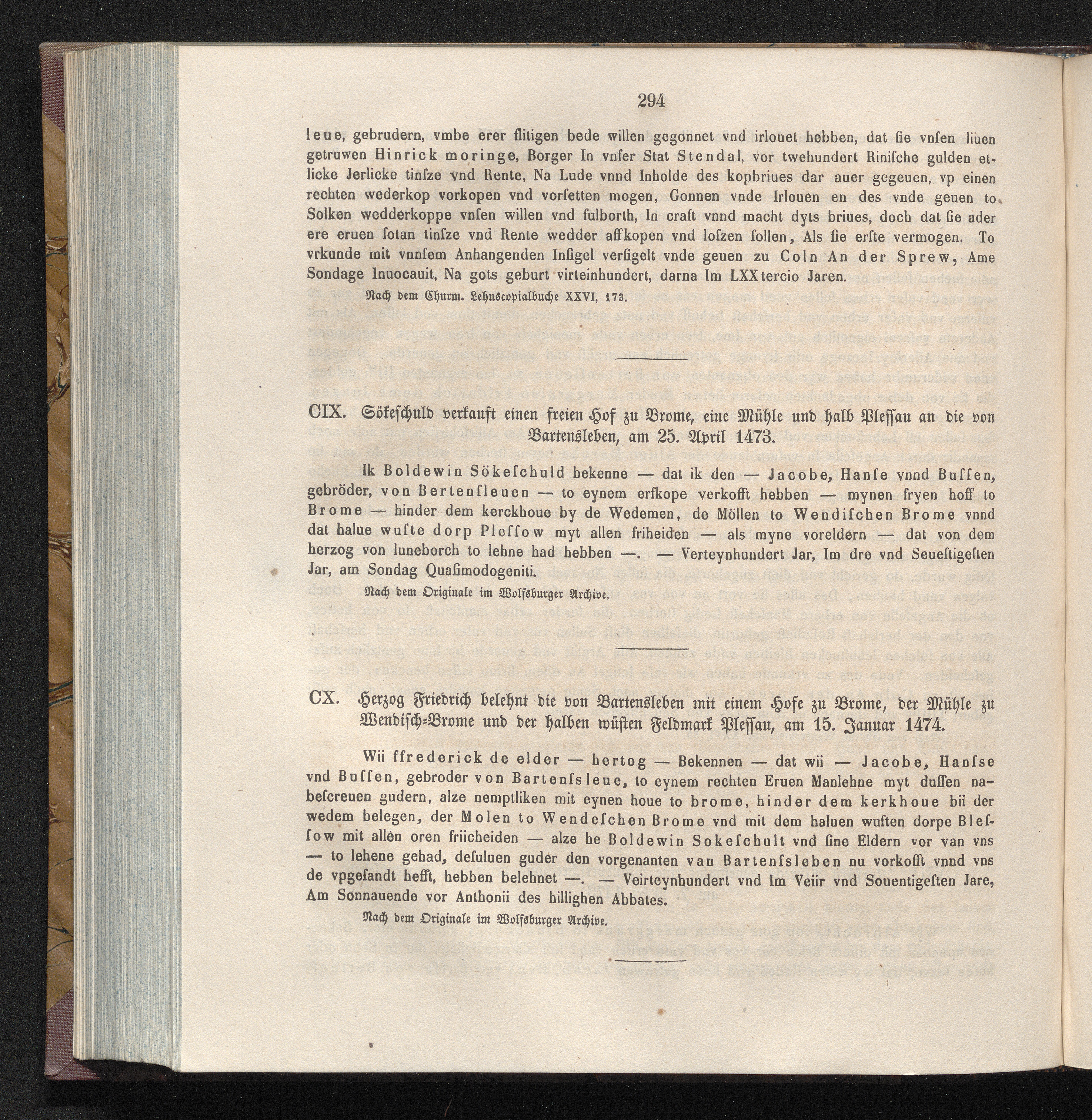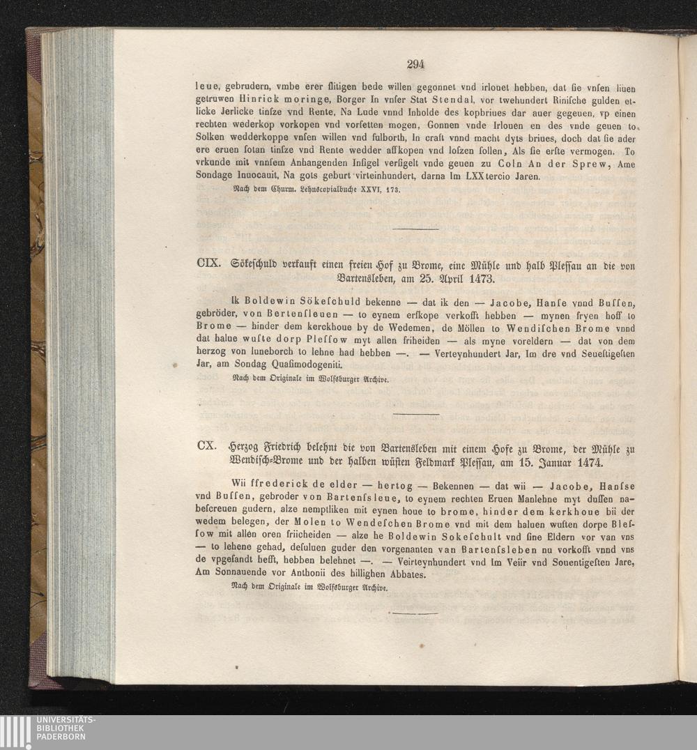 CX. Herzog Friedrich belehnt die von Bartensleben mit einem Hofe zu Brome, der Mühle[...]
