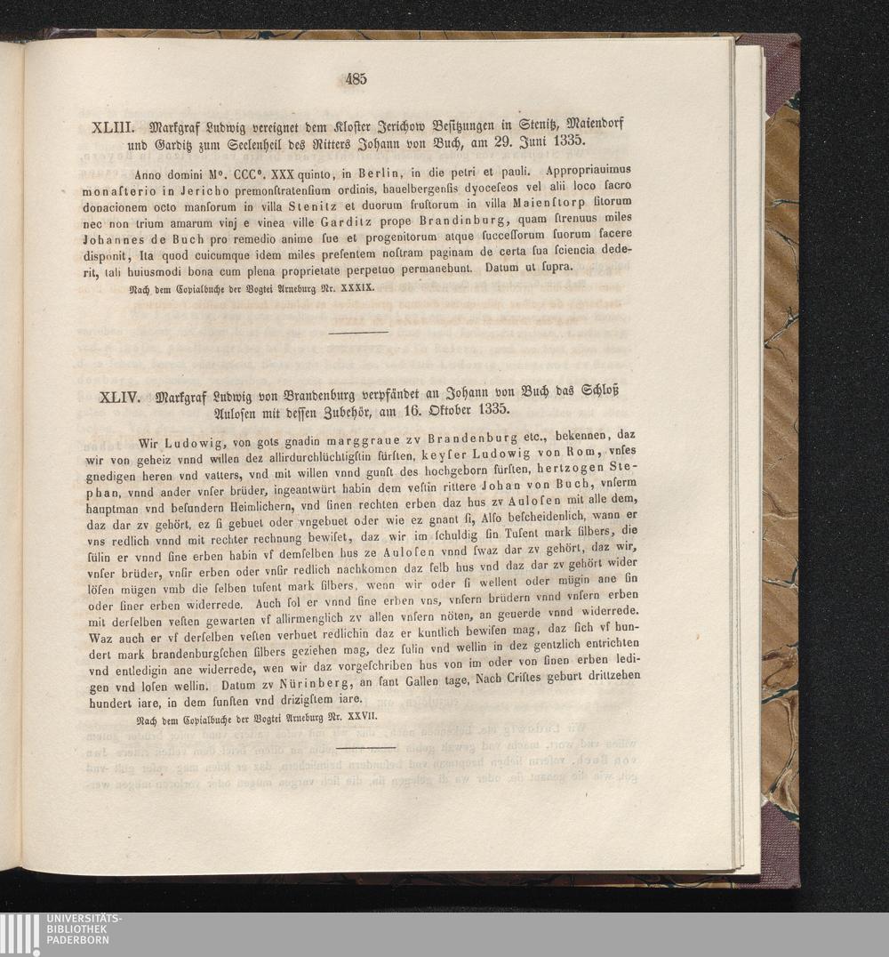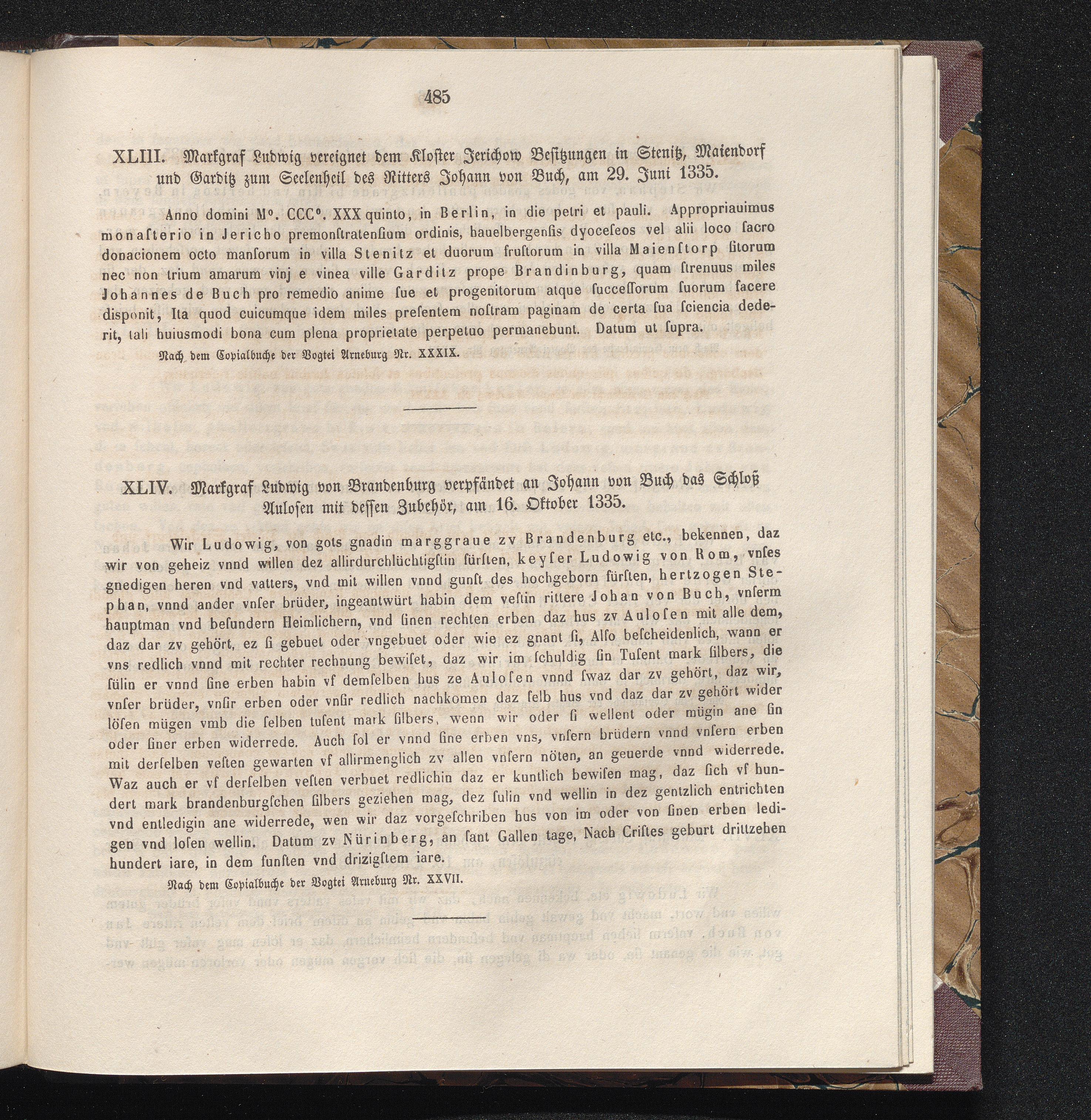 XLIV. Markgraf Ludwig von Brandenburg verpfändet an Johann von Buch das Schloß Aulosen[...]