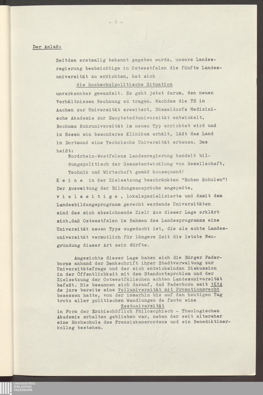 Ostwestfalens Leistungsentfaltung und Wiederbegründung seiner Universität in Paderborn : eine landespolitische Aufgabe