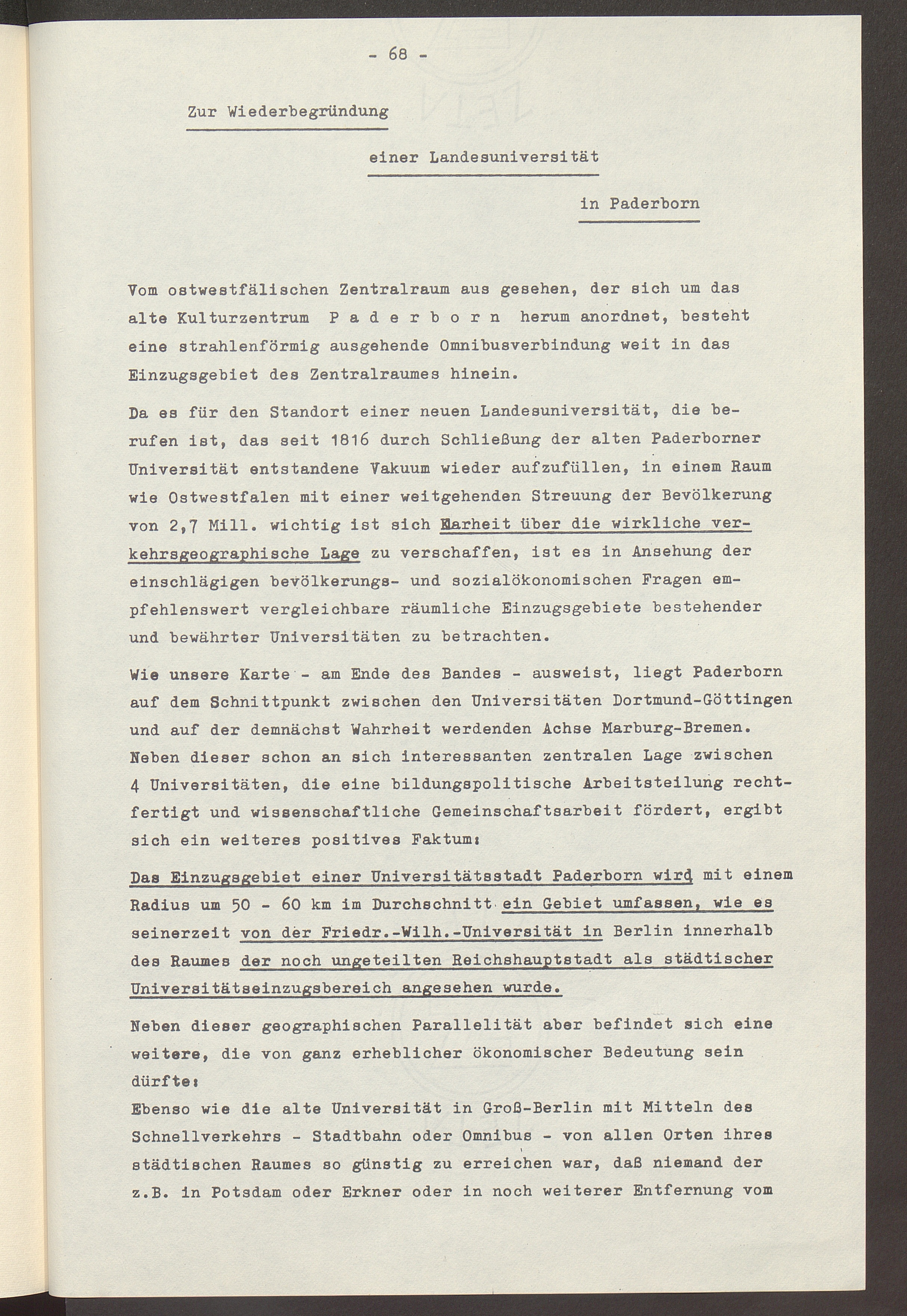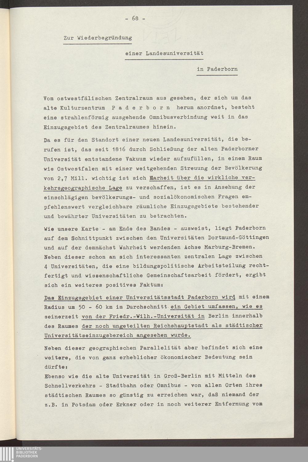 Ostwestfalens Leistungsentfaltung und Wiederbegründung seiner Universität in Paderborn : eine landespolitische Aufgabe
