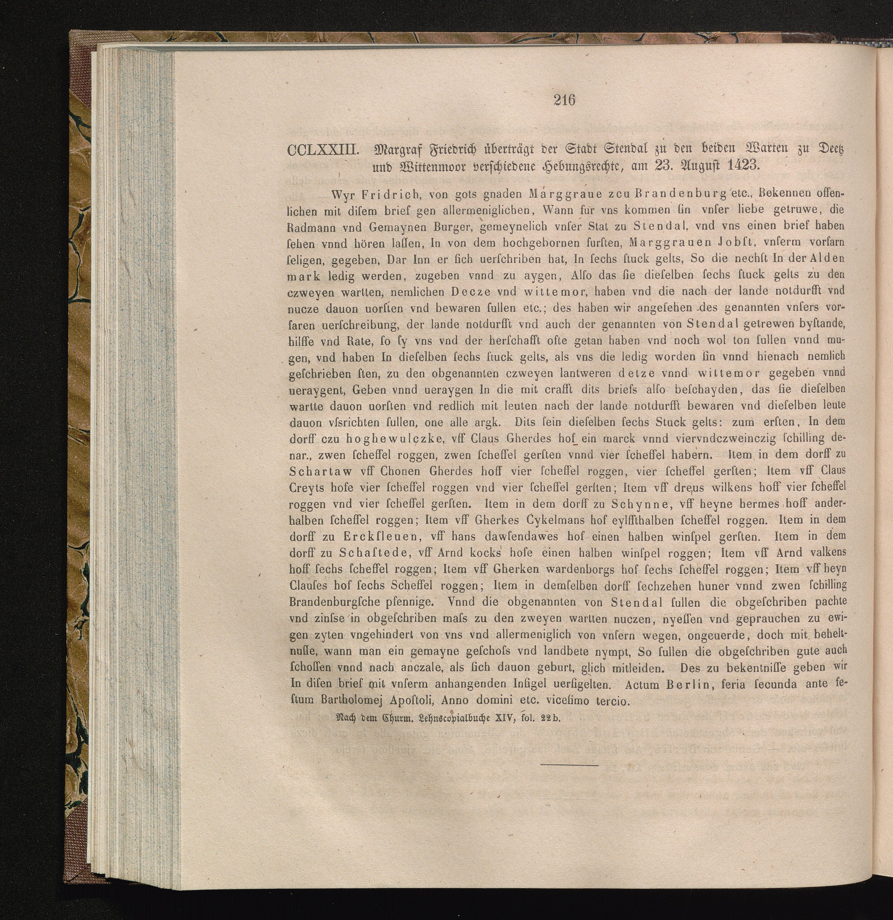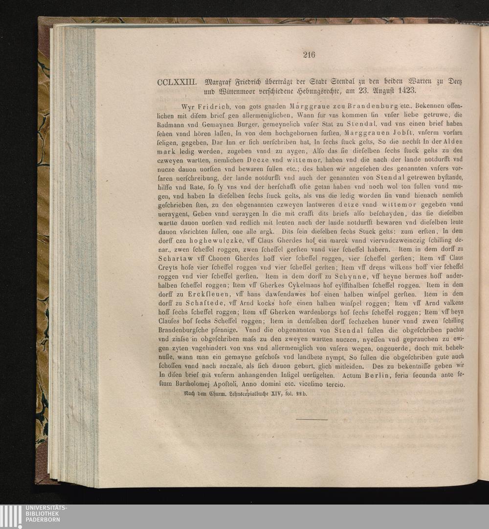 CCLXXIII. Margraf Friedrich überträgt der Stadt Stendal zu den beiden Warten zu Deetz[...]