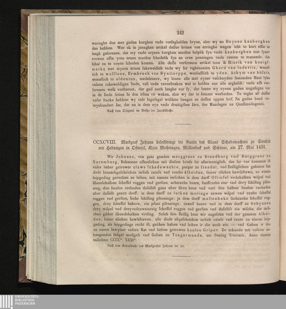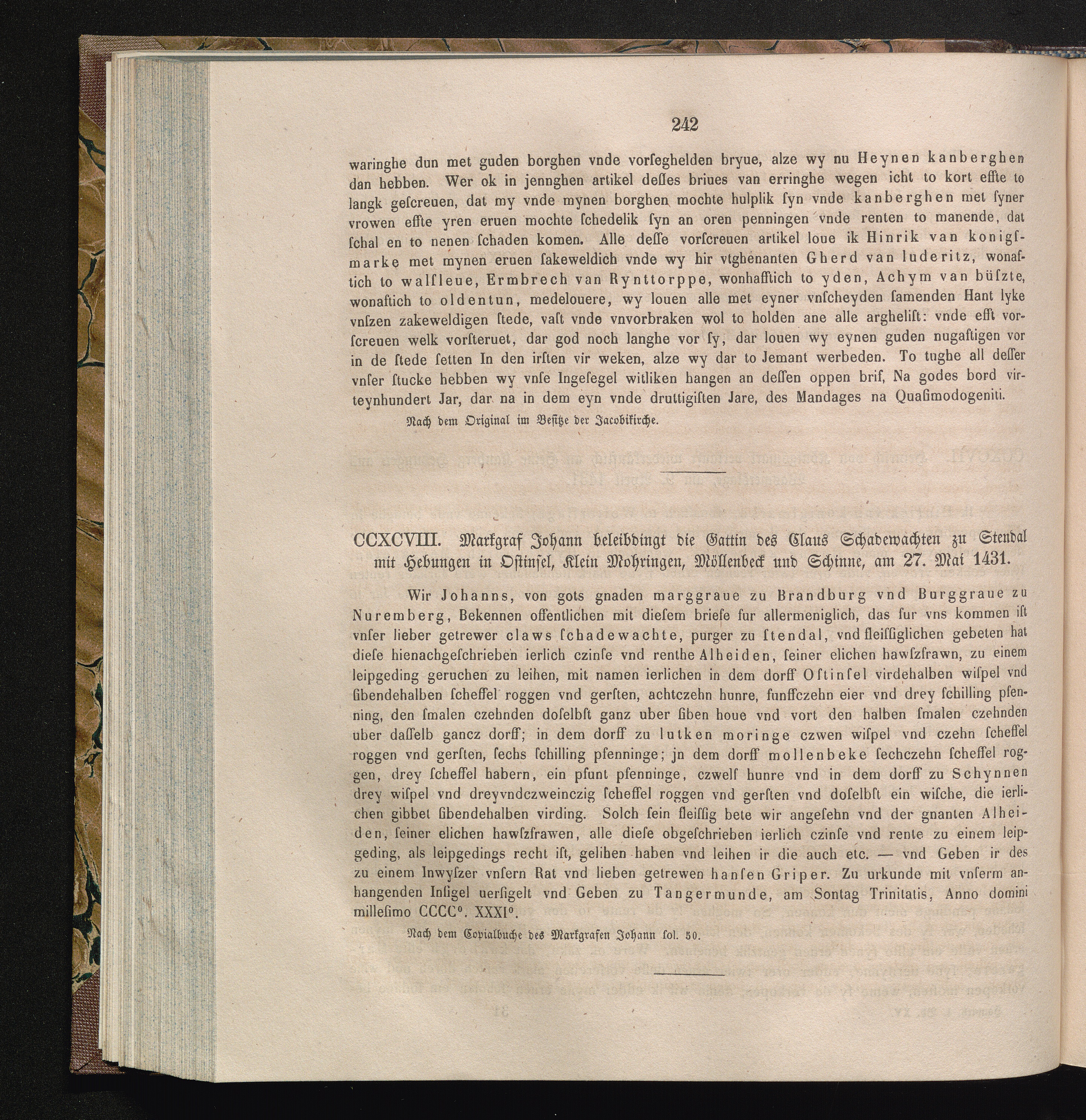 CCXCVIII. Markgraf Johann beleibdingt die Gattin des Claus Schadewachten zu Stendal[...]
