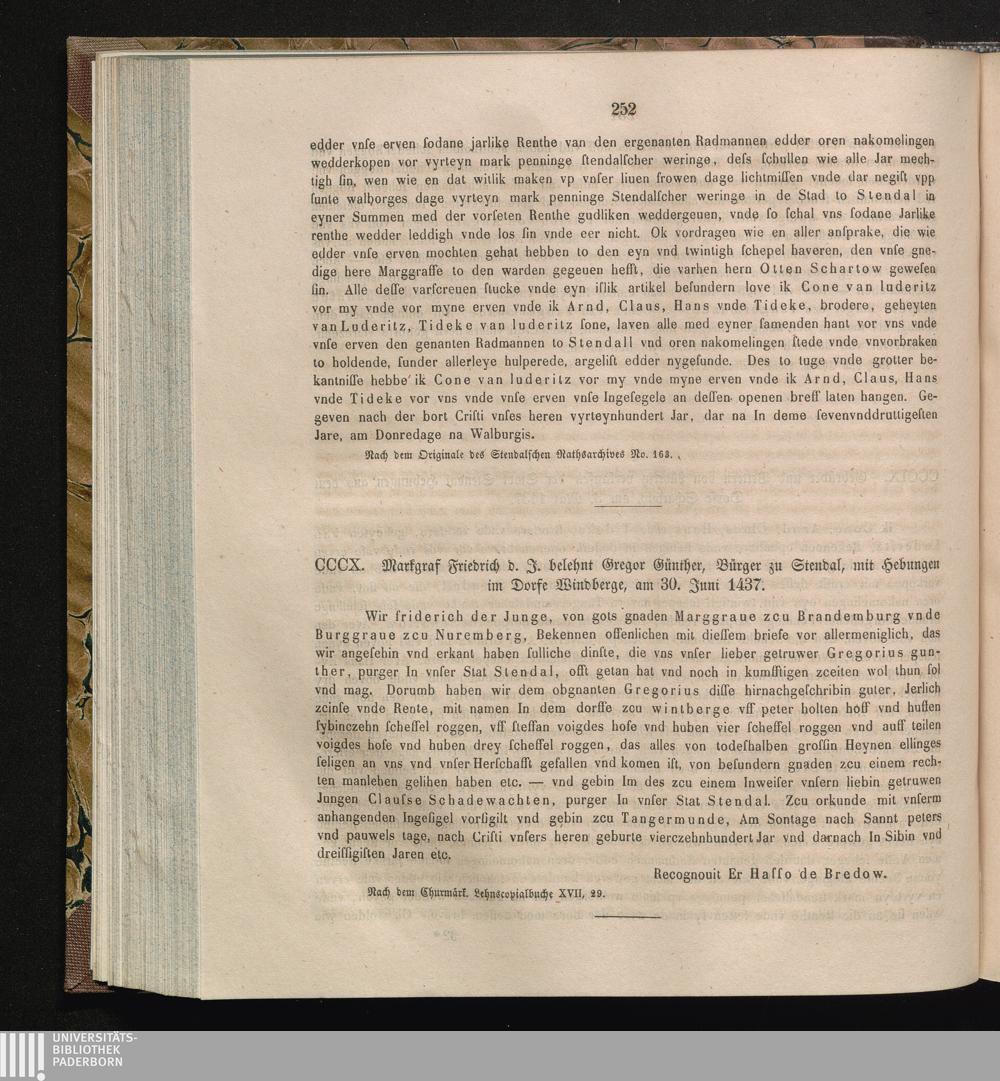 CCCX. Markgraf Friedrich d. J. belehnt Gregor Günther, Bürger zu Stendal, mit Hebungen[...]