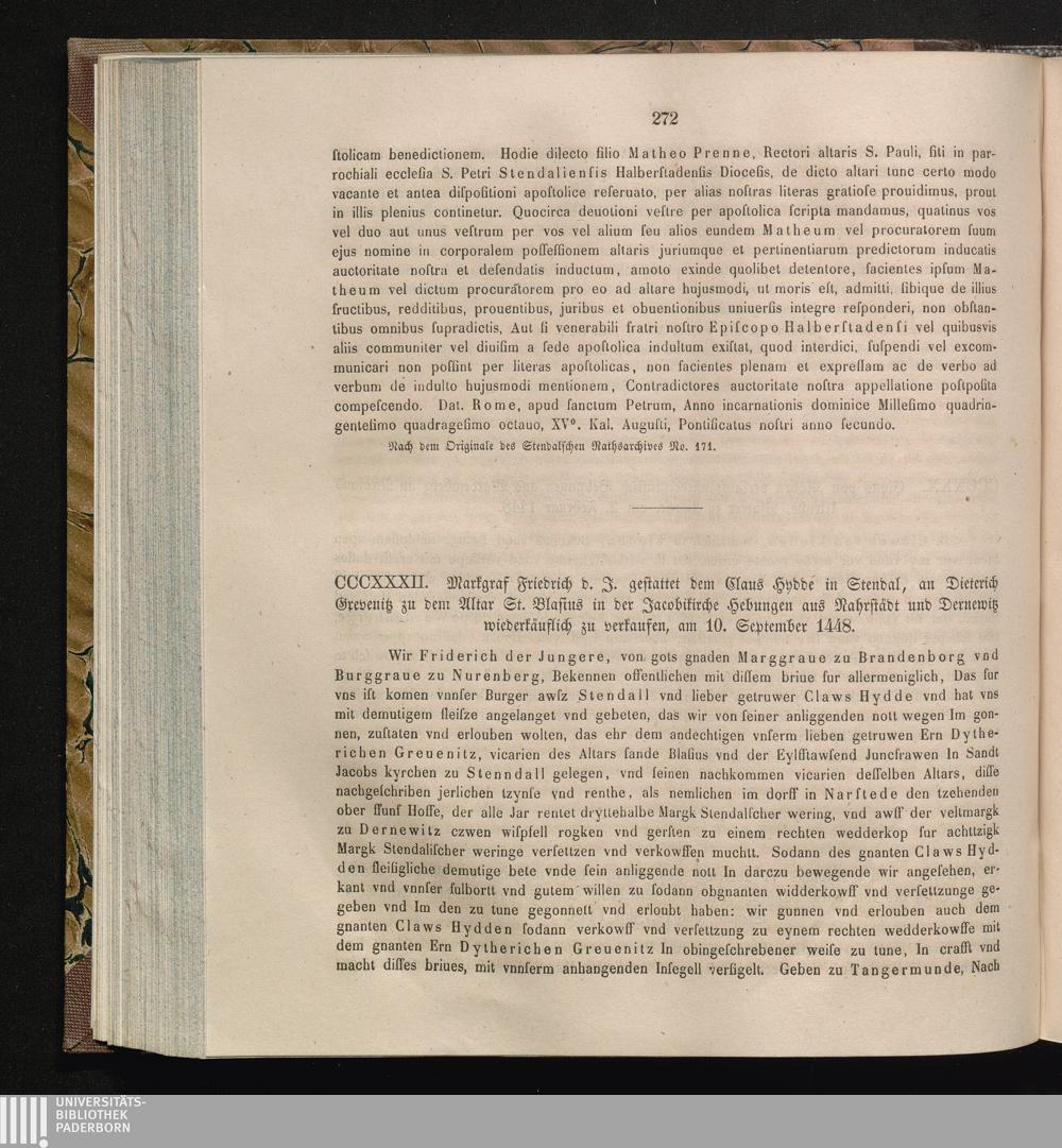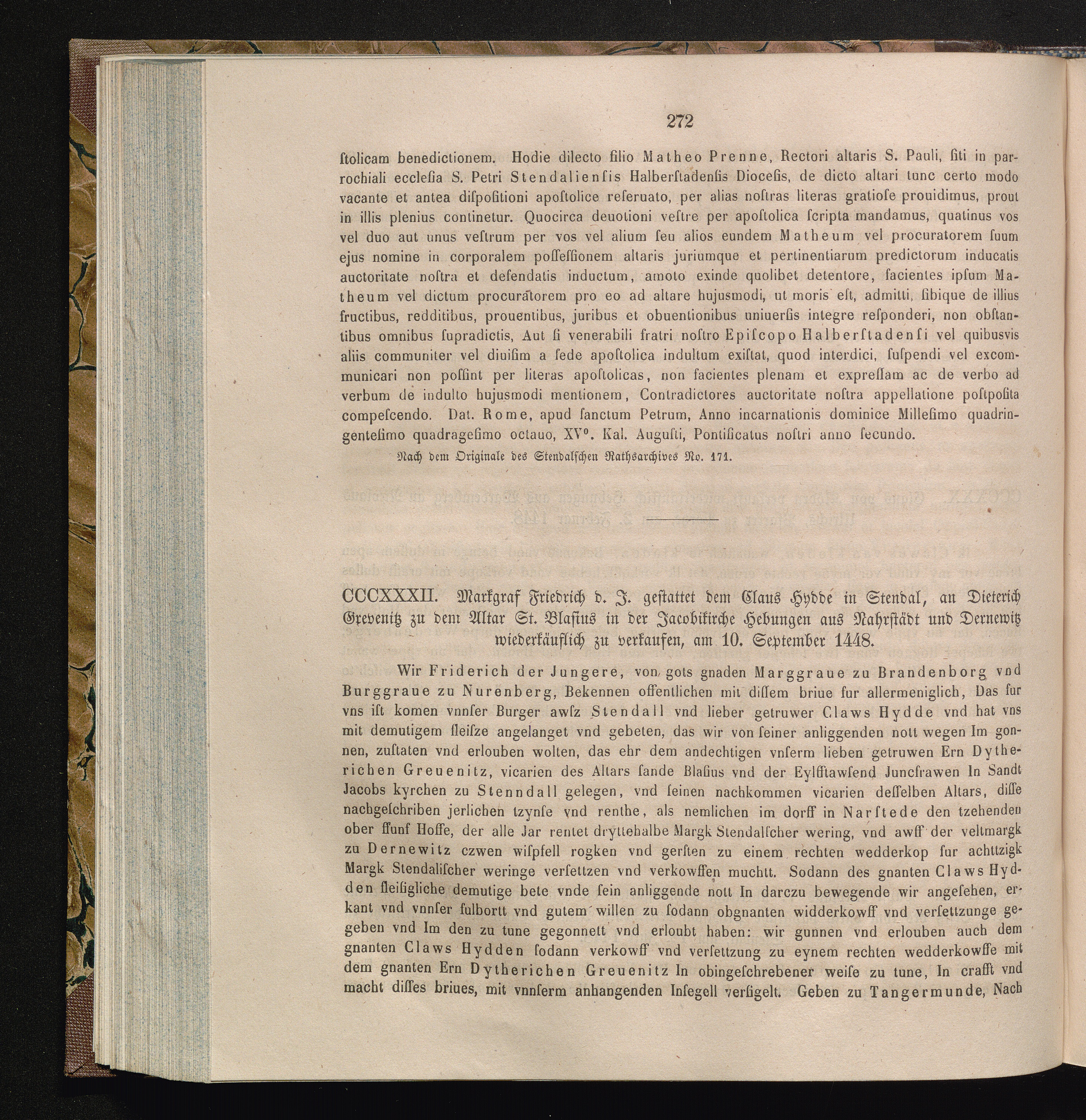 CCCXXXII. Markgraf Friedrich d. J. gestattet dem Claus Hydde in Stendal, an Dieterich[...]