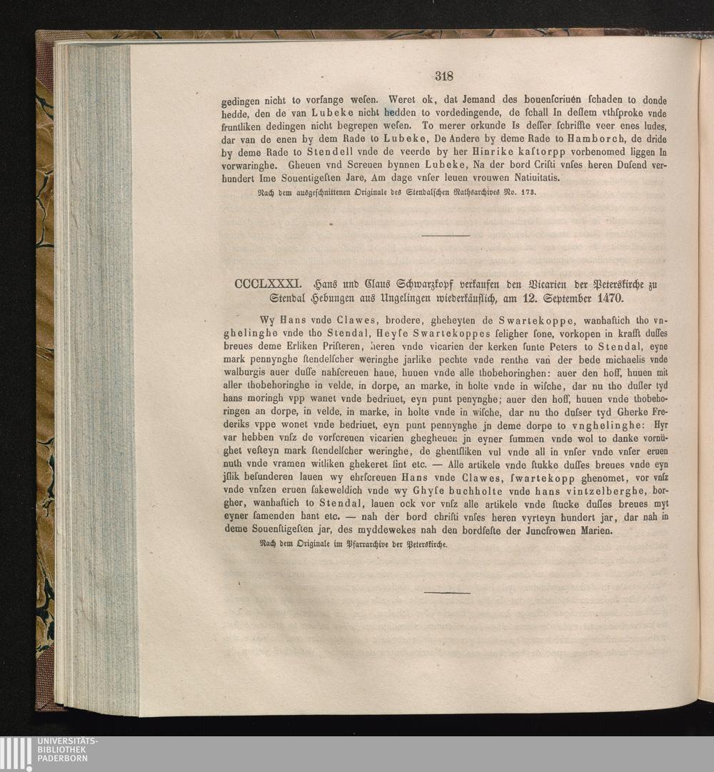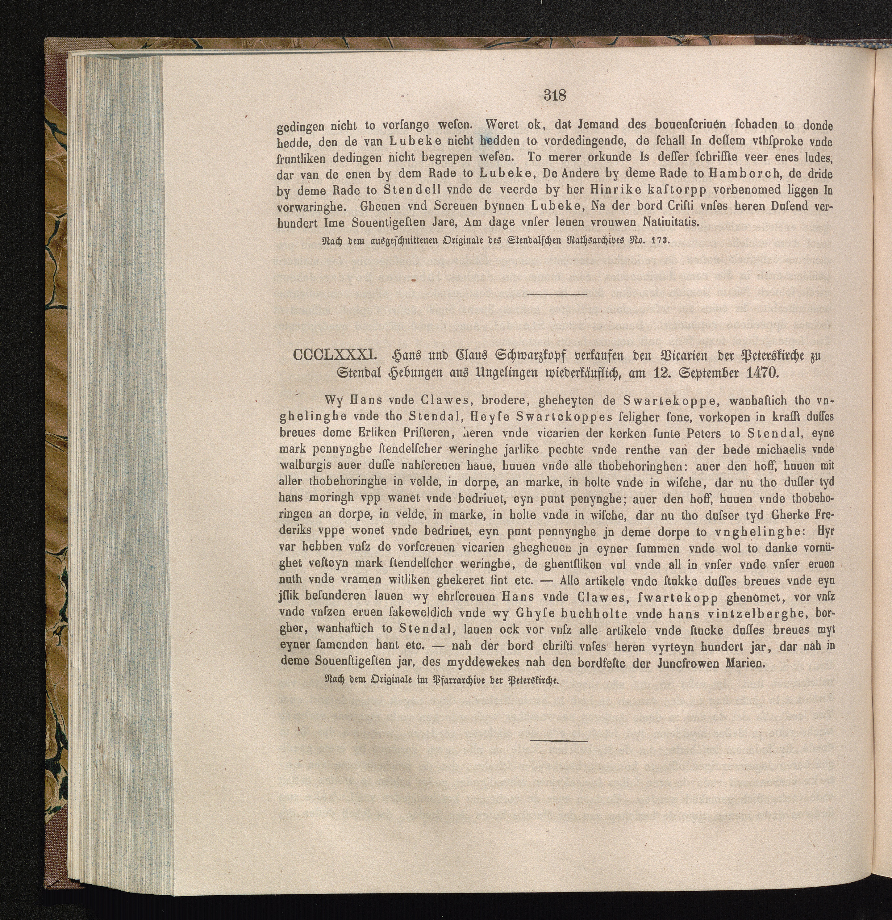 CCCLXXXI. Hans und Claus Schwarzkopf verkaufen den Vicarien der Peterskirche zu Stendal[...]