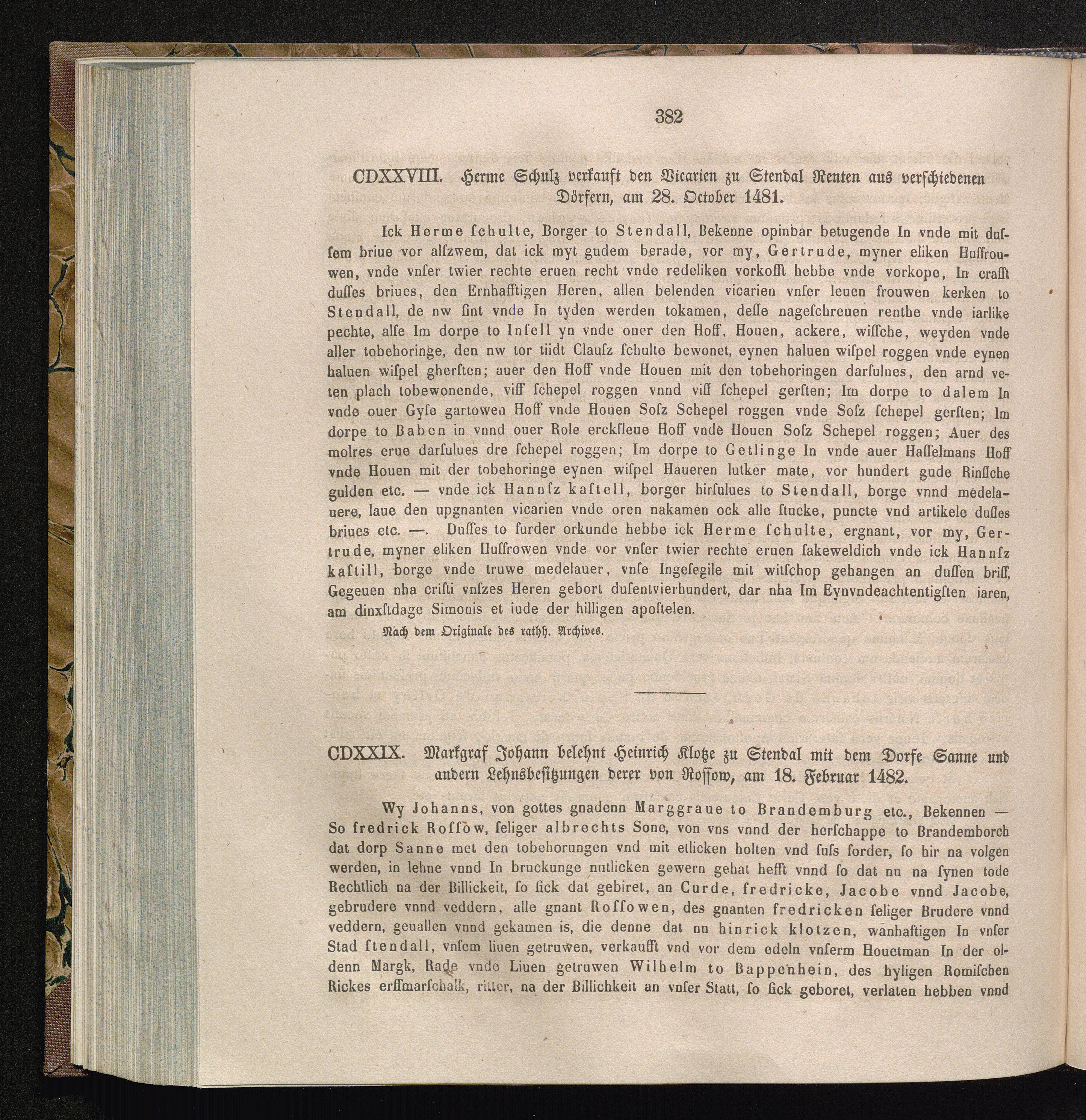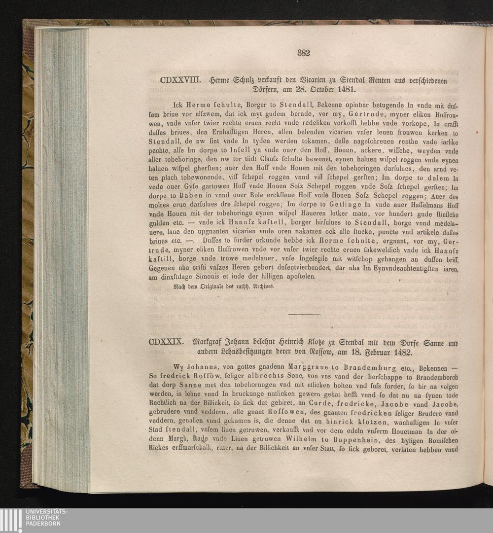 CDXXIX. Markgraf Johann belehnt Heinrich Klotze zu Stendal mit dem Dorfe Sanne und[...]