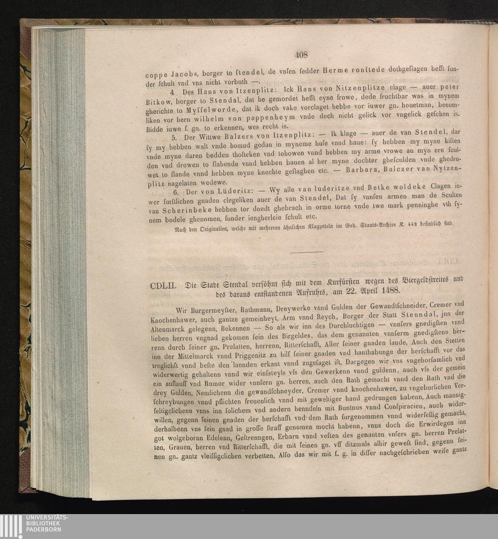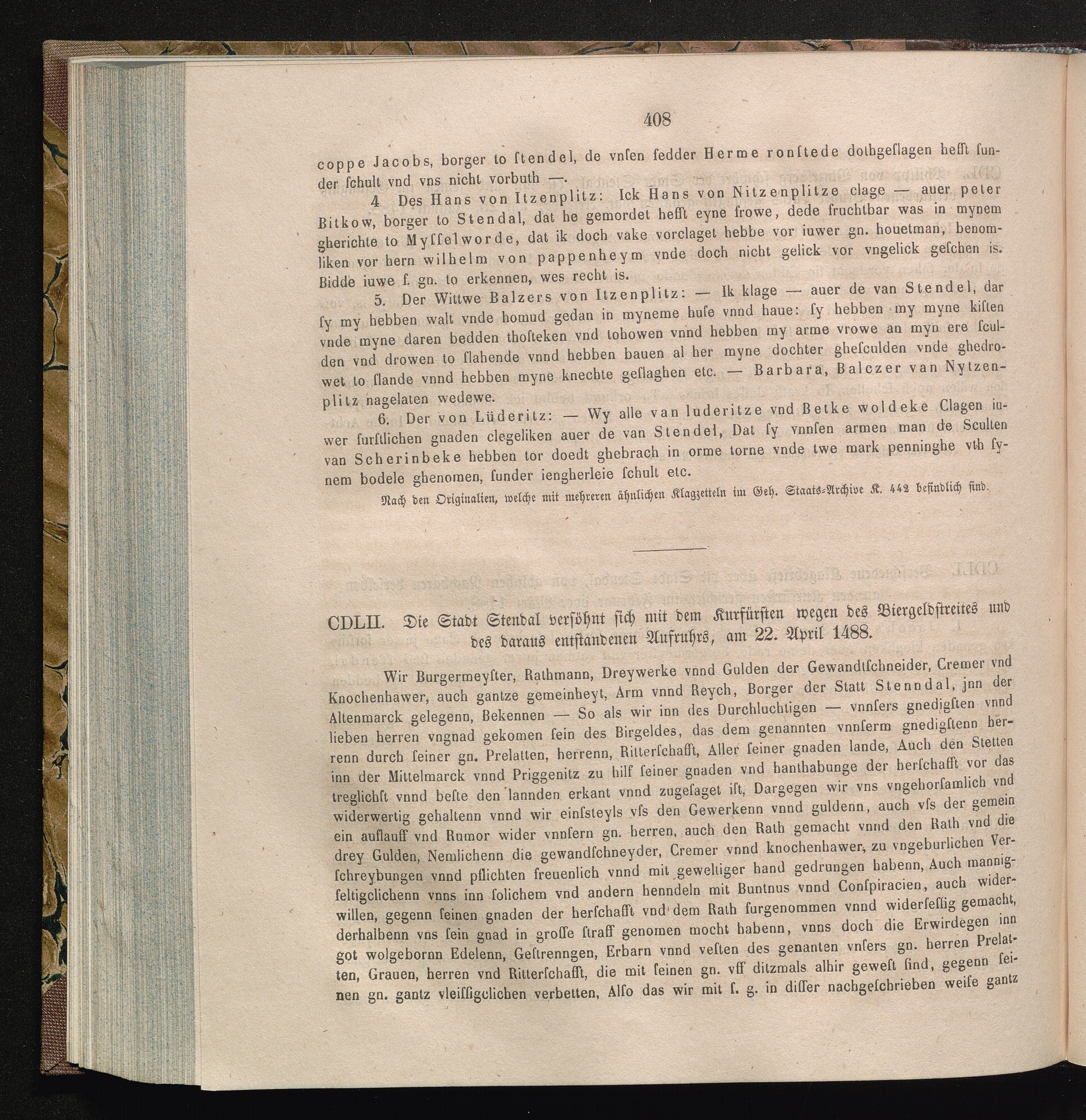 CDLII. Die Stadt Stendal versöhnt sich mit dem Kurfürsten wegen des Biergeldstreites[...]