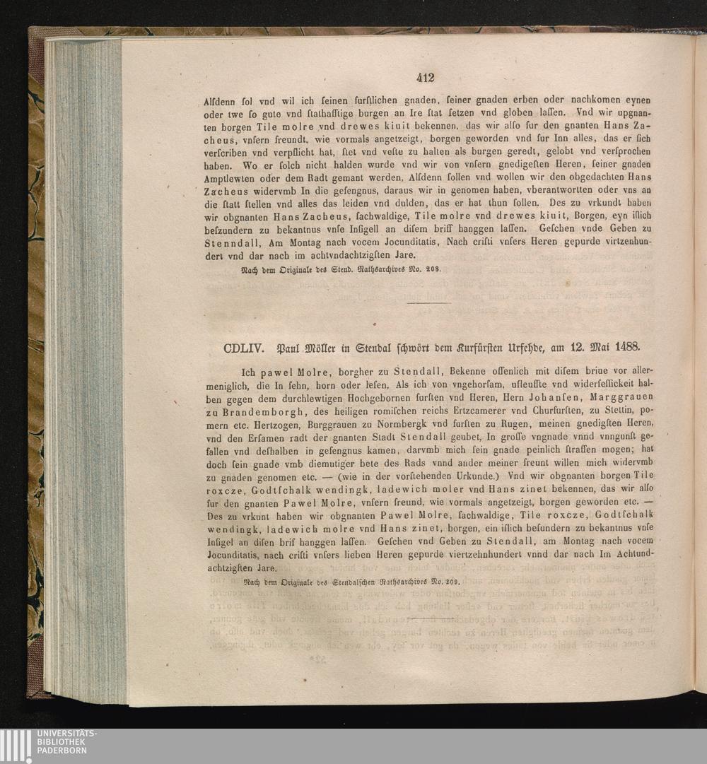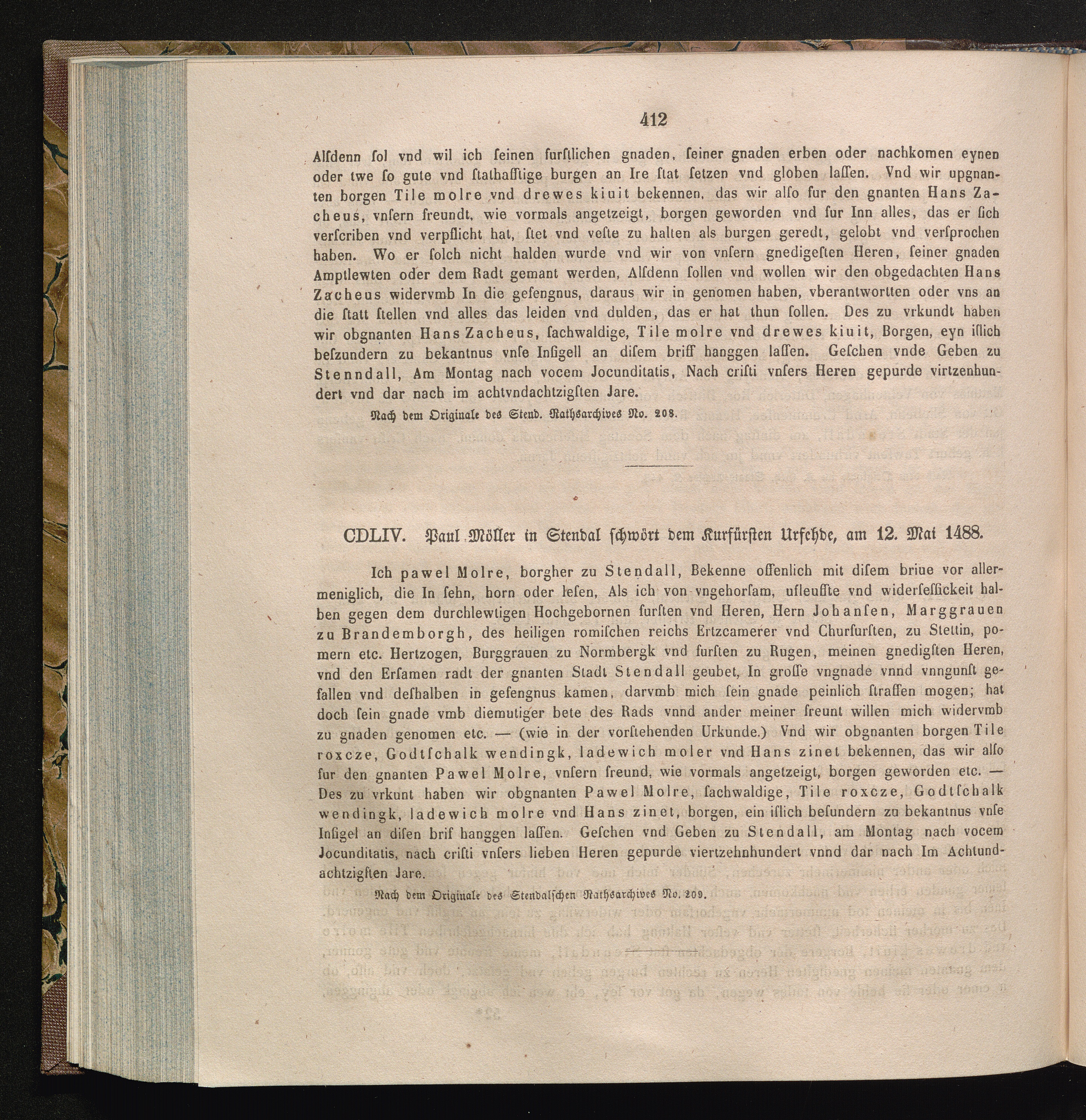 CDLIV. Paul Möller in Stendal schwört dem Kurfürsten Urfehde, am 12. Mai 1488.