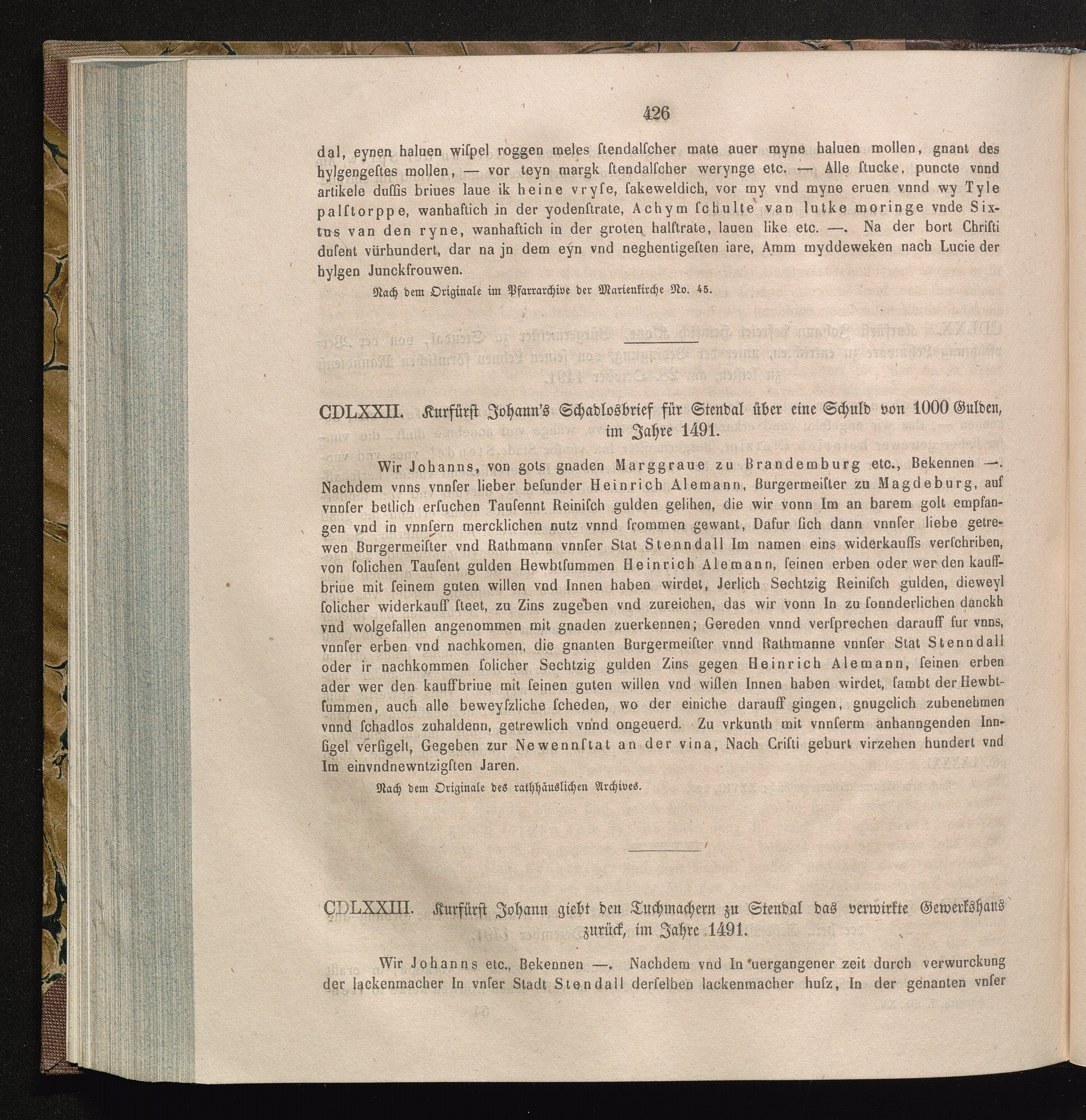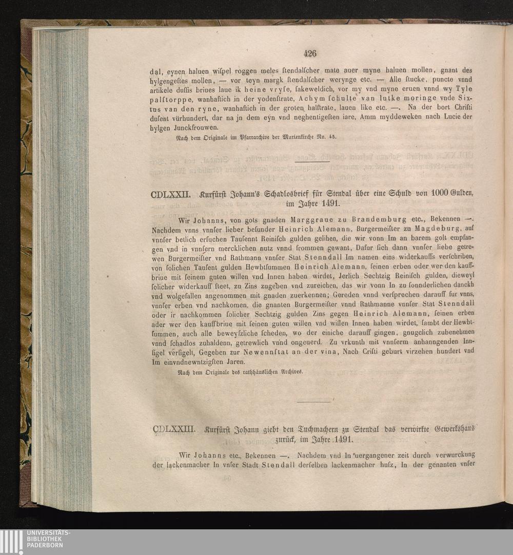 CDLXXIII. Kurfürst Johann giebt den Tuchmachern zu Stendal das verwirkte Gewerkshaus[...]