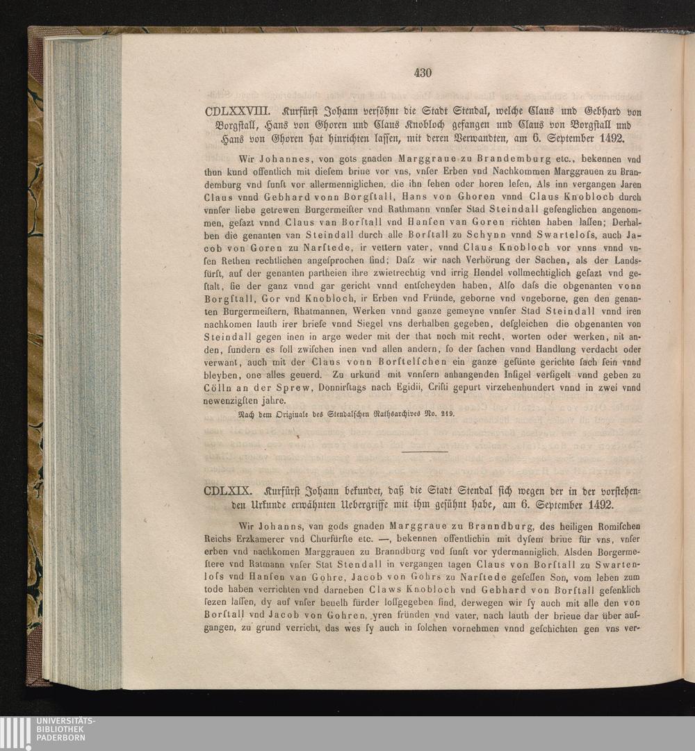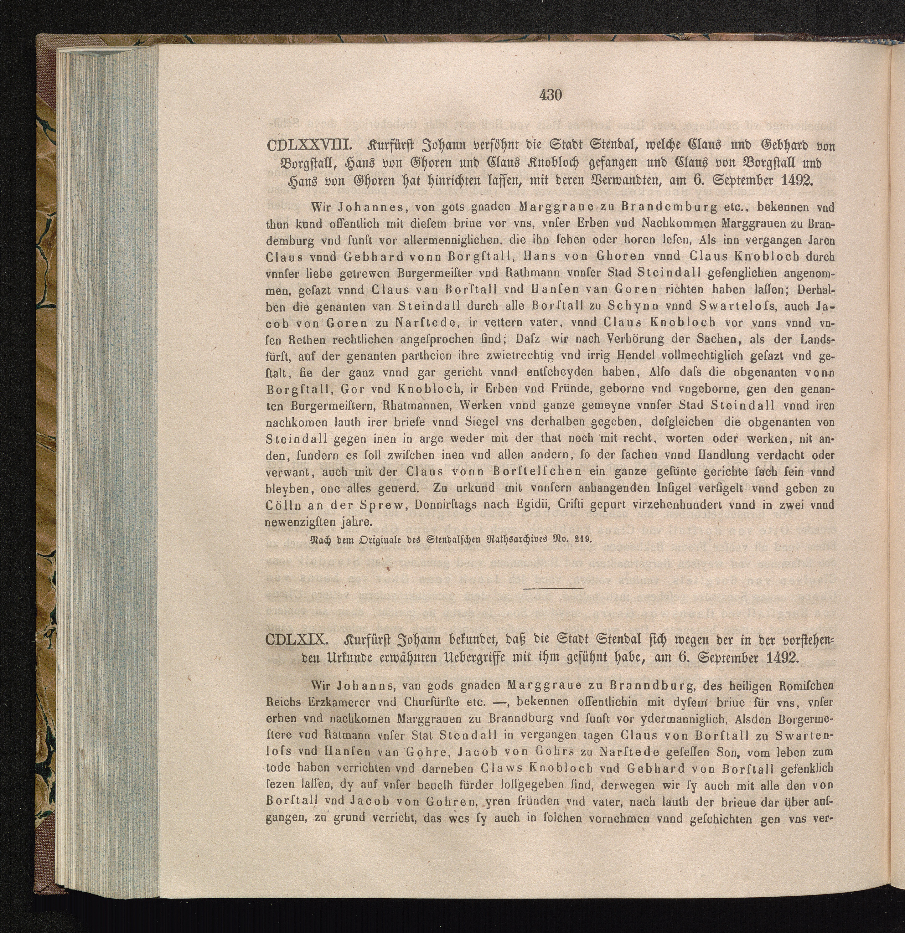 CDLXXIX. Kurfürst Johann bekundet, daß die Stadt Stendal sich wegen der in der vorstehenden[...]