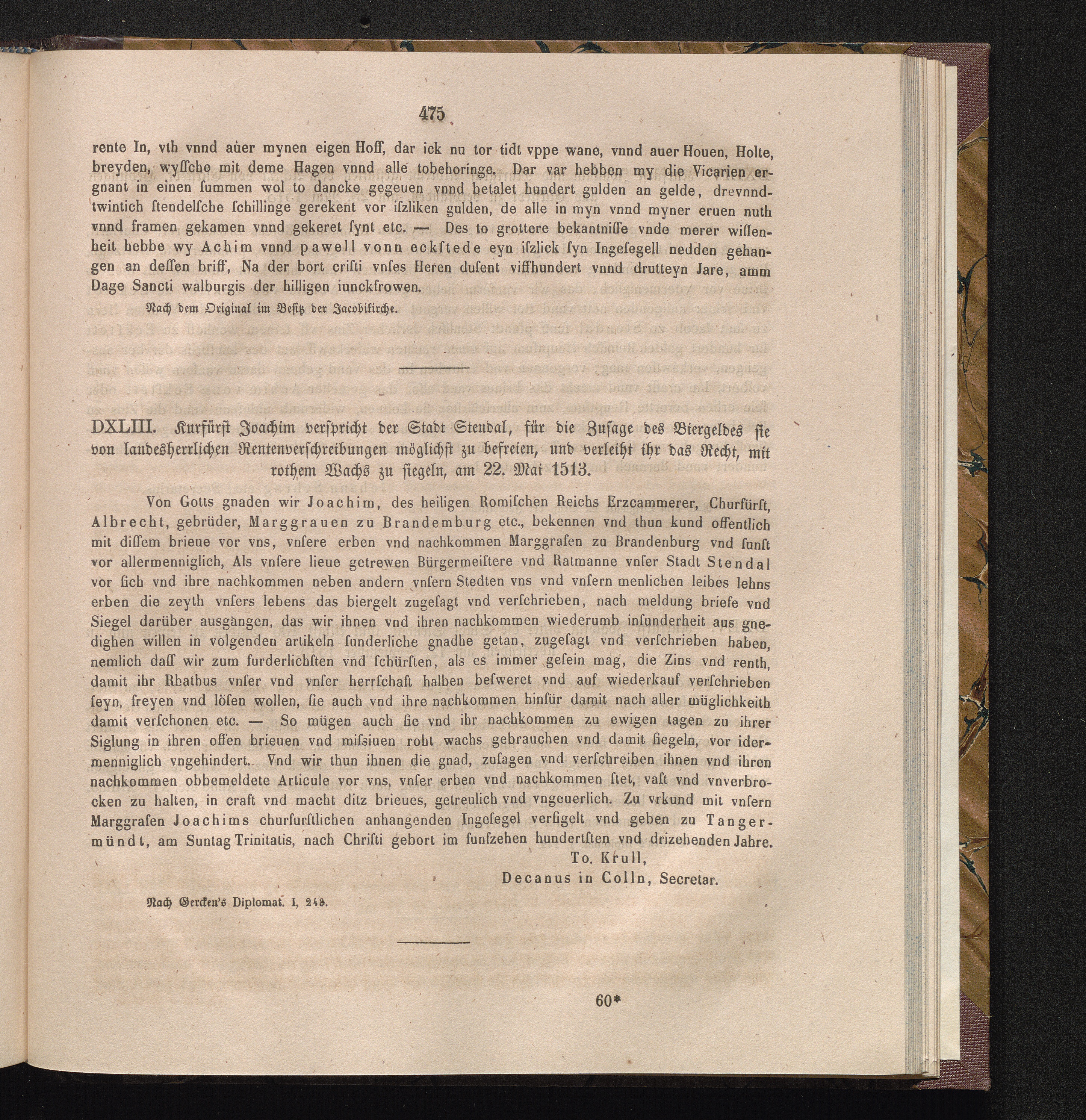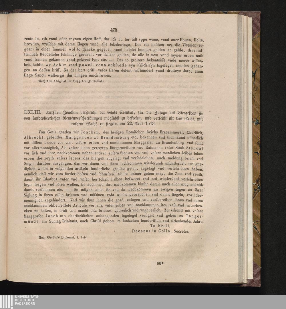 DXLIII. Kurfürst Joachim verspricht der Stadt Stendal, für die Zusage des Biergeldes[...]