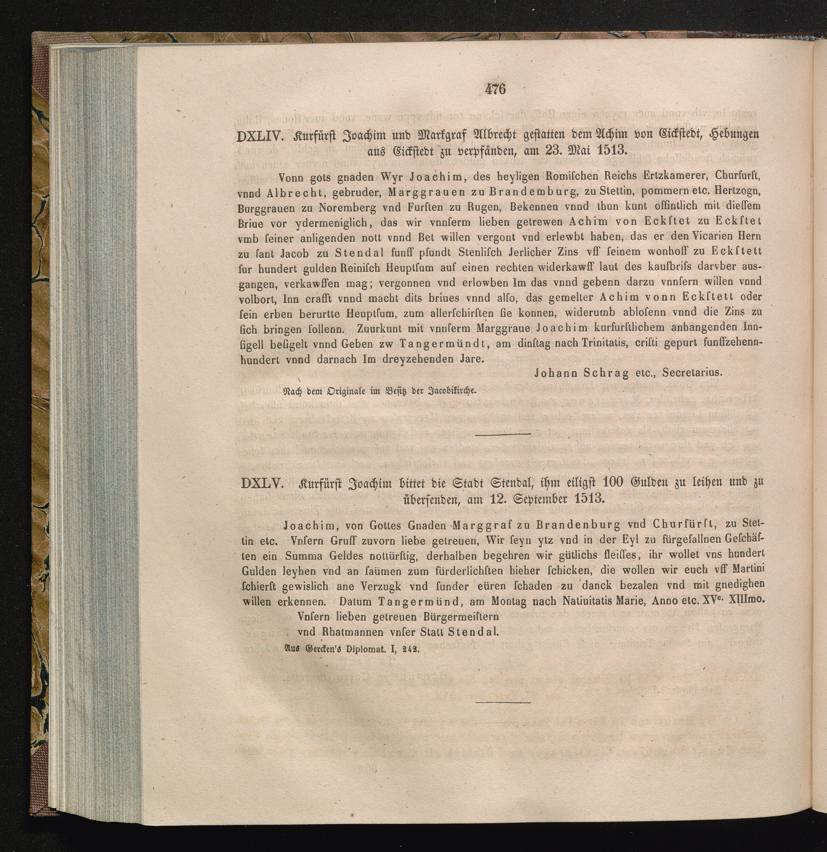 DXLV. Kurfürst Joachim bittet die Stadt Stendal, ihm eiligst 100 Gulden zu leihen[...]