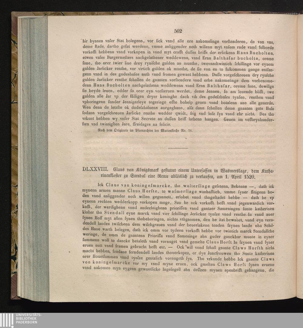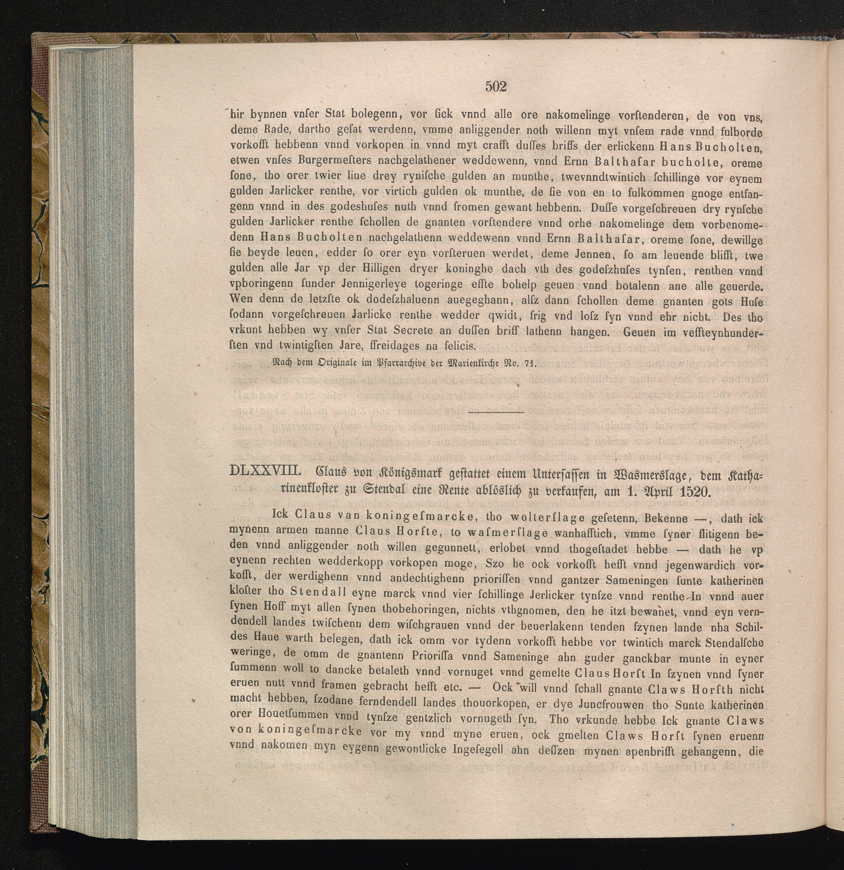 DLXXVIII. Claus von Königsmark gestattet einem Untersassen in Wasmerslage, dem Katharinenkloster[...]