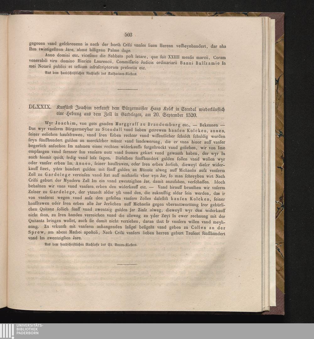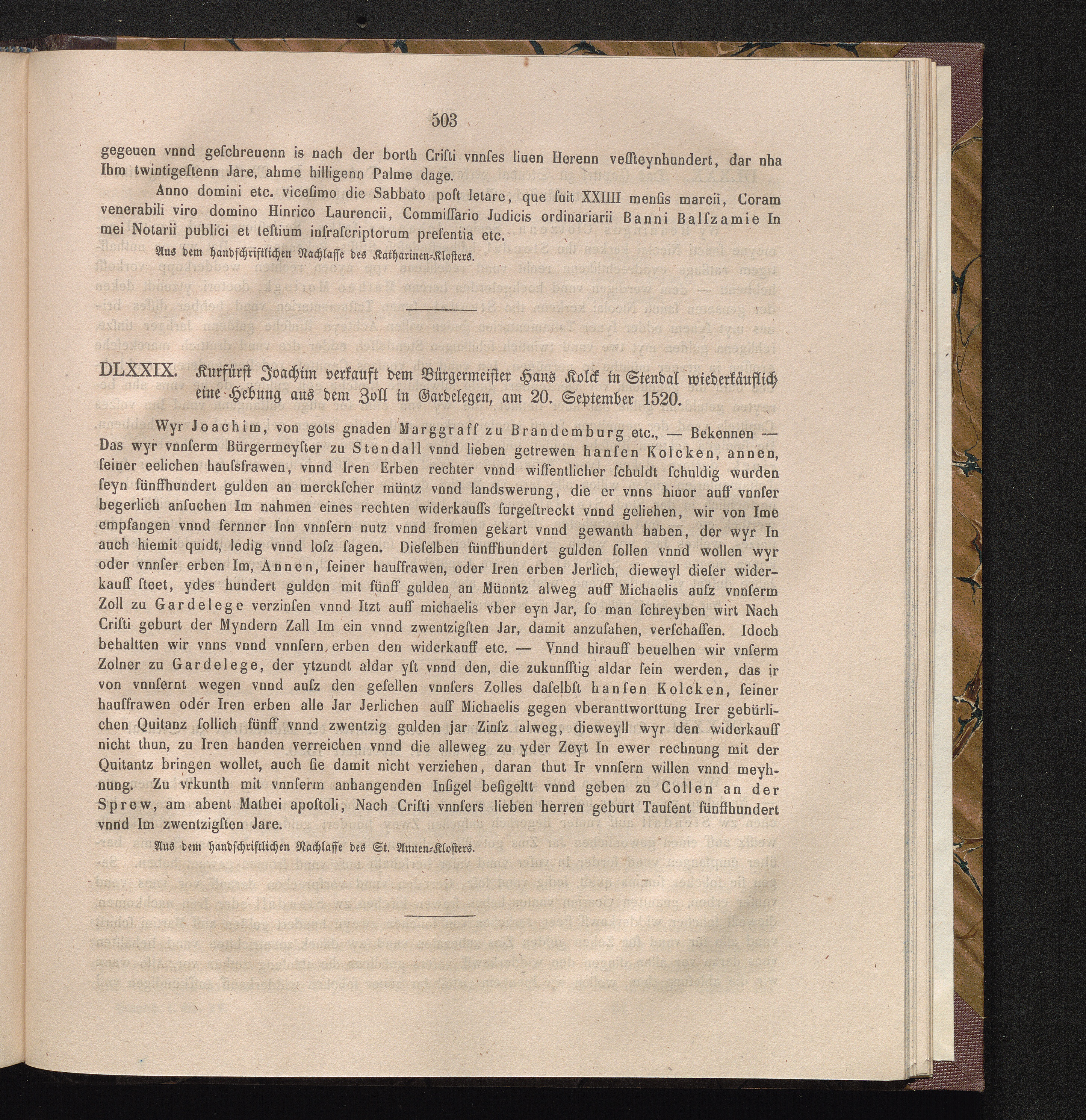 DLXXIX. Kurfürst Joachim verkauft dem Bürgermeister Hans Kolck in Stendal wiederkäuflich[...]