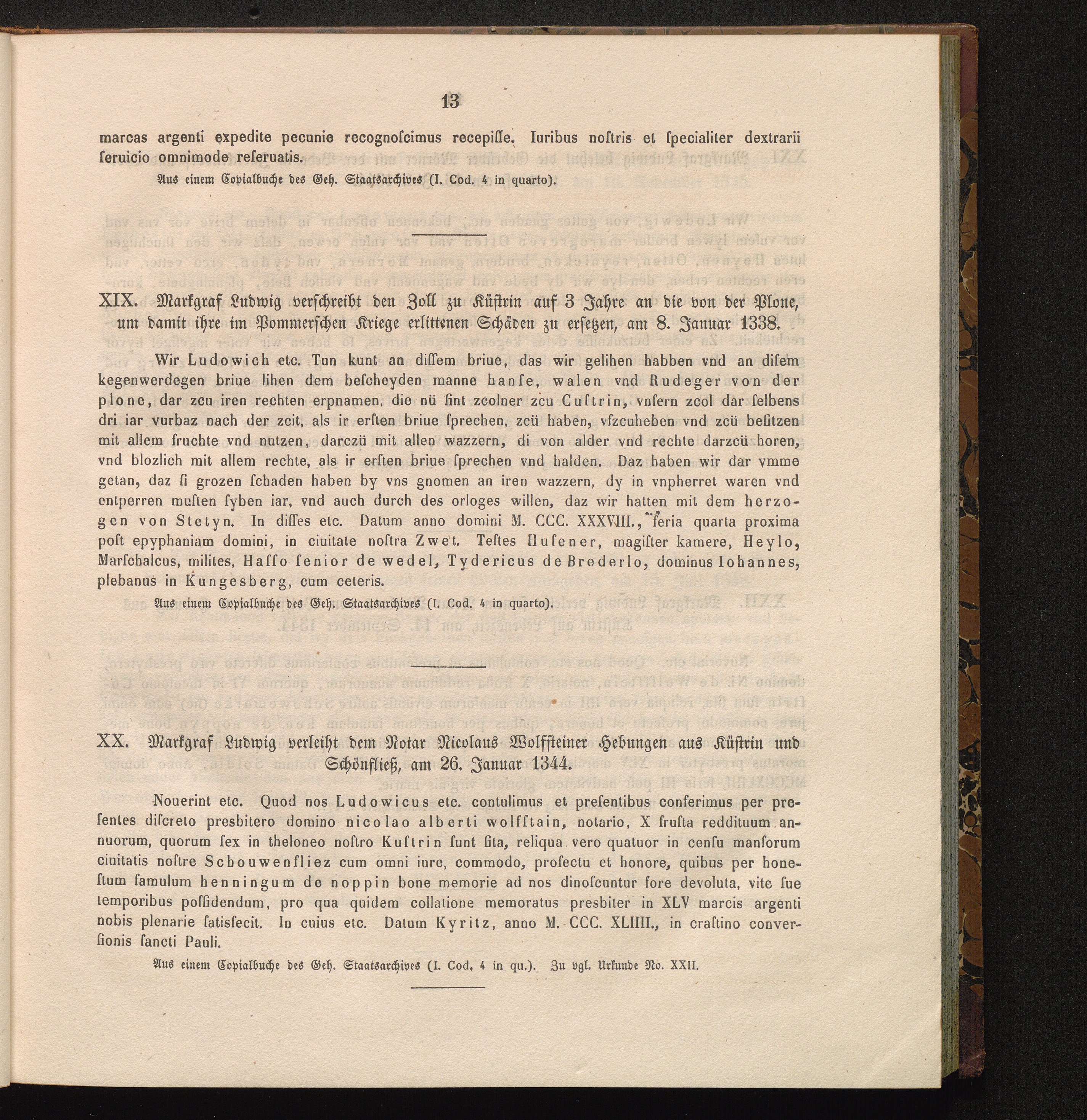 XIX. Markgraf Ludwig verschreibt den Zoll zu Küstrin auf 3 Jahre an die von der Plone,[...]