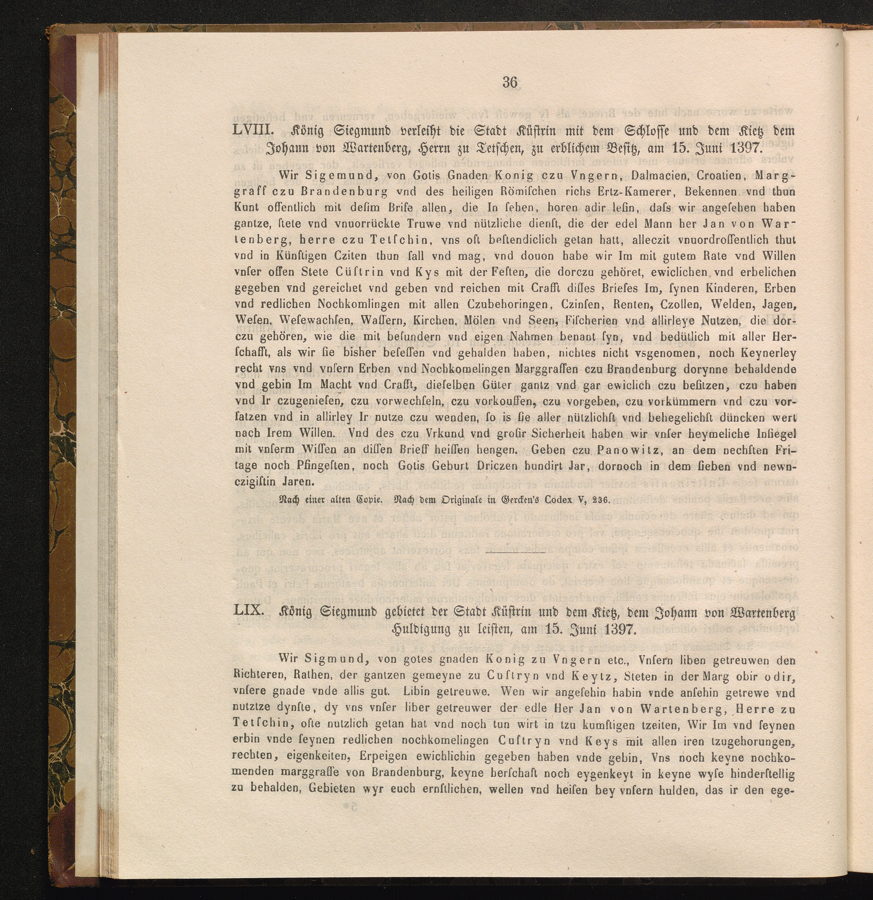LVIII. König Siegmund verleiht die Stadt Küstrin mit dem Schlosse und dem Kietz dem[...]