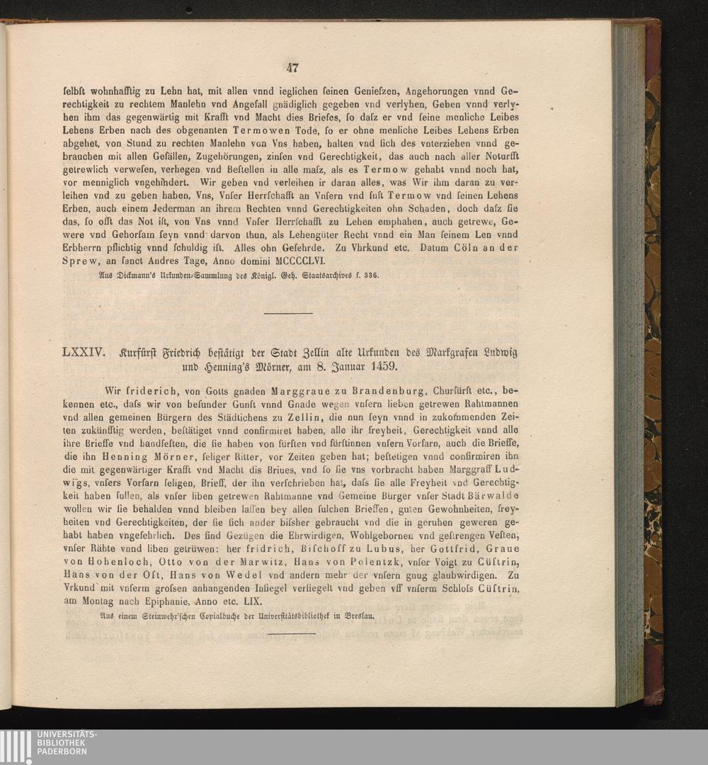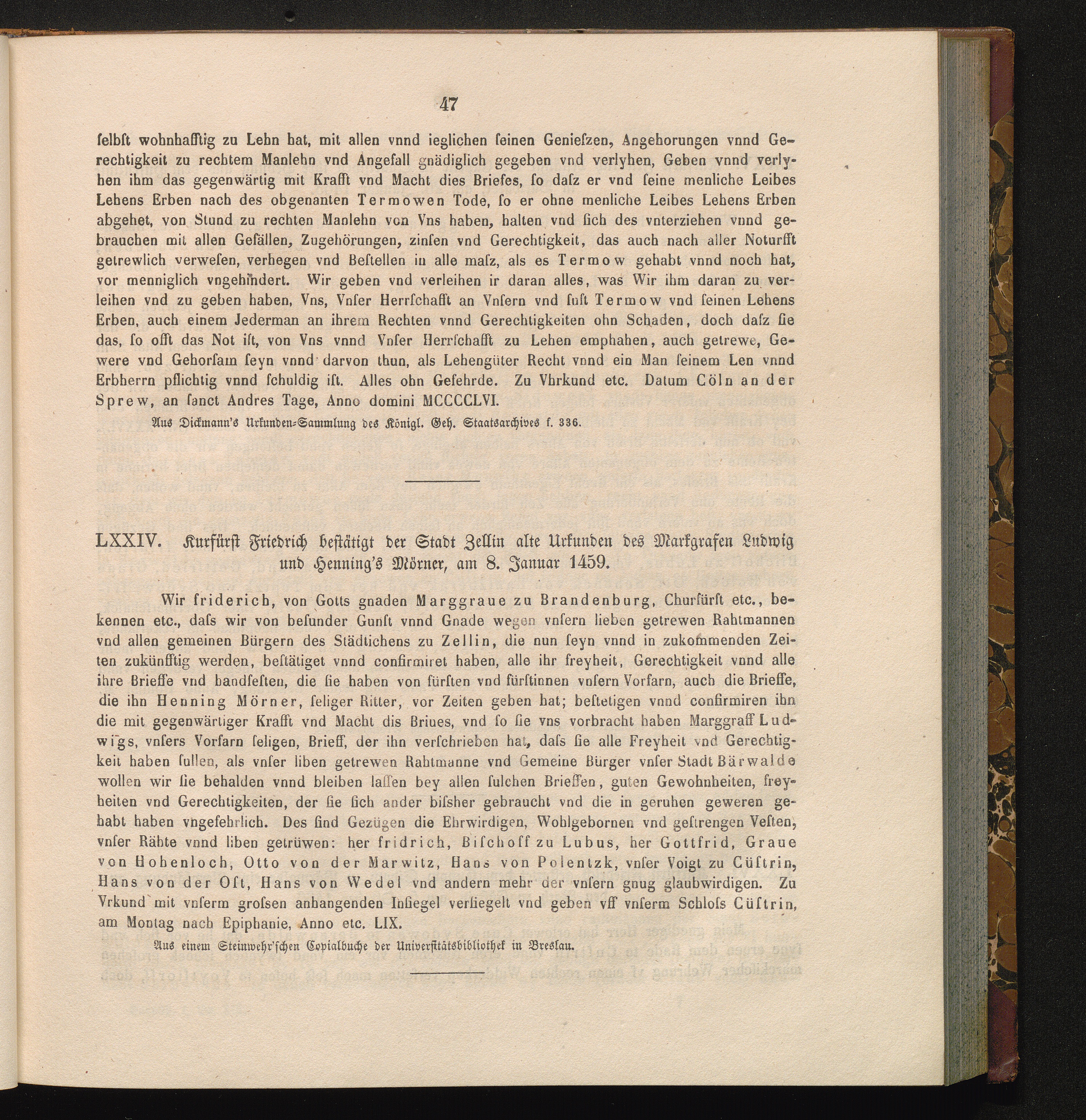 LXXIV. Kurfürst Friedrich bestätigt der Stadt Zellin alte Urkunden des Markgrafen[...]