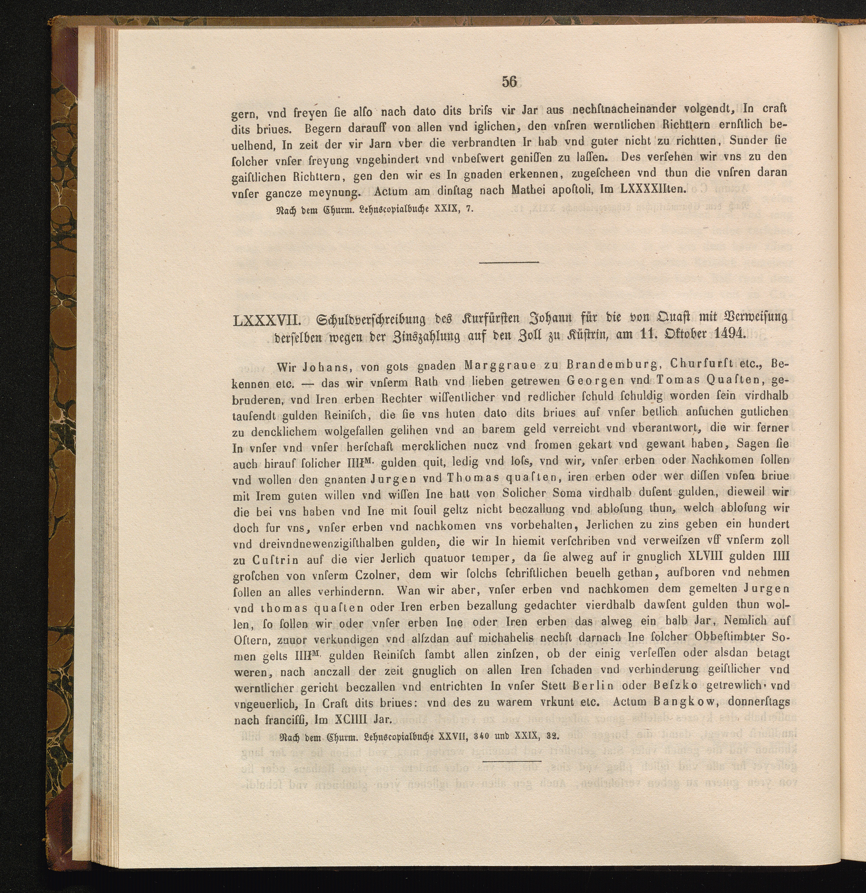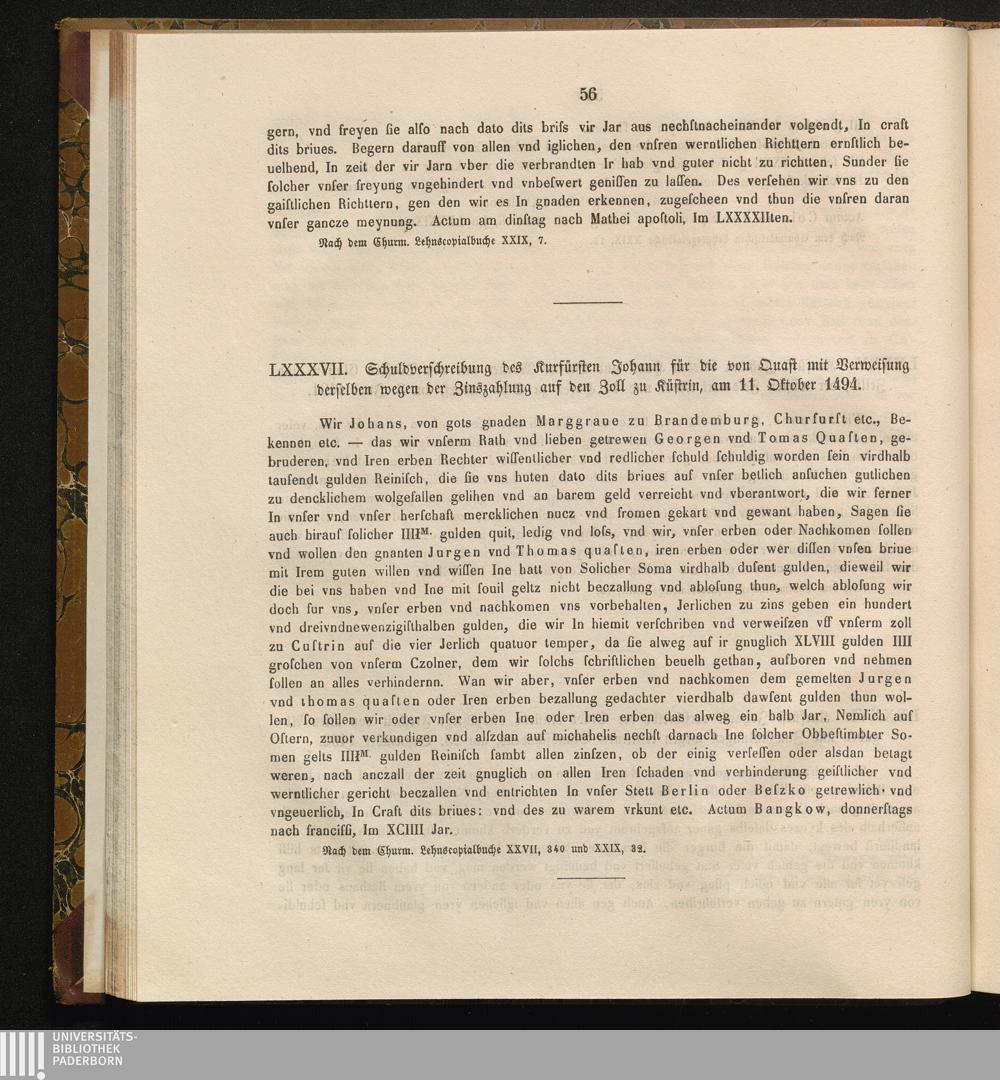 LXXXVII. Schuldverschreibung des Kurfürsten Johann für die von Quast mit Verweisung[...]