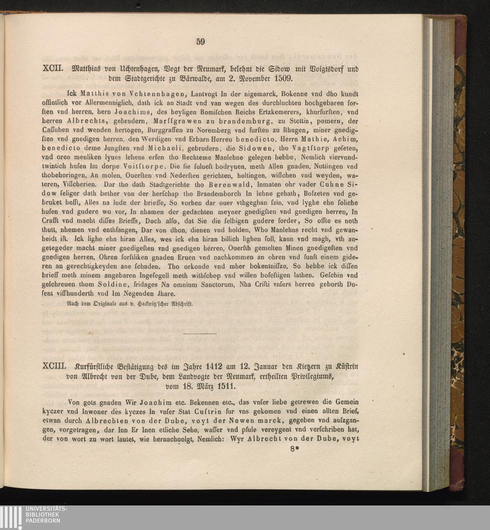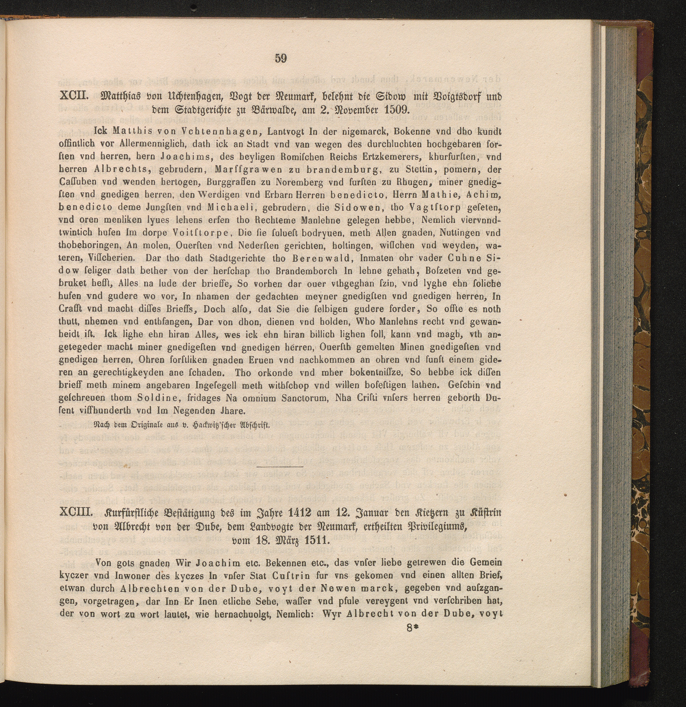XCII. Matthias von Uchtenhagen, Vogt der Neumark, belehnt die Sidow mit Voigtsdorf[...]