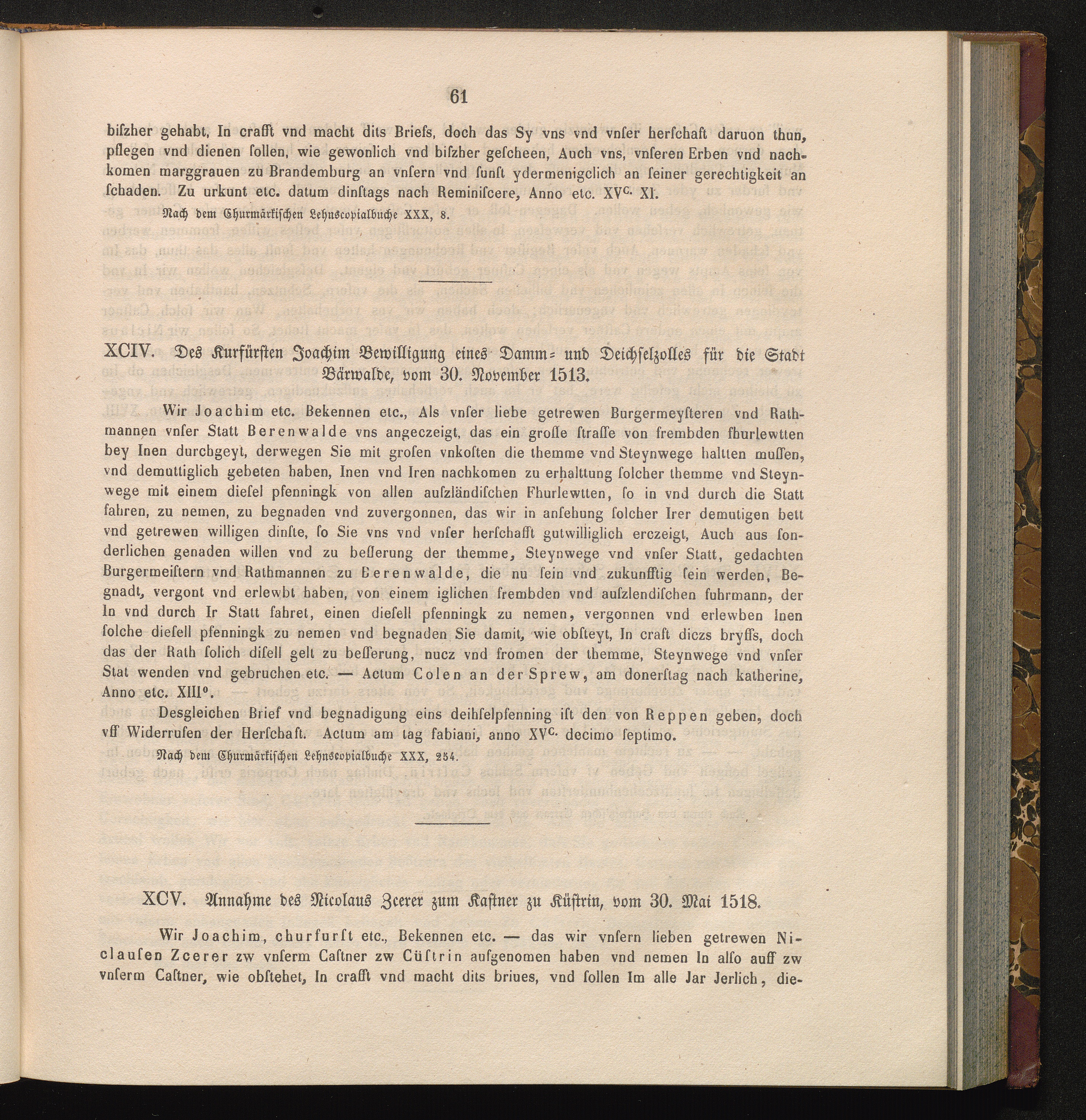 XCIV. Des Kurfürsten Joachim Bewilligung eines Damm- und Deichselzolles für die Stadt[...]
