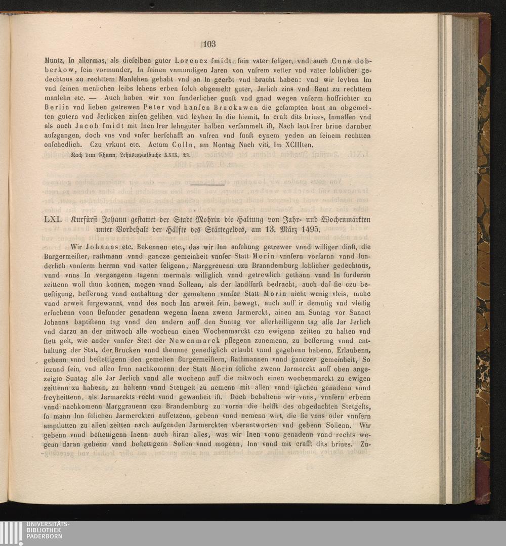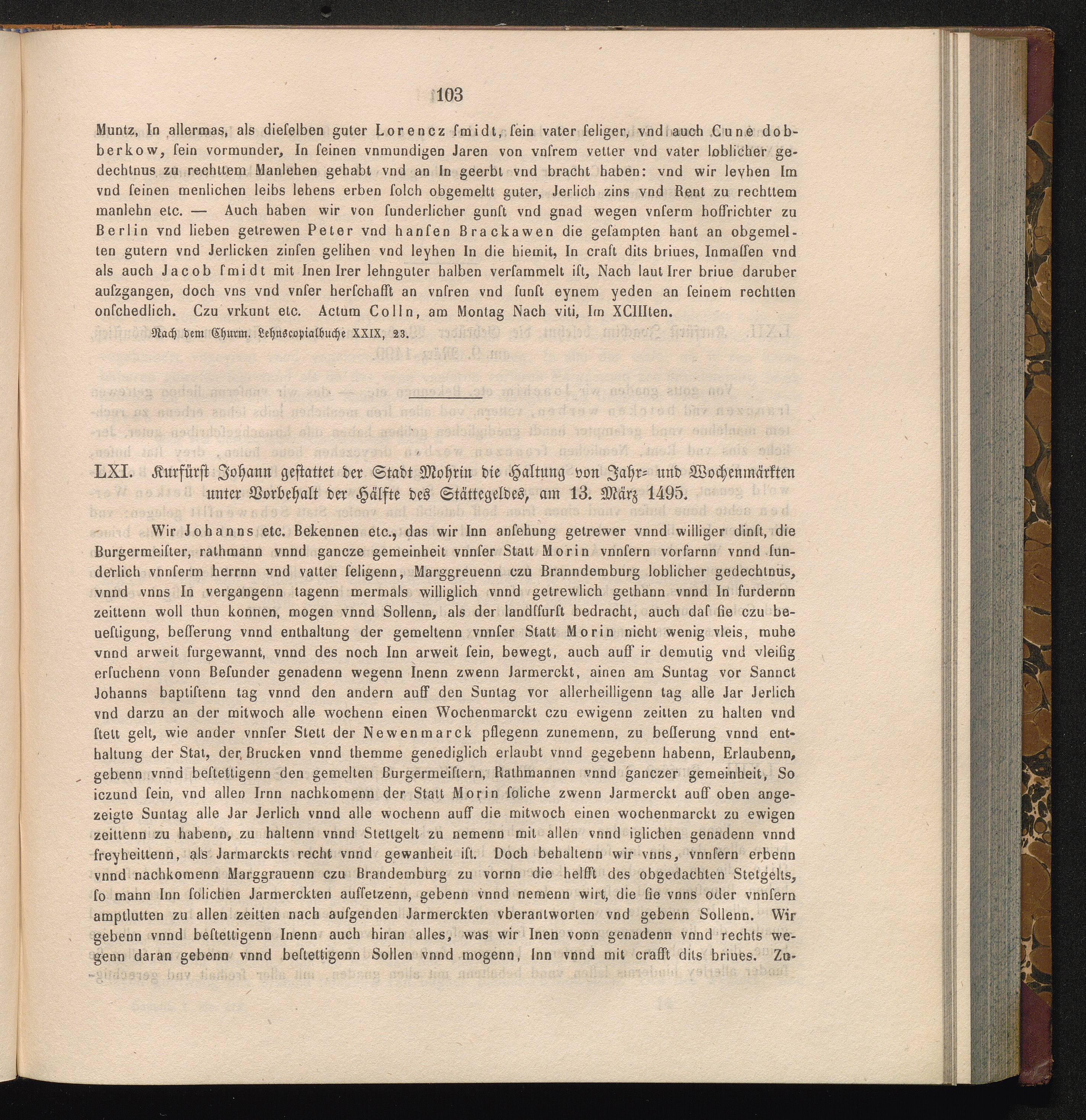 LXI. Kurfürst Johann gestattet der Stadt Mohrin die Haltung von Jahr- und Wochenmärkten[...]