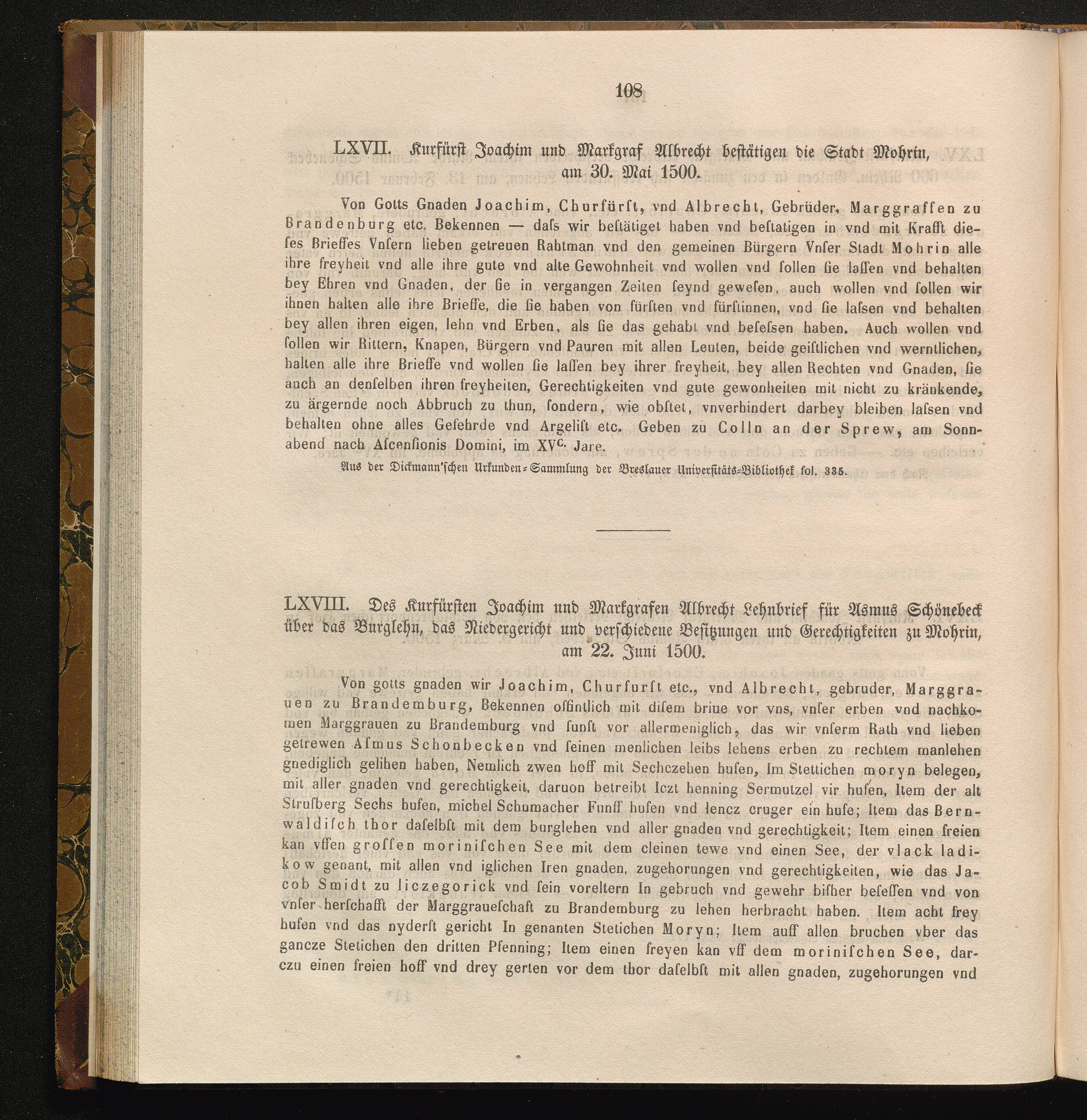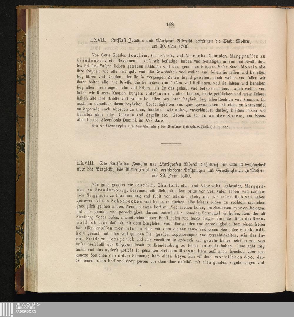 LXVII. Kurfürst Joachim und Markgraf Albrecht bestätigen die Stadt Mohrin, am 30.[...]