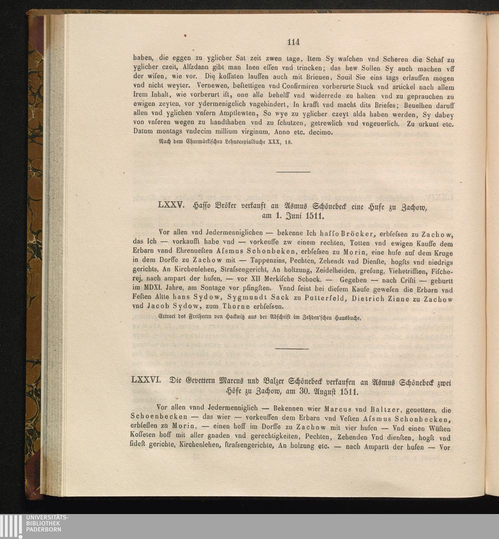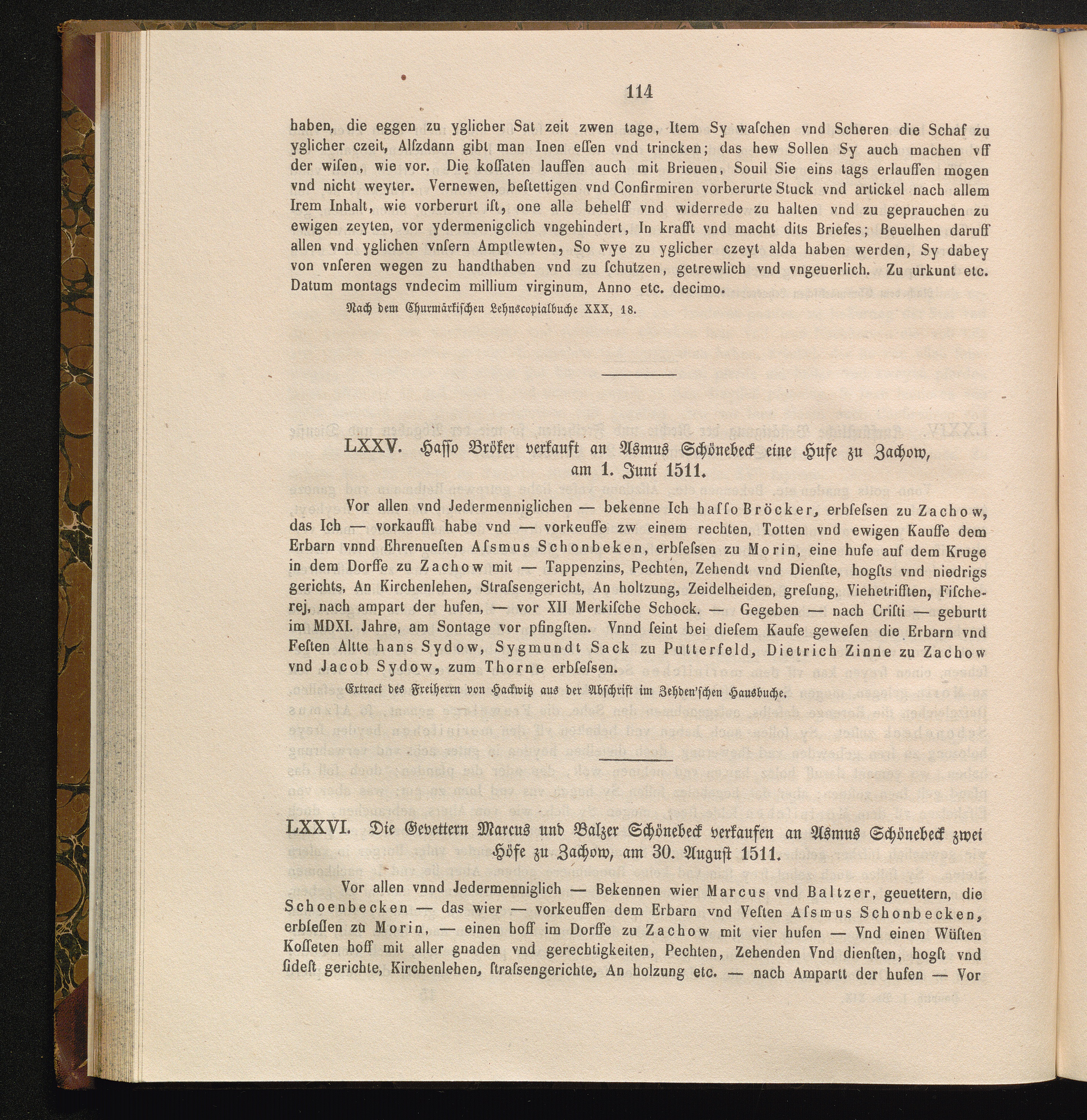 LXXV. Hasso Bröker verkauft an Asmus Schönebeck eine Hufe zu Zachow, am 1. Juni [...]