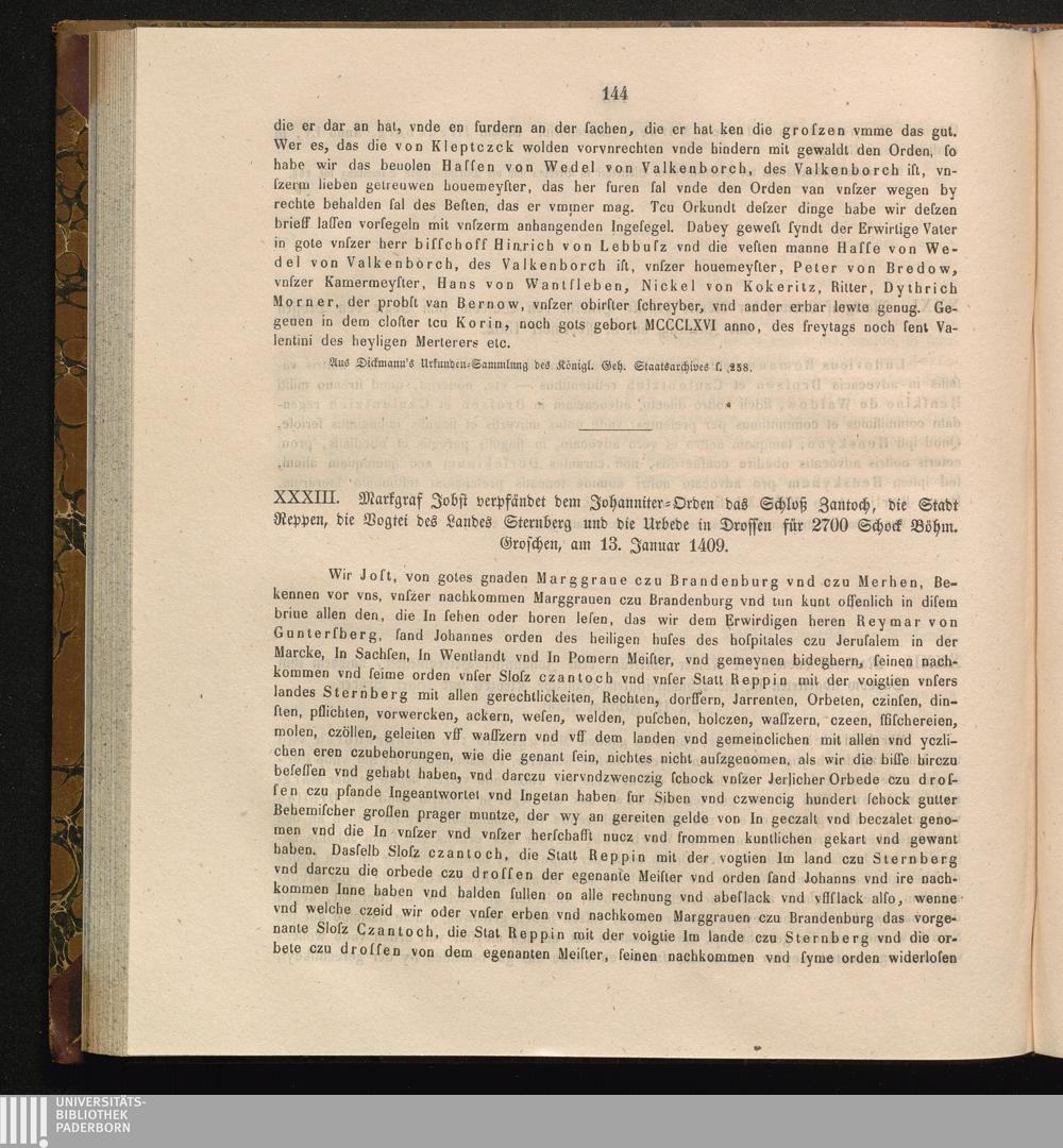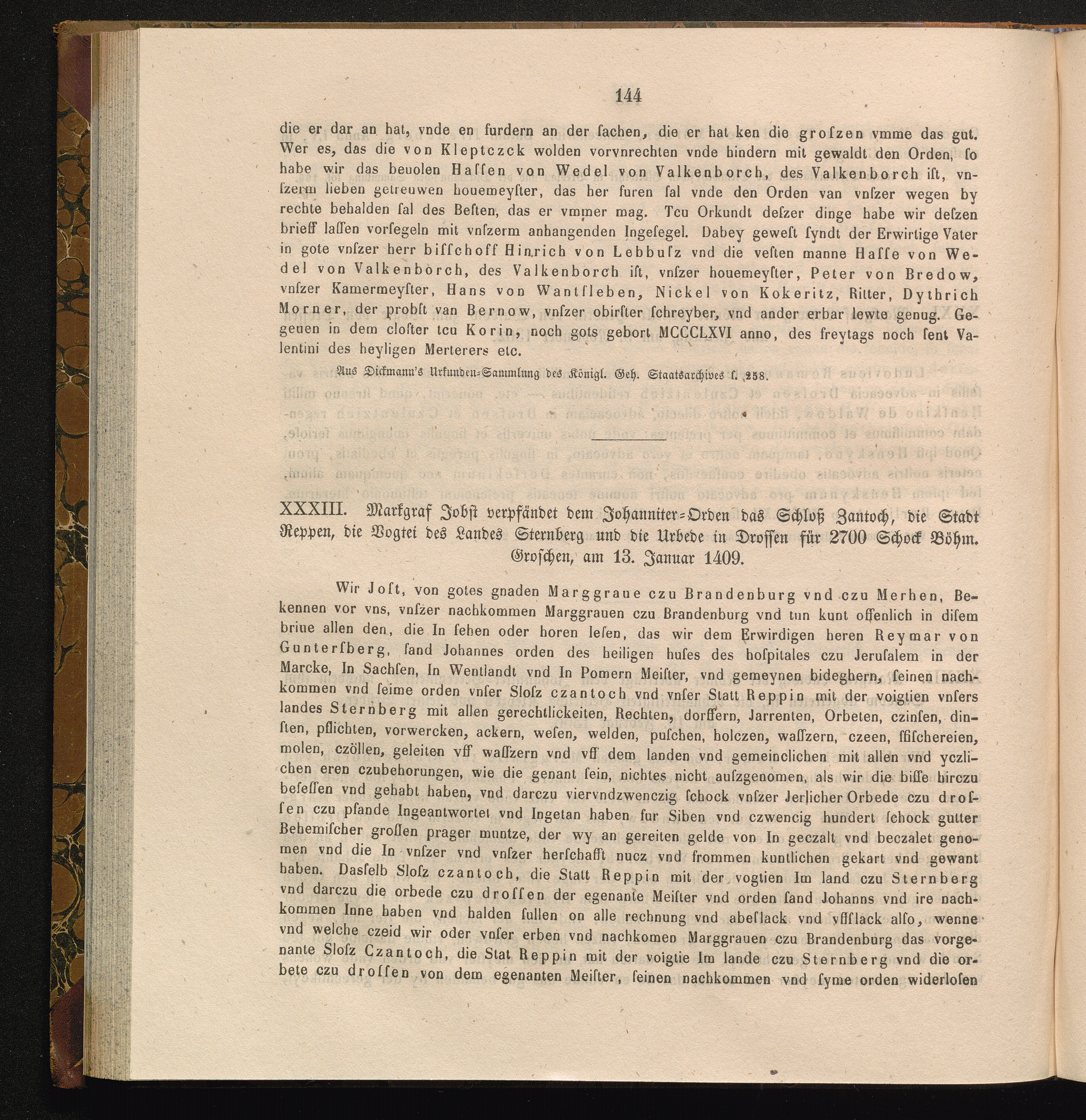 XXXIII. Markgraf Jobst verpfändet dem Johanniter - Orden das Schloß Zantoch, die[...]