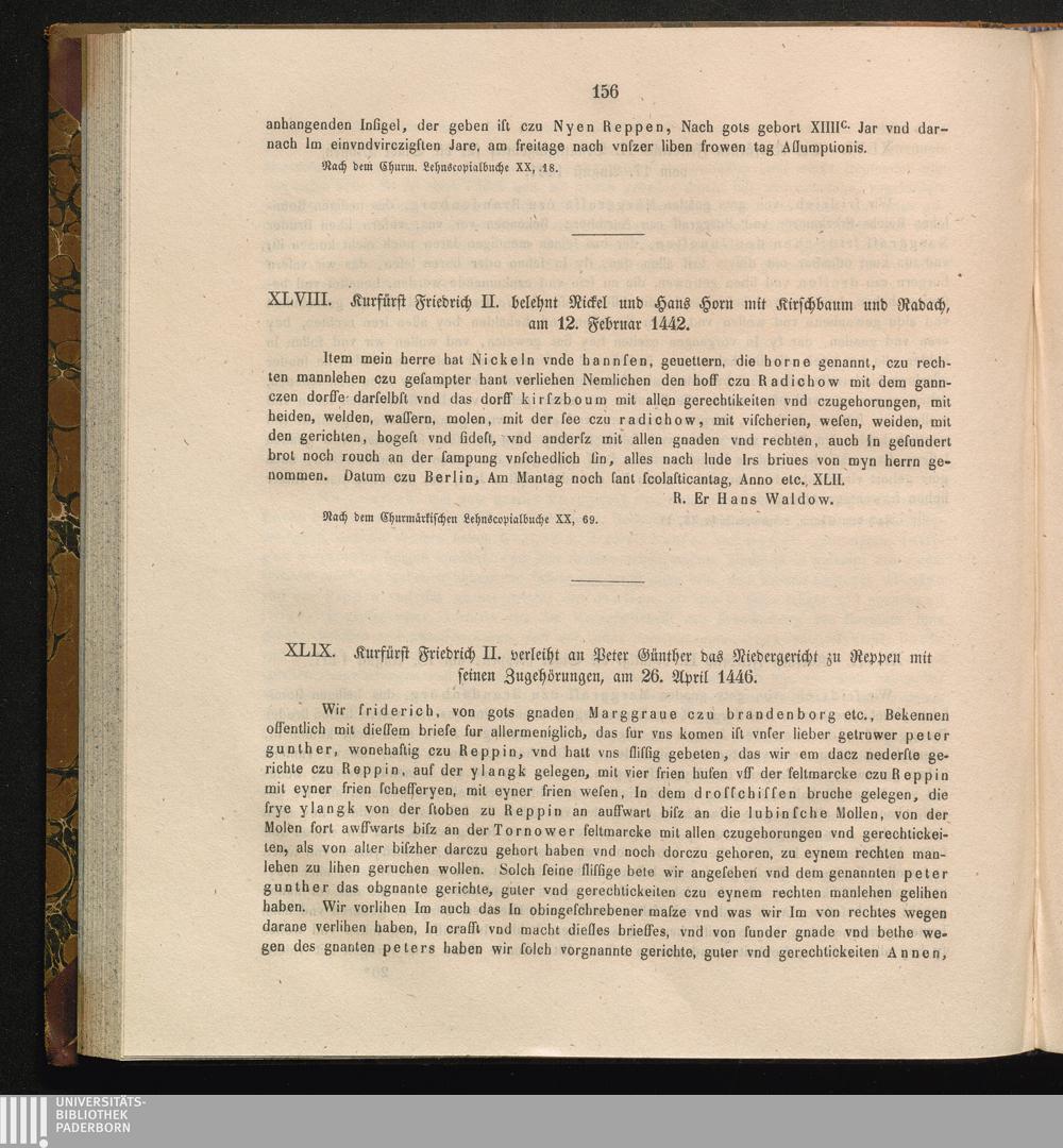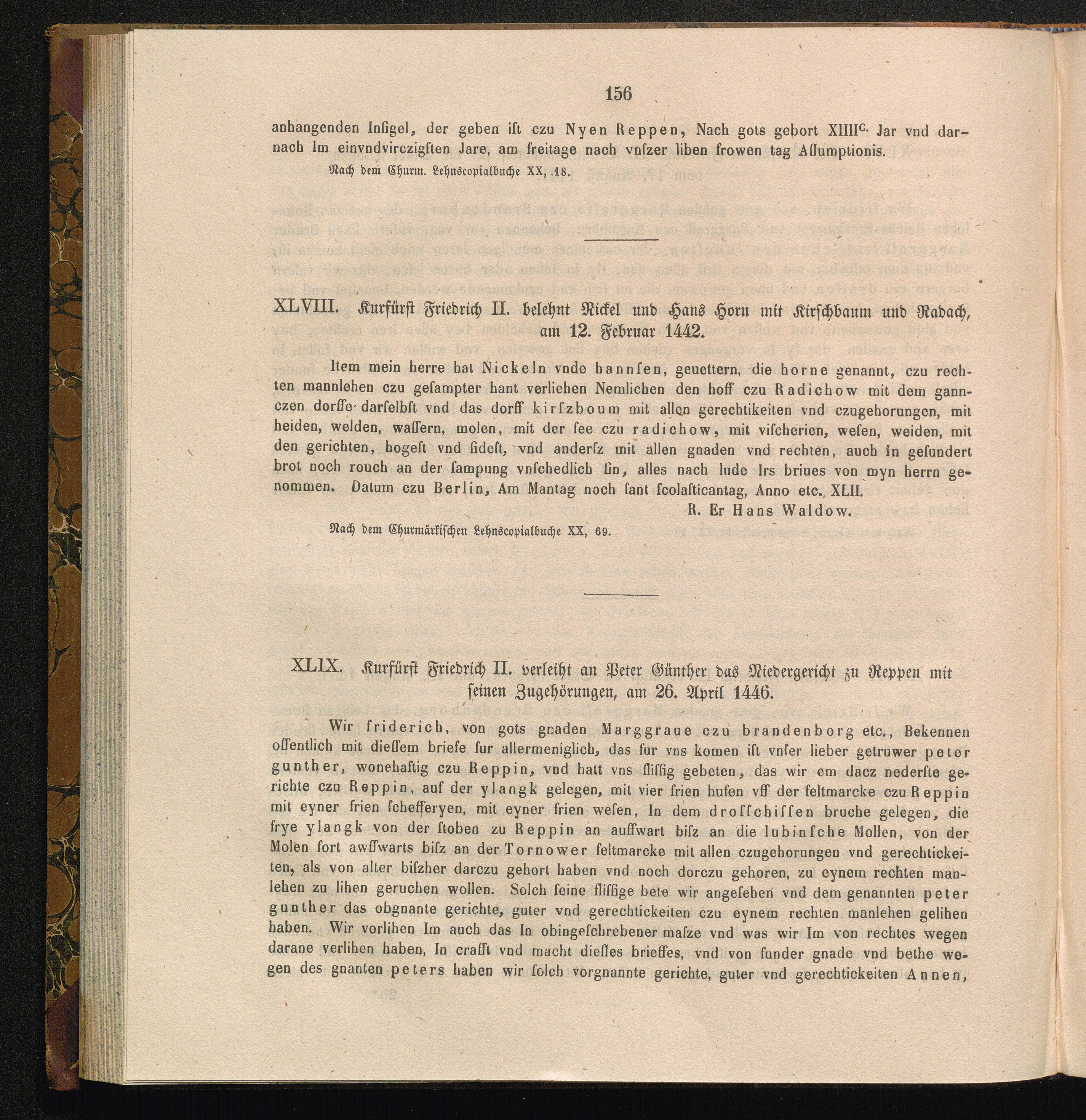 XLVIII. Kurfürst Friedrich II. belehnt Rickel und Hans Horn mit Kirschbaum und Radach,[...]
