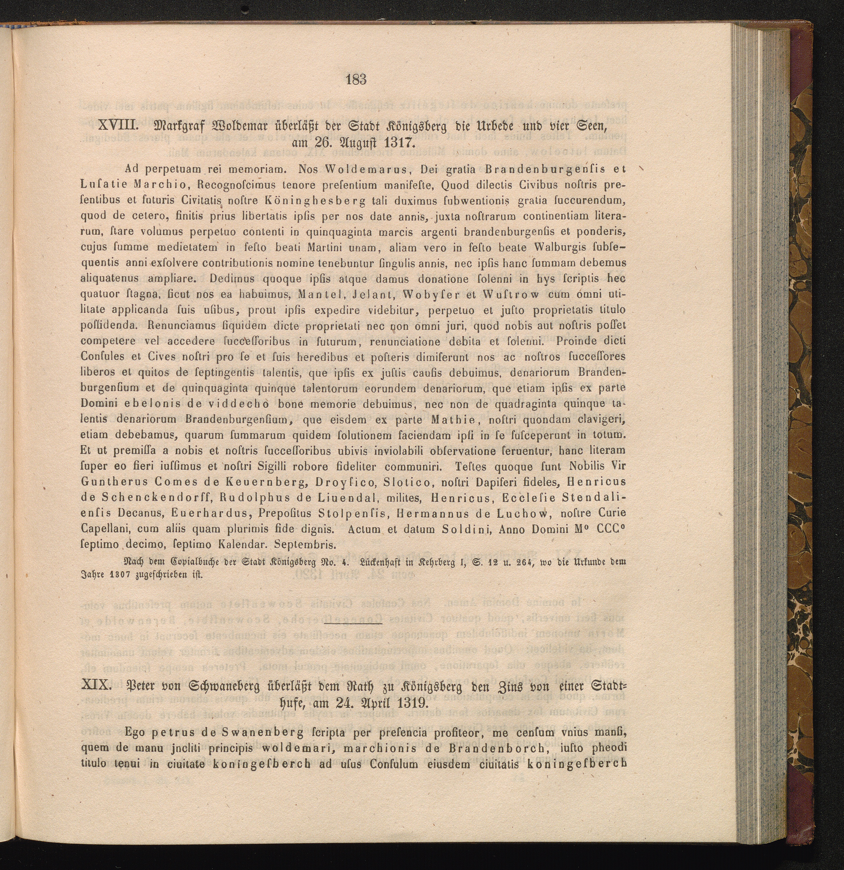 XVIII. Markgraf Woldemar überläßt der Stadt Königsberg die Urbede und vier Seen,[...]